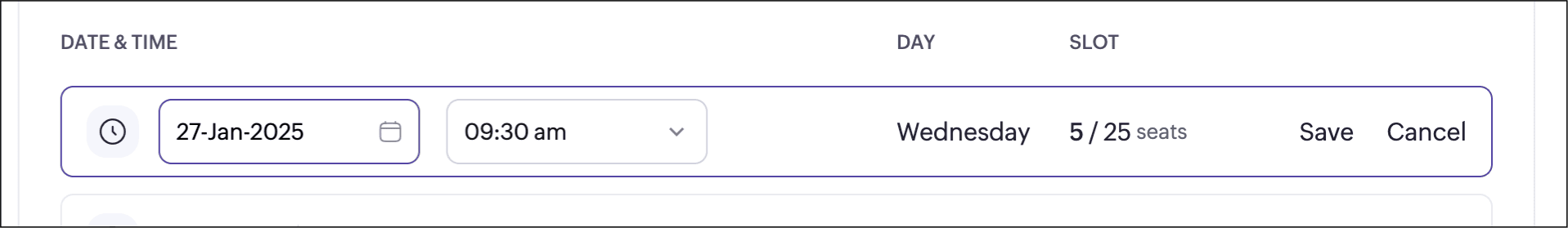 - To reschedule, hover over the required date and click the edit icon. A pop-up appears, where you can select another date and time and click Save.