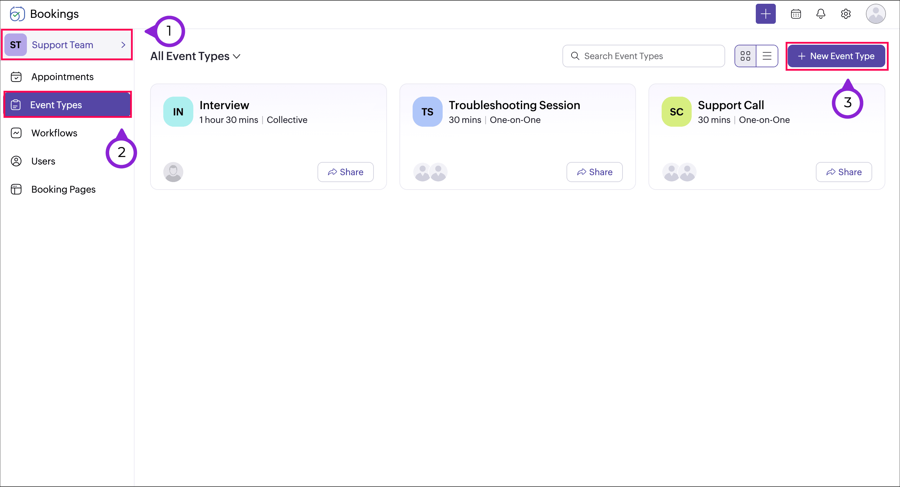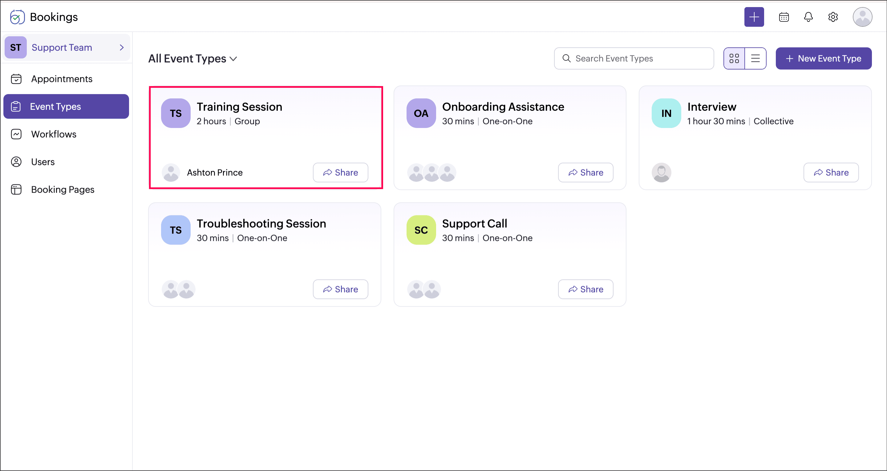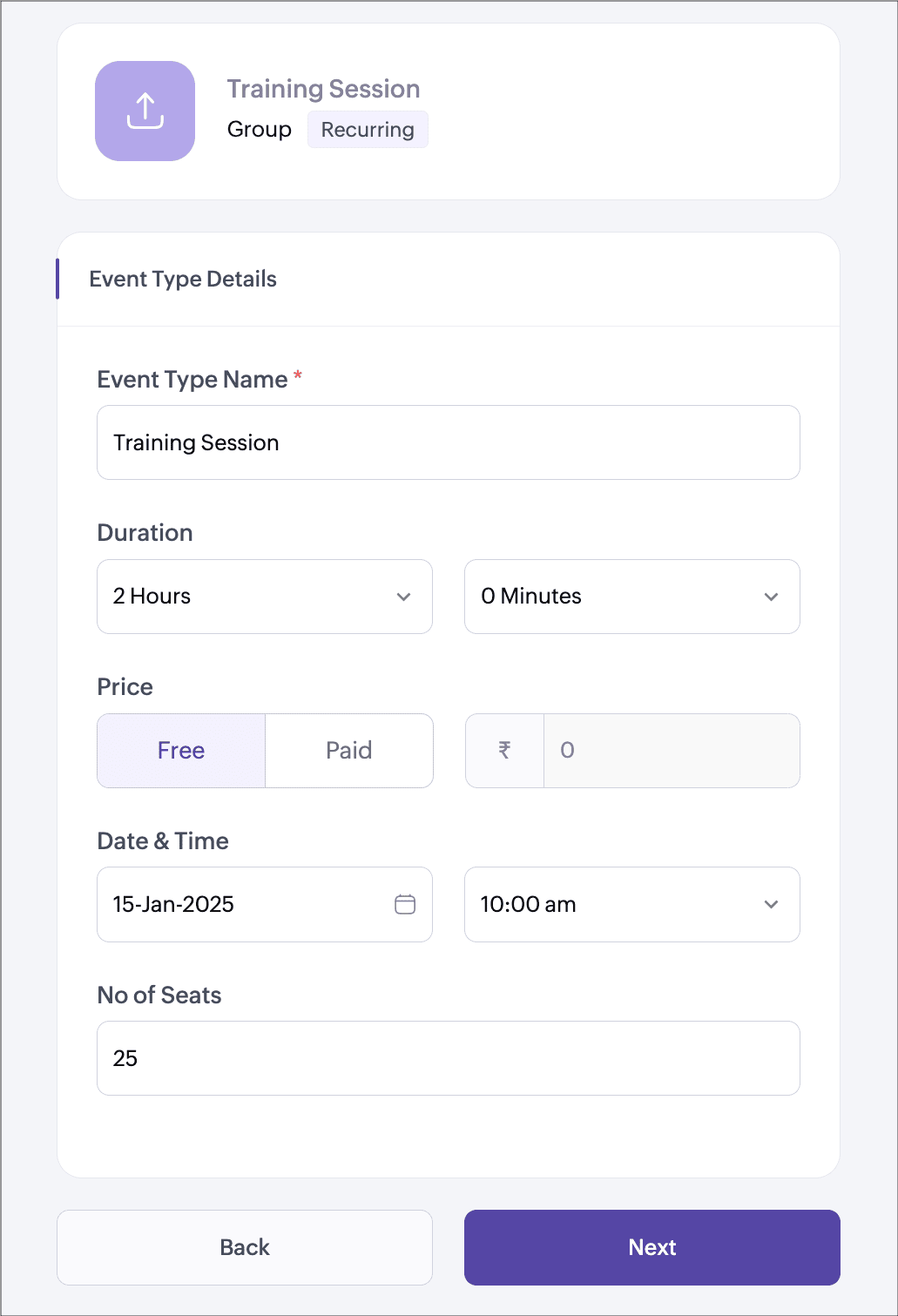 Group event type is suitable for conducting sessions with one user and multiple customers. It lets you set the number of seats and enables customers to book until that limit is reached. It can either occur for a single-day or repeat for multiple days.