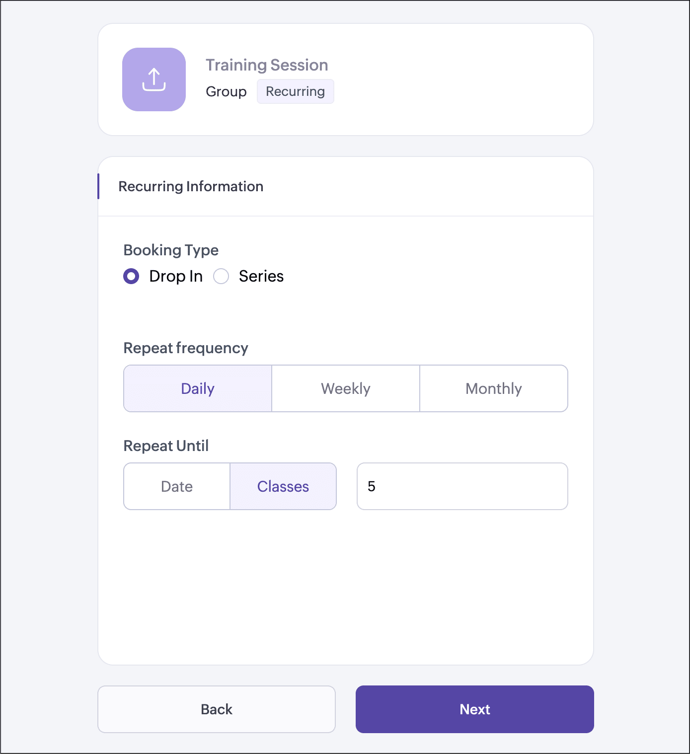 - Recurring drop-in: A group session that repeats in a defined frequency, and each session can be booked independently. eg., a weekend meditation class where participants can book any session individually.
