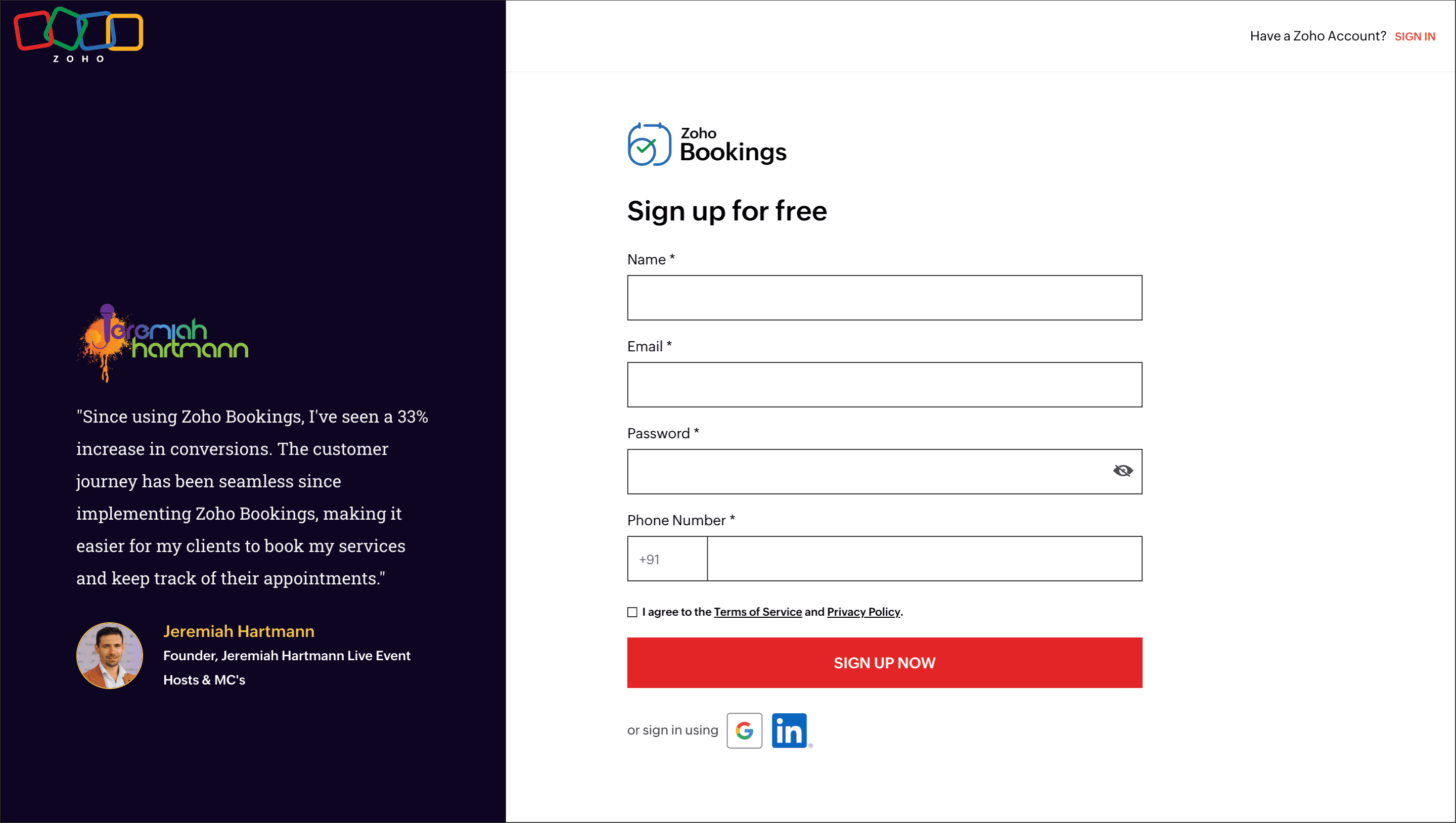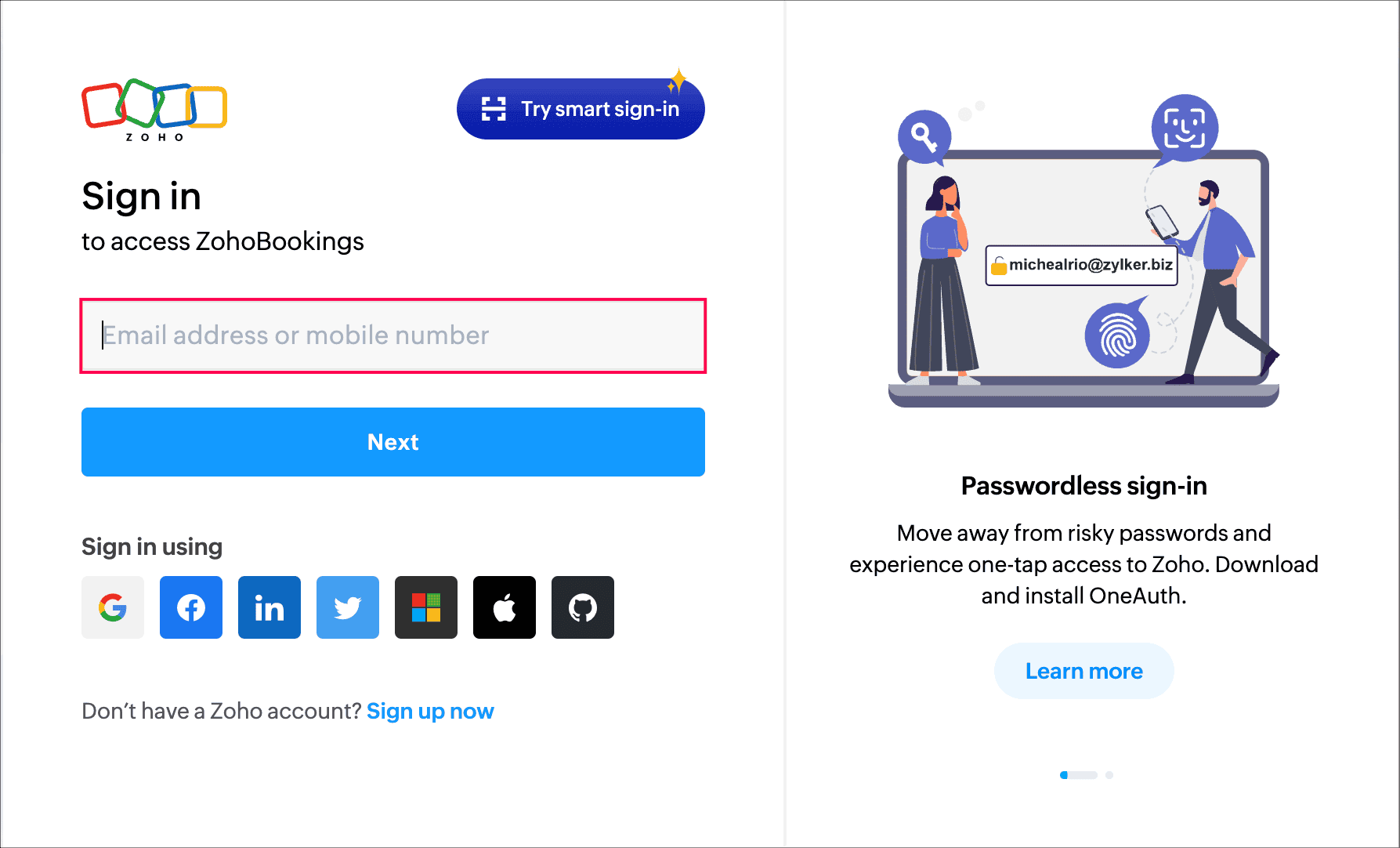 You can sign in/sign up to create a Zoho Bookings account. This creates an organization and designates you as the super admin. While onboarding, you need to set up basic information for your organization. After onboarding, you can invite other users to join your Bookings org.