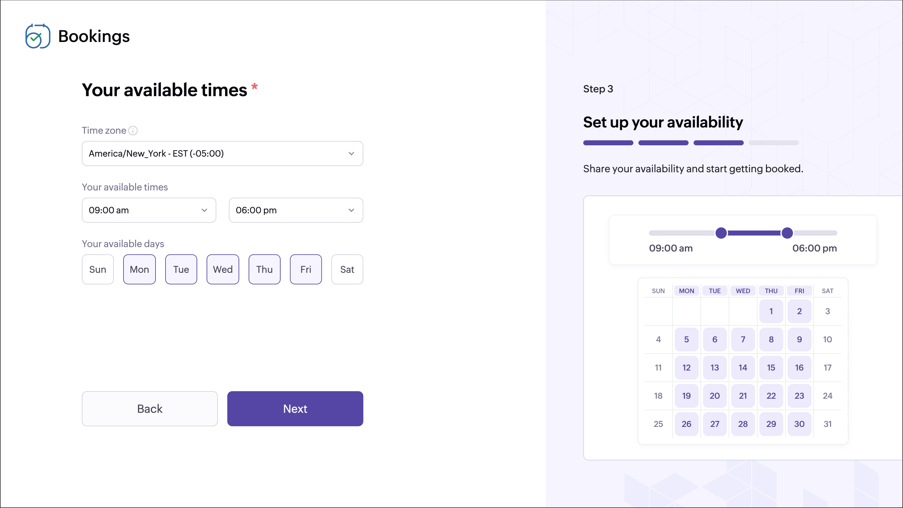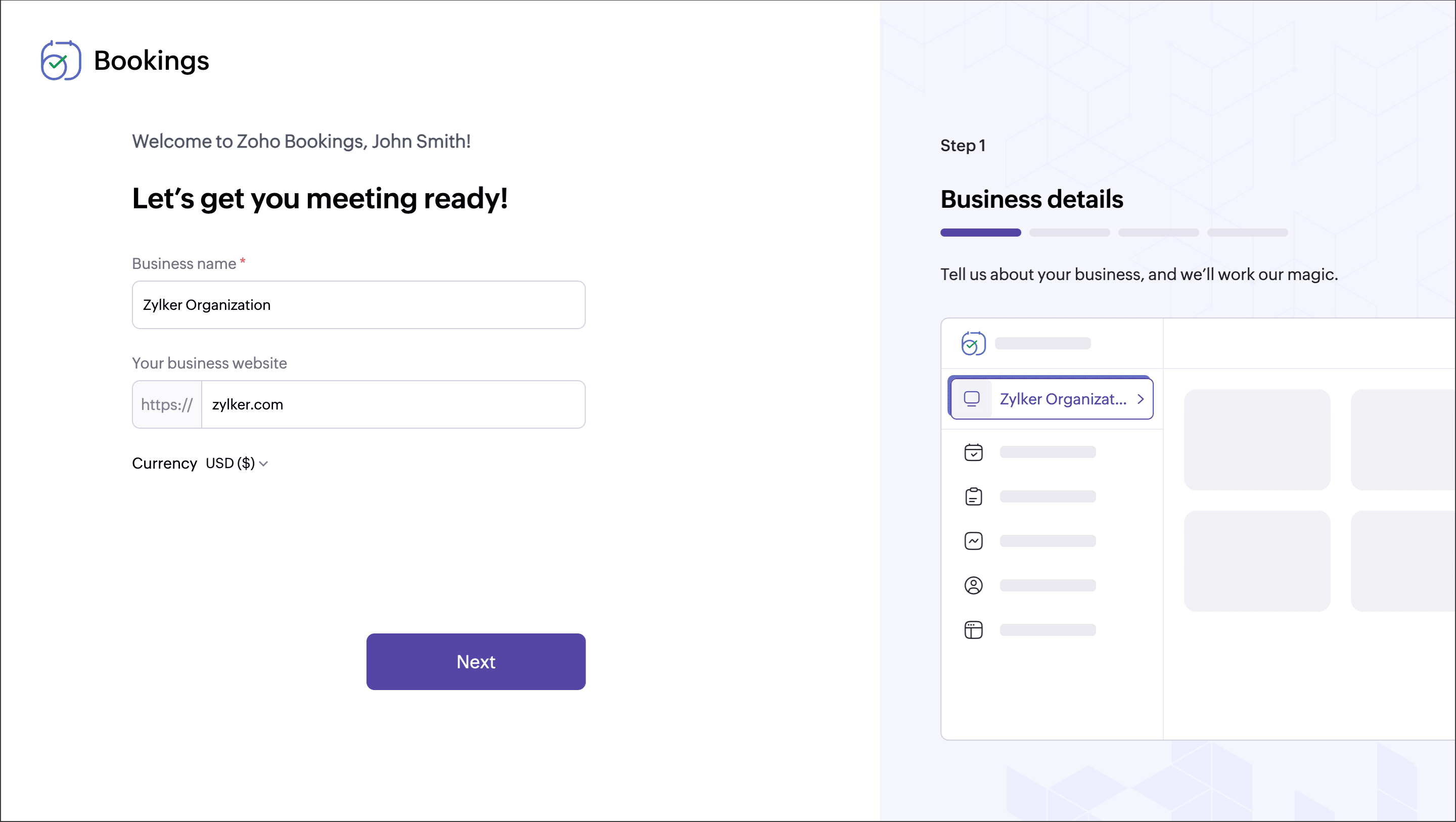 After you sign up/sign in to Zoho Bookings, you'll be asked to provide details about your business, such as business timings and your availability, before you start. This is an initial onboarding setup process that gets your account up and running. This information can be edited, and further details can be added at any time.