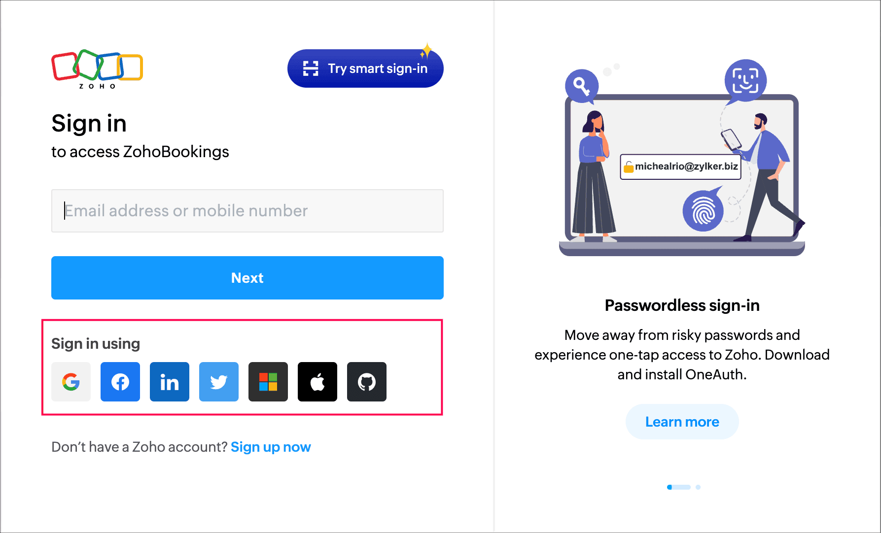 1. Sign in using Zoho account: If you already have an account with Zoho, proceed to sign in.