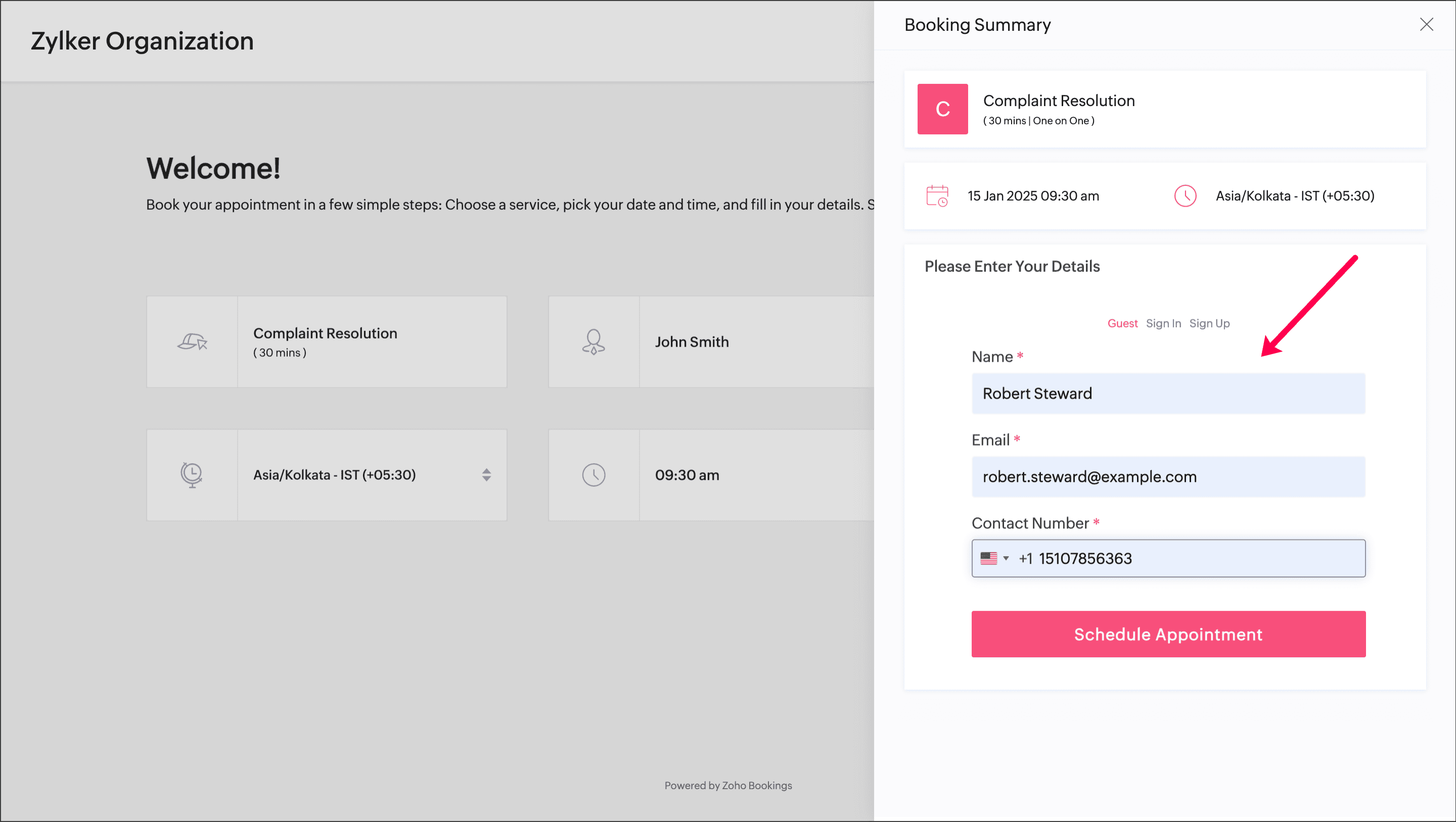 2. Fill sample customer details in the booking form that helps capture information about your customers. Click Schedule Appointment.
