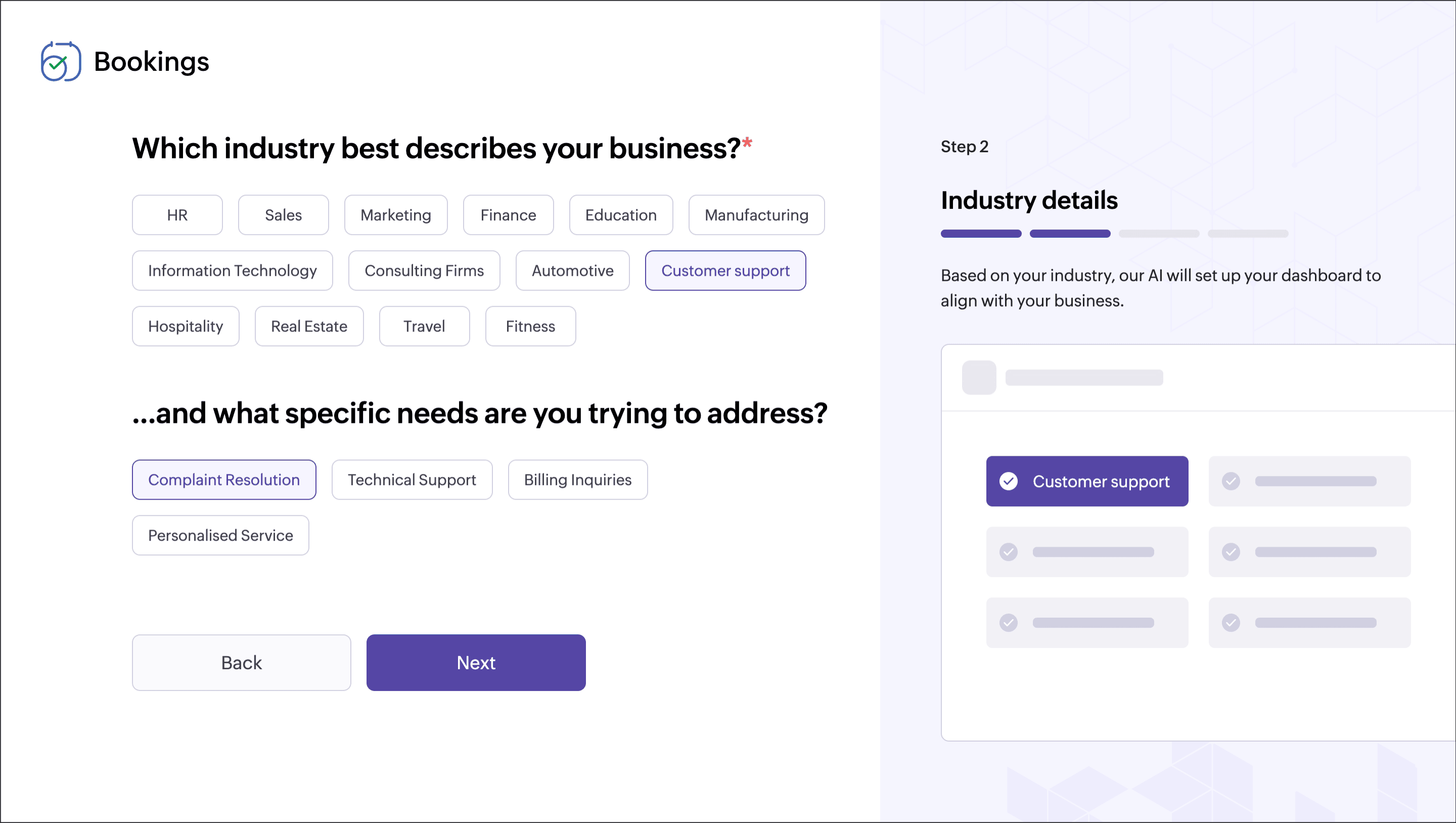 2. Choose your industry and the type of meetings you would be using Zoho Bookings for. Click Next.