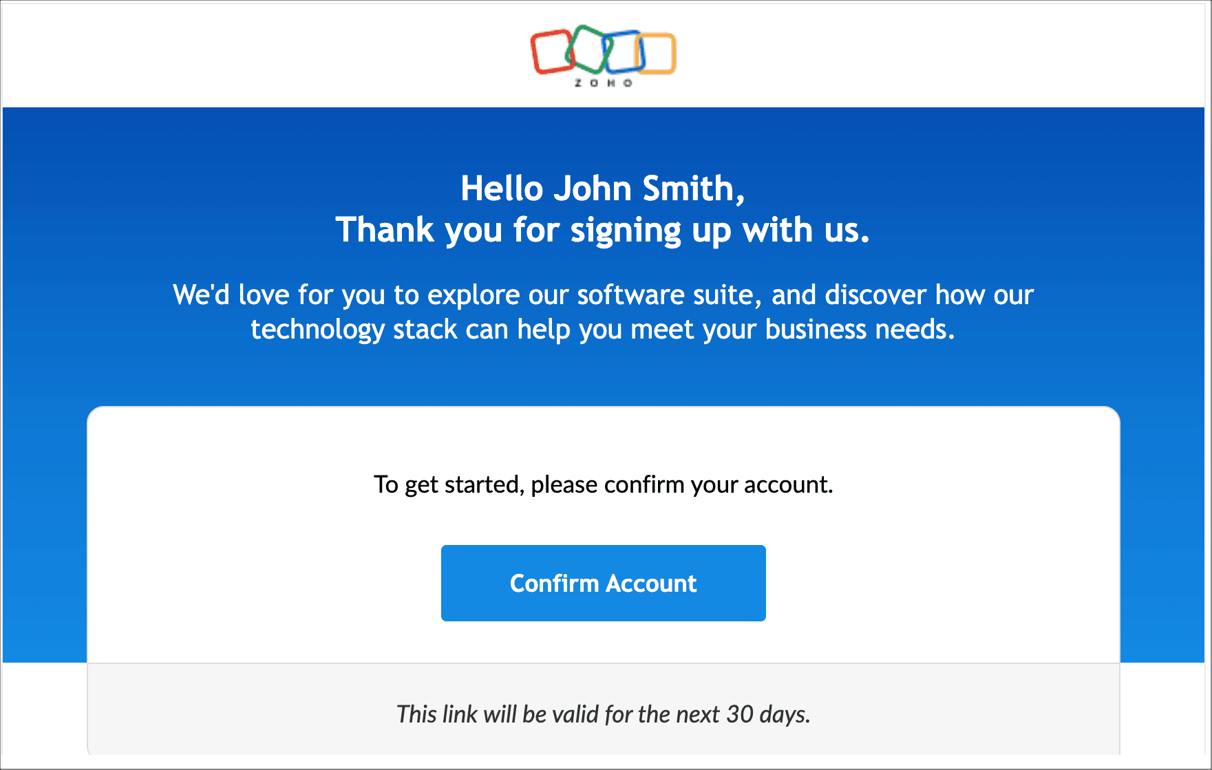 A confirmation email will be sent to the specified email address for email verification. Click Confirm Account.