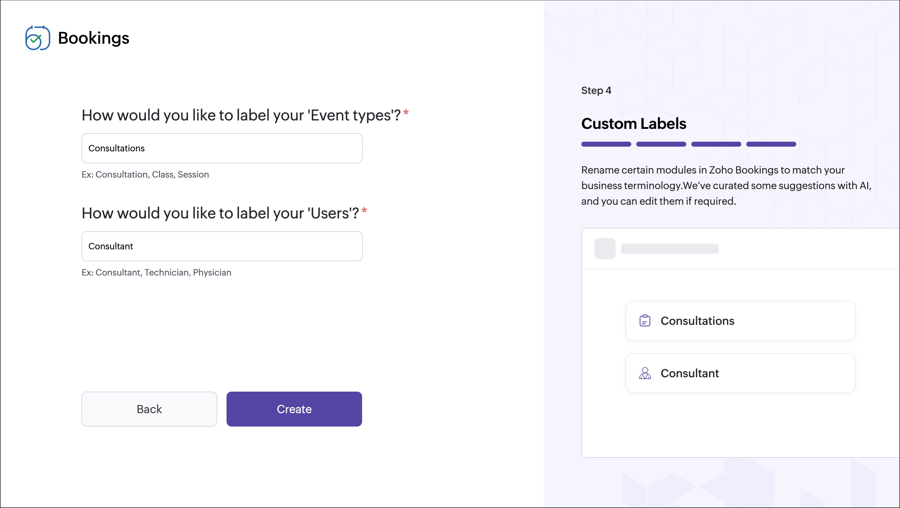 1. Under How would you like to label your 'Event types'?, you can enter the term that is used in your industry to denote meetings types, such as Consultations, Events, or Meetings.