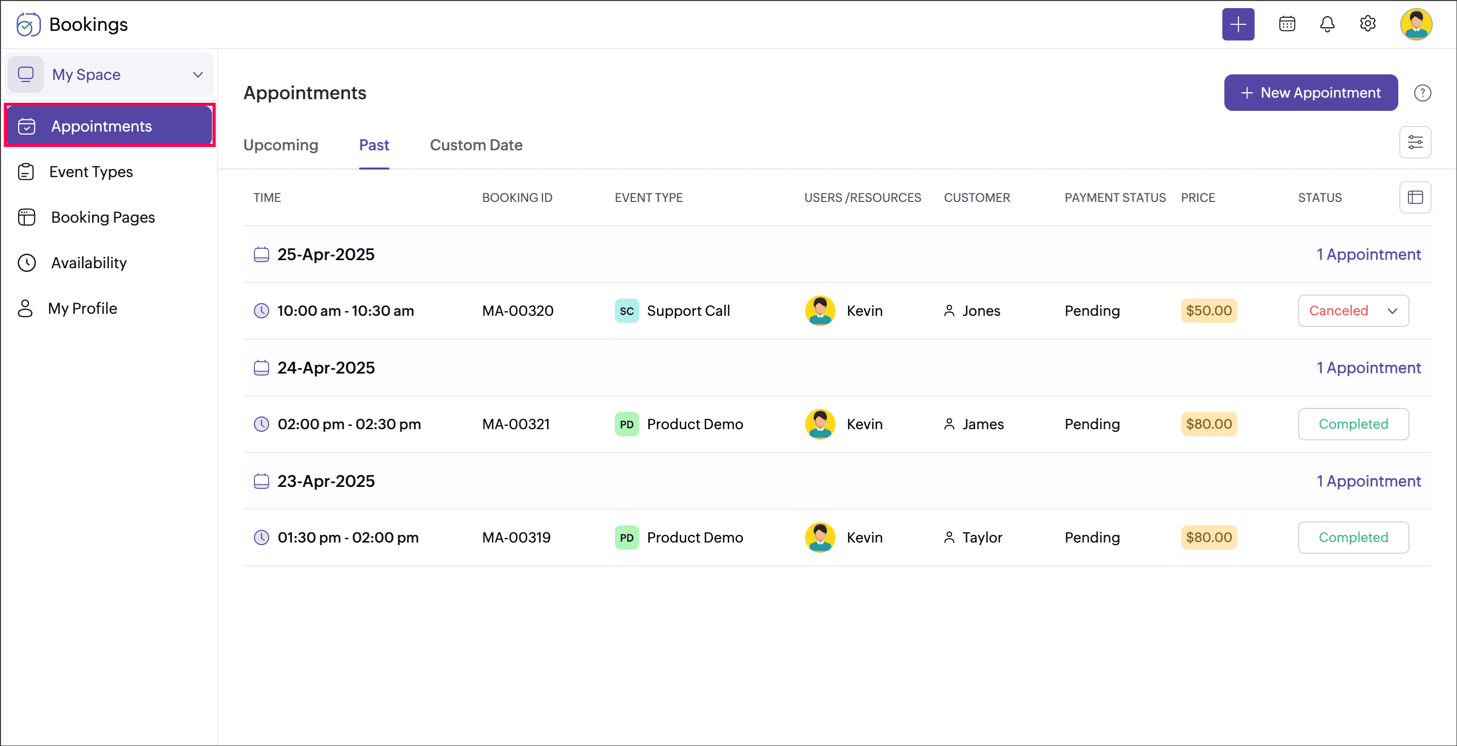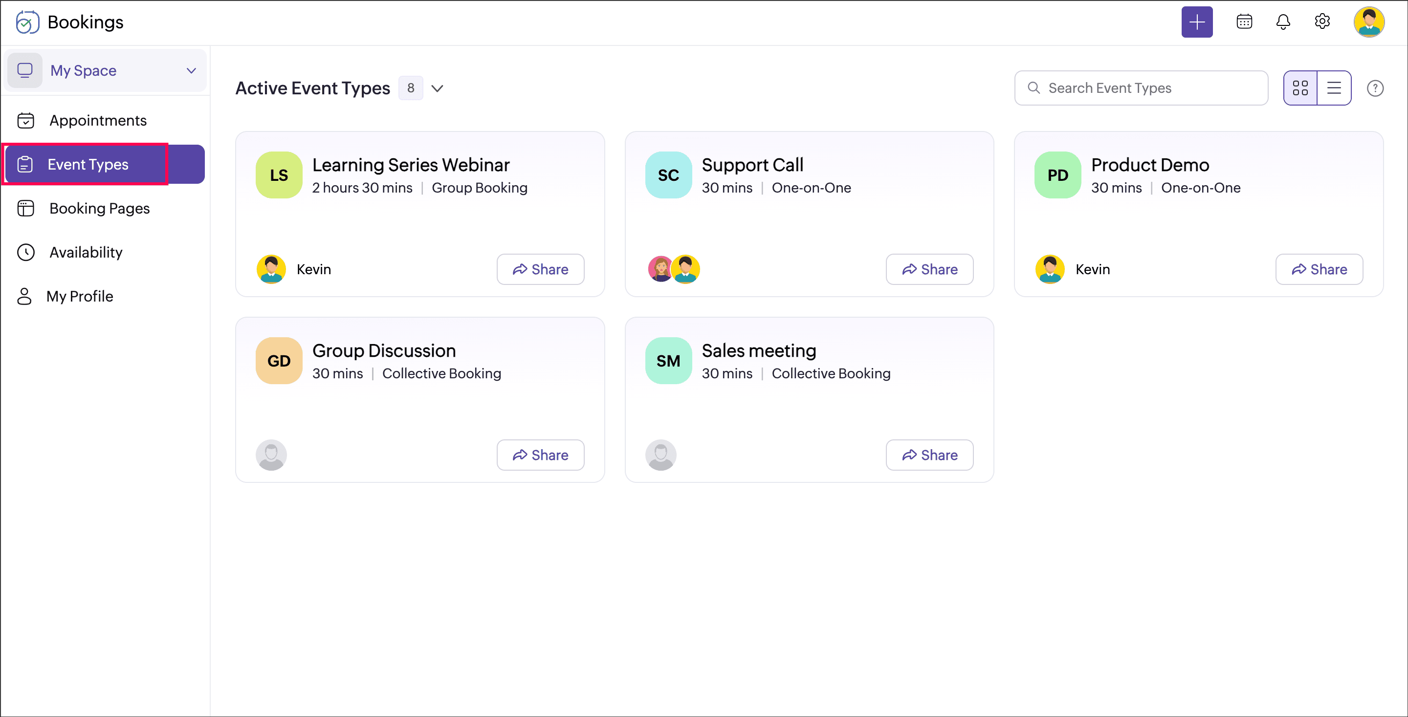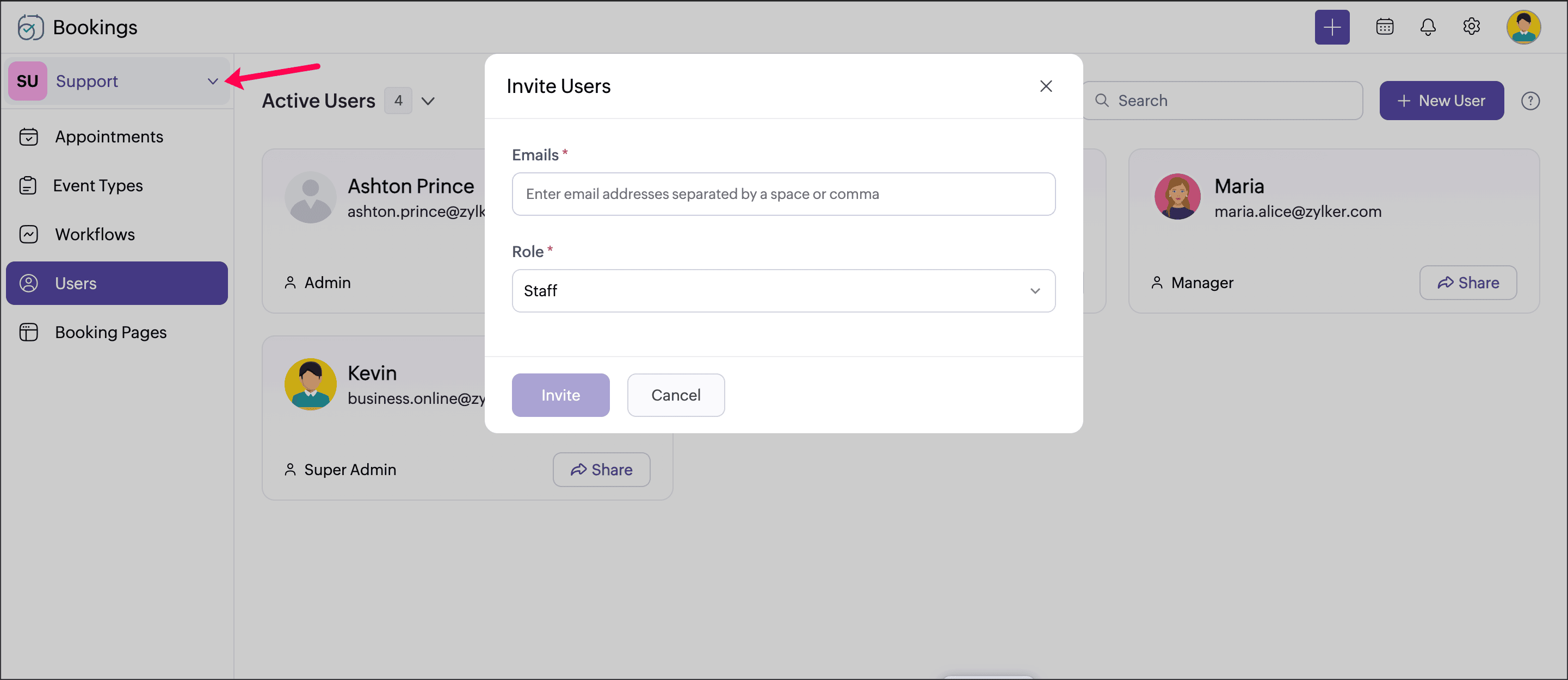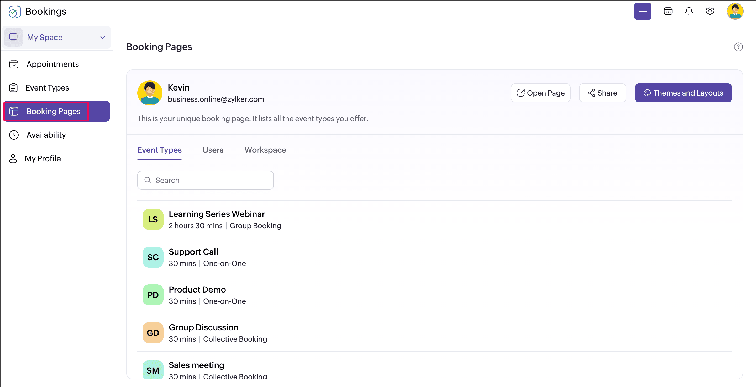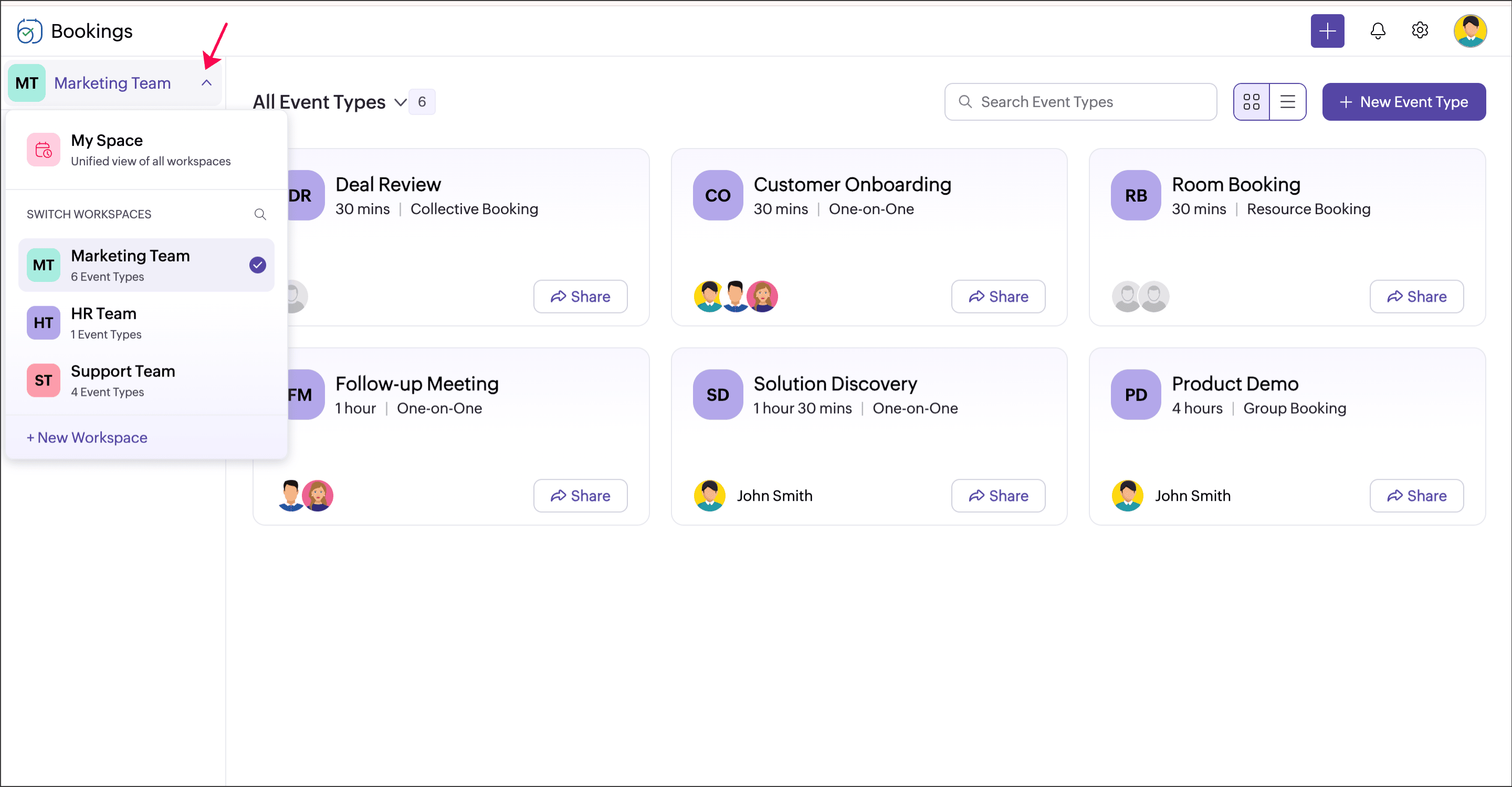You can click the workspace name and switch to the required workspace. Appointments, Event types (previously Services), Users (previously Staff), and Booking Pages belonging to the selected workspace can be viewed here.