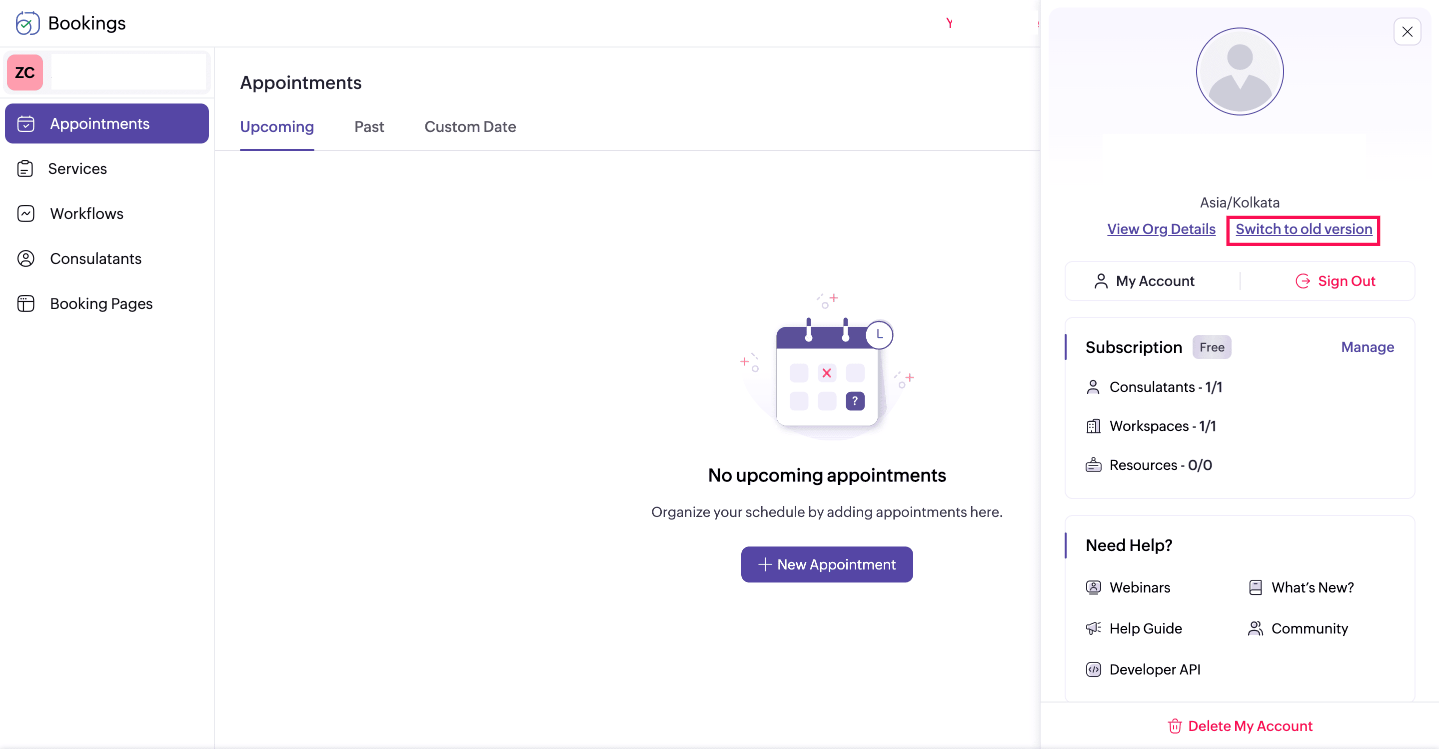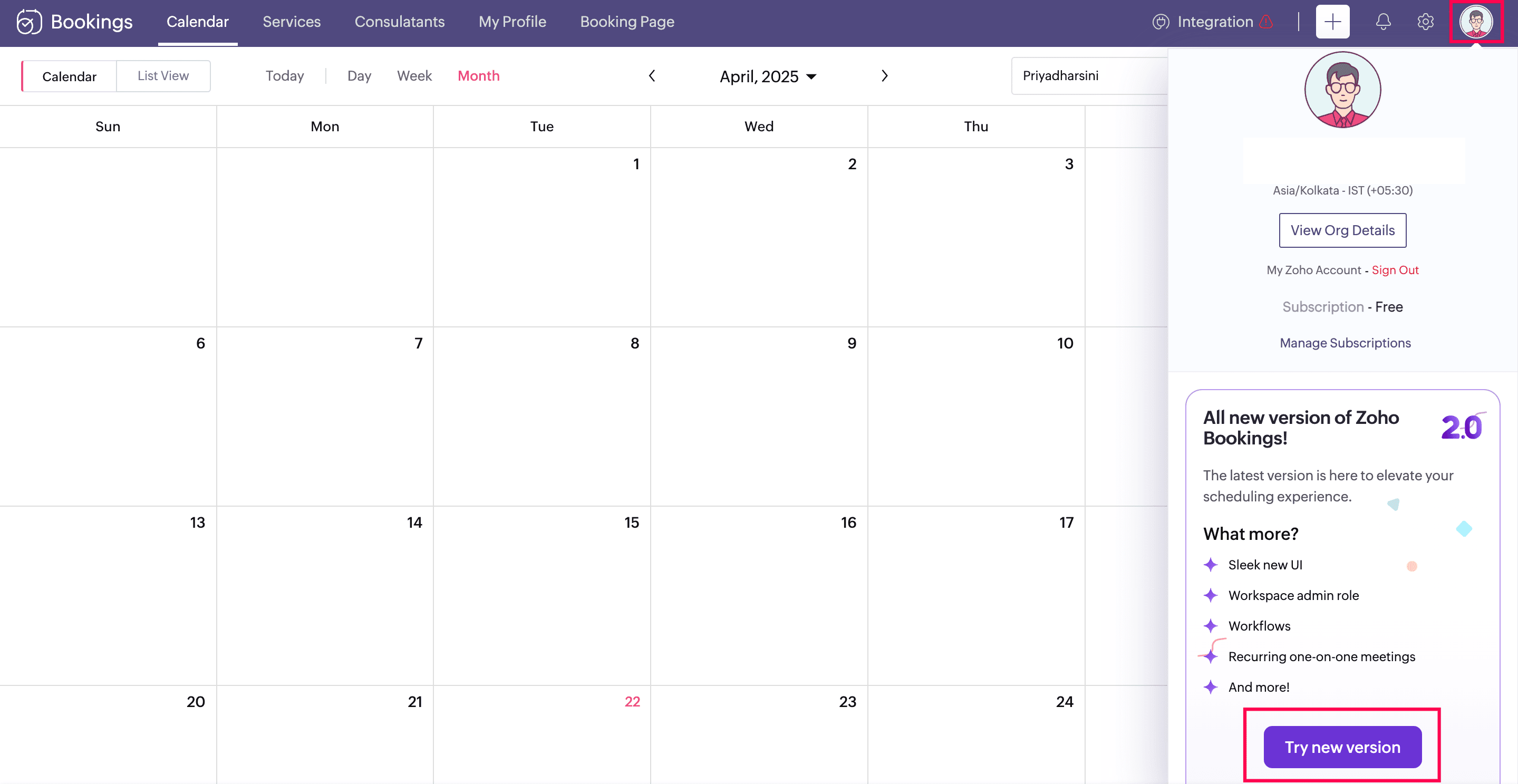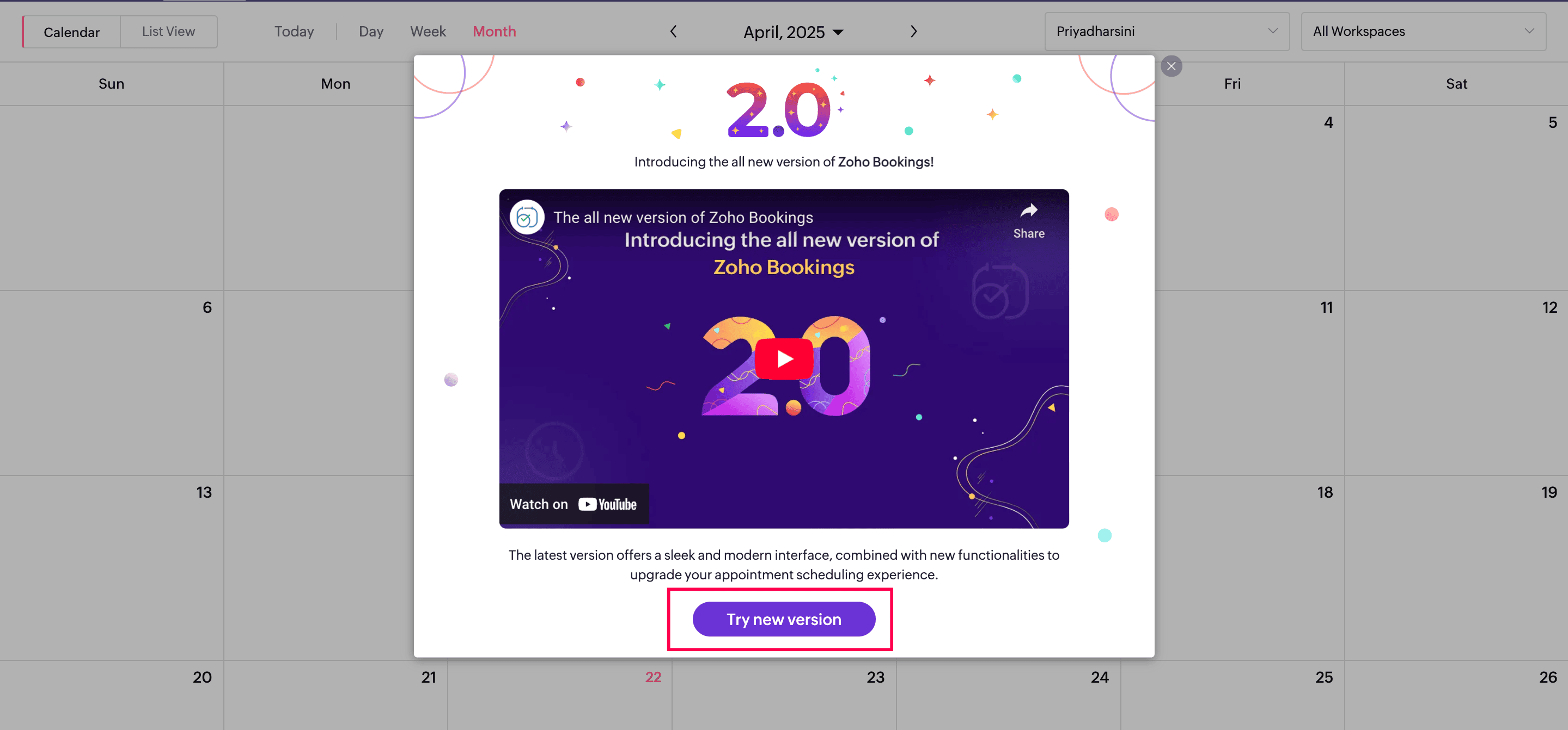 - Click the Try New Version button in the pop-up. You'll be redirected to the upgraded Zoho Bookings experience instantly.