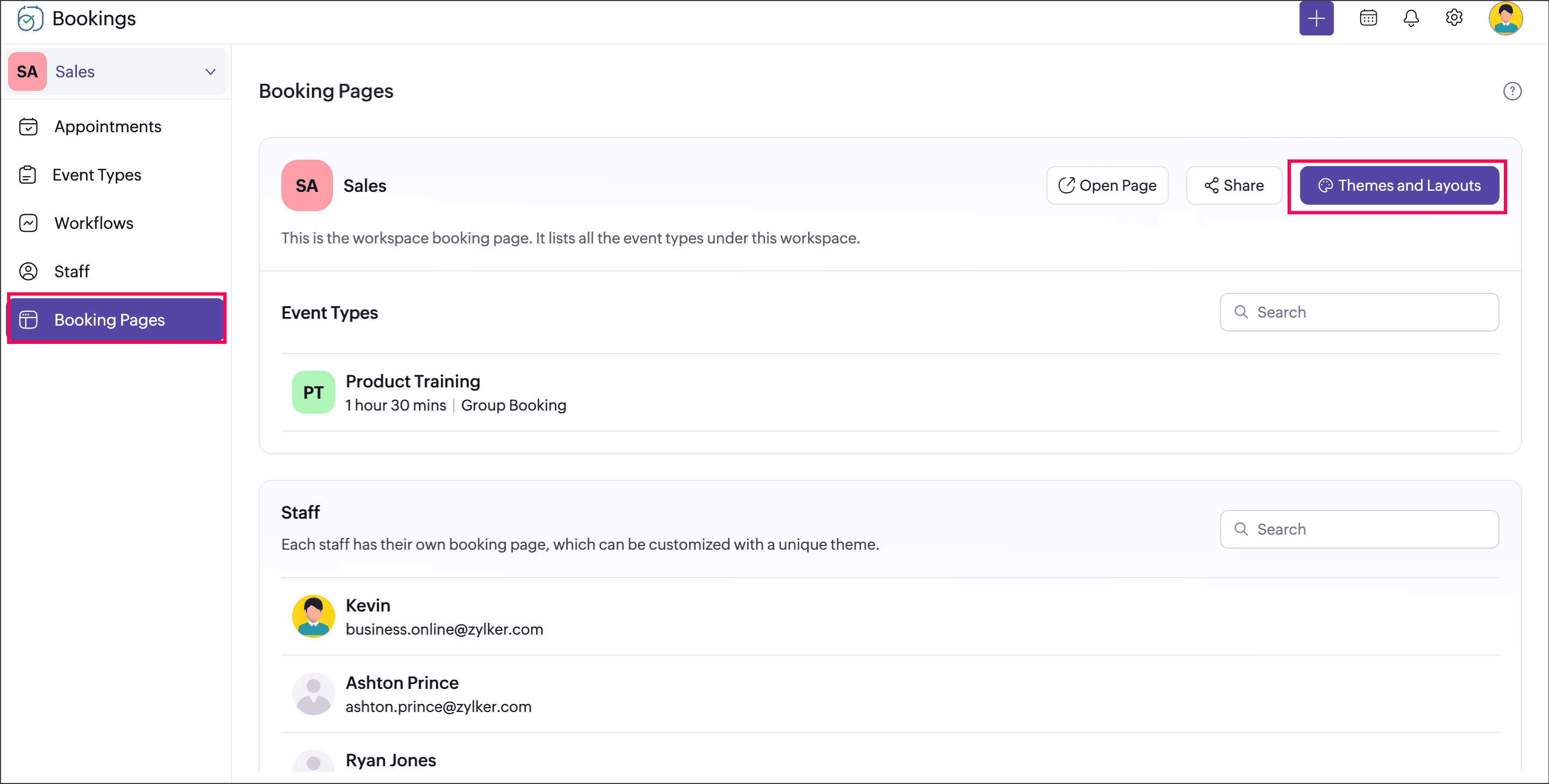 Previously, you could view all workspaces in your Bookings account simultaneously. Now, we are shifting to a workspace-centric view. It means you can choose a workspace, and Bookings will show the appointments, event types, and booking pages that belong to the selected workspace. You (all users except the Staff role) can switch workspaces to view appointments of the respective workspaces. This allows you to organize and manage Bookings, segregated by departments or categories.