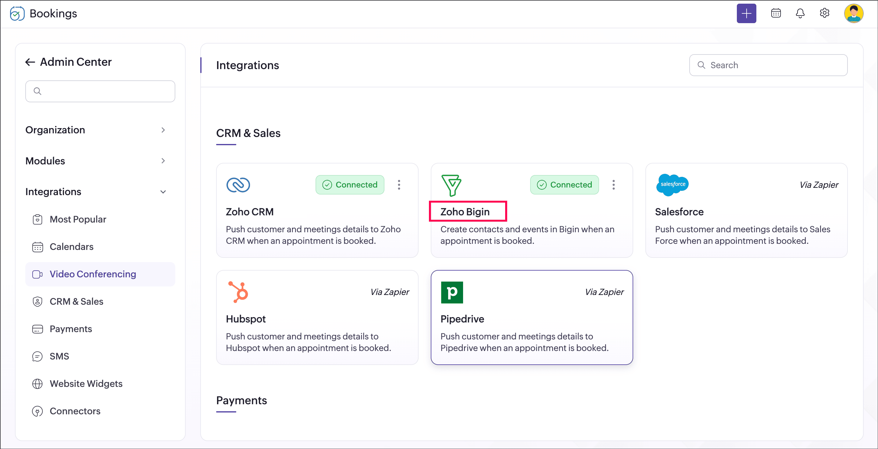 You can now integrate your Bookings account with Bigin. This integration automatically creates a new contact in Bigin when an appointment is booked in Bookings. It also updates the existing contacts. Available slots are checked for conflicts in Bigin events, and this integration also allows you to add your appointments to Bigin events. Learn about this integration in detail here.