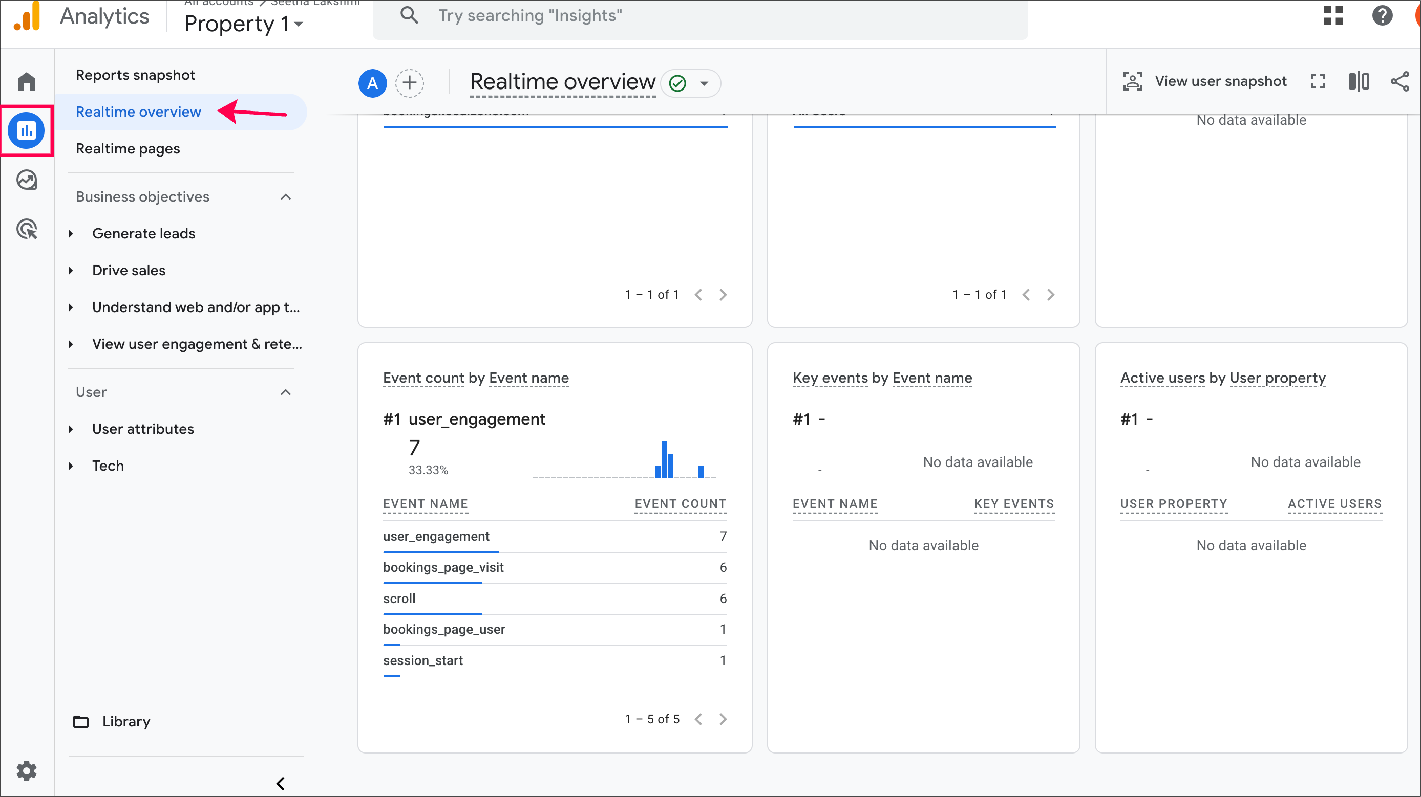 In Google Analytics 4 (GA4), the events from Zoho Bookings will be logged under Reports → Realtime Overview