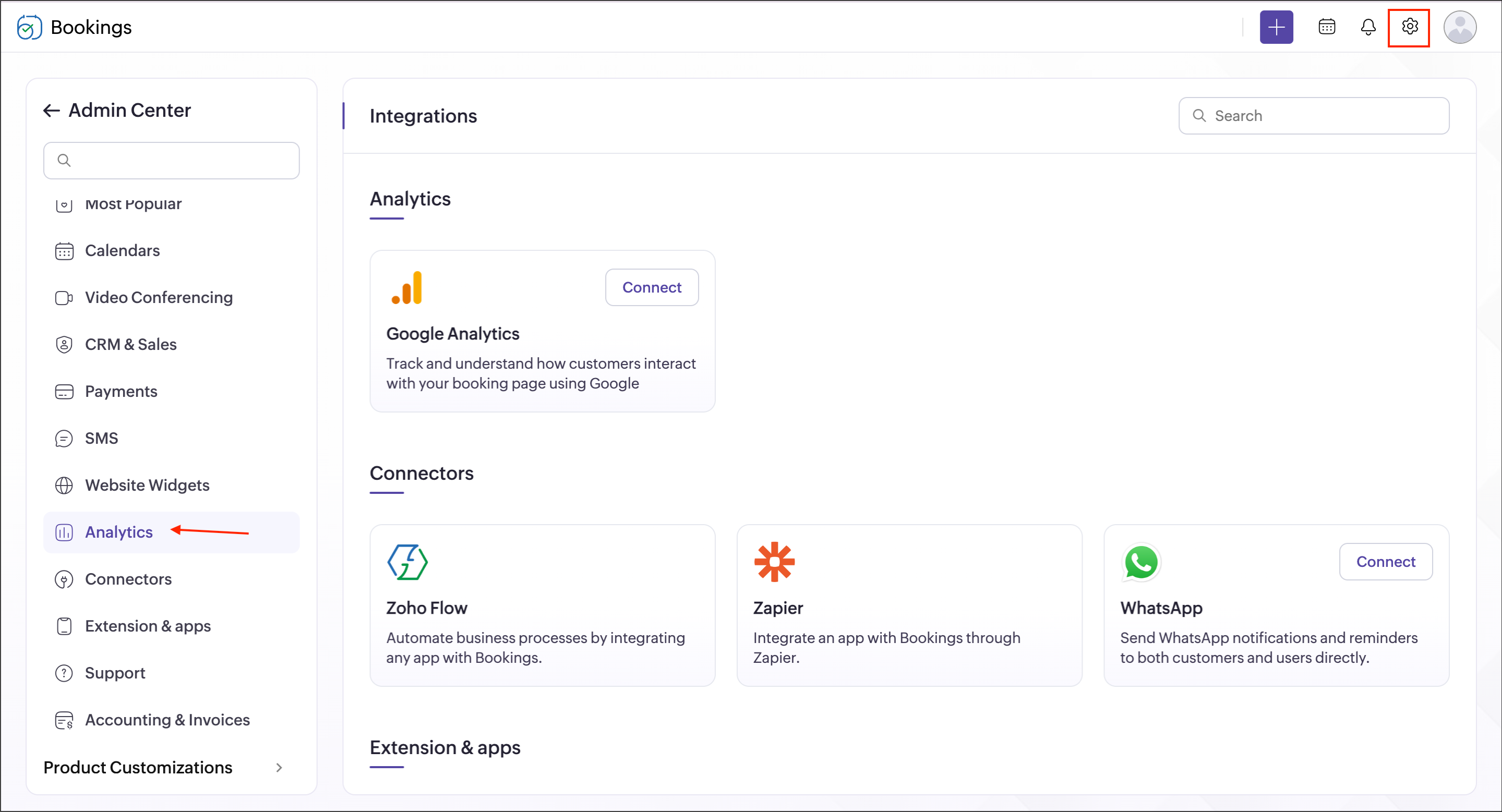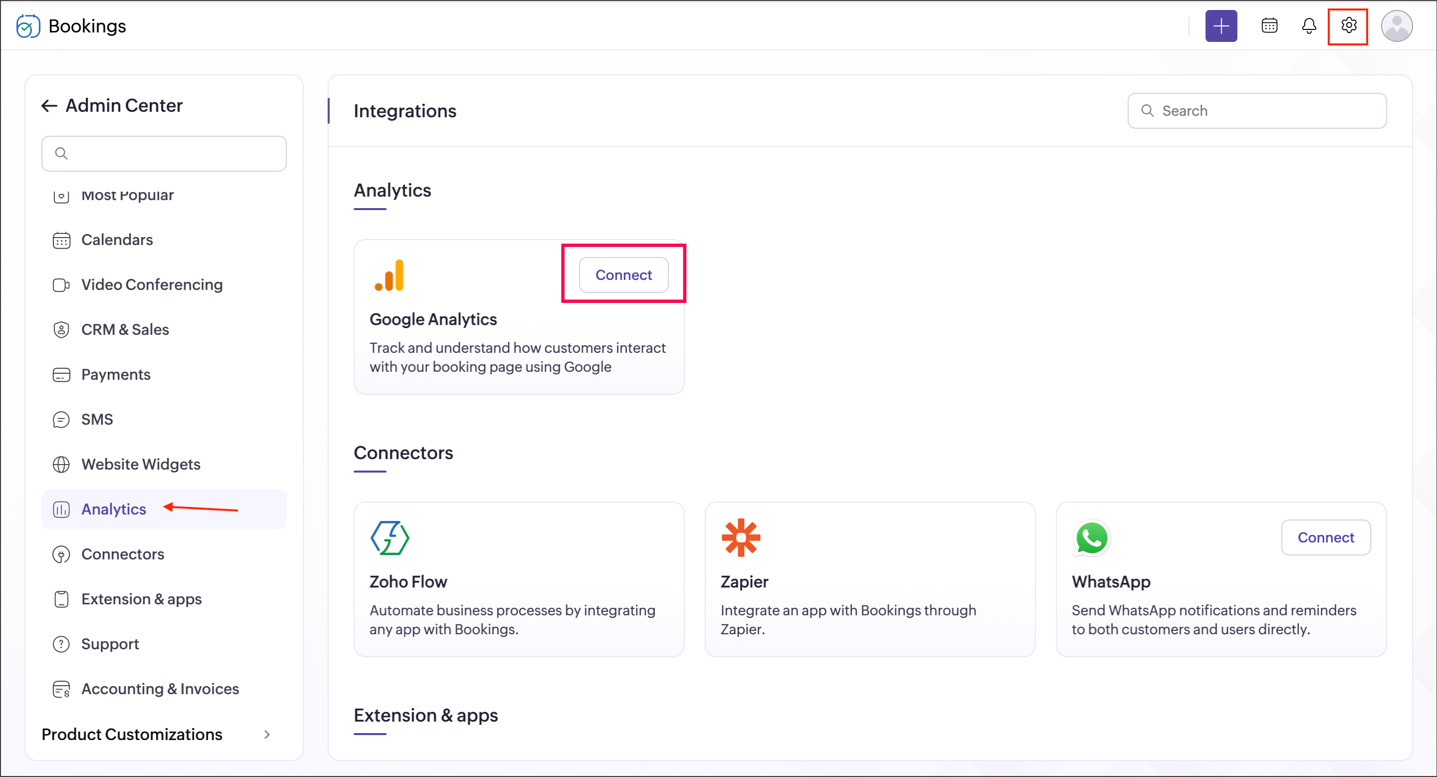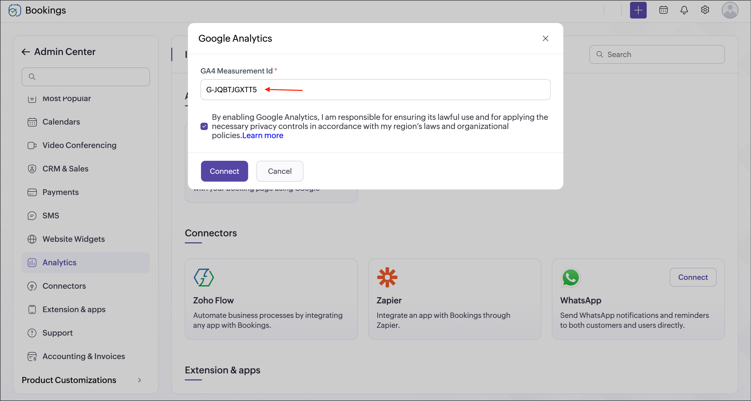 In Zoho Bookings, integrating with Google Analytics helps you track how customers interact with your booking pages. To enable this, you’ll need to connect your Google Analytics account using a GA4 Measurement ID, which is a unique identifier that links your website data to your Google Analytics property. Once connected, you can: