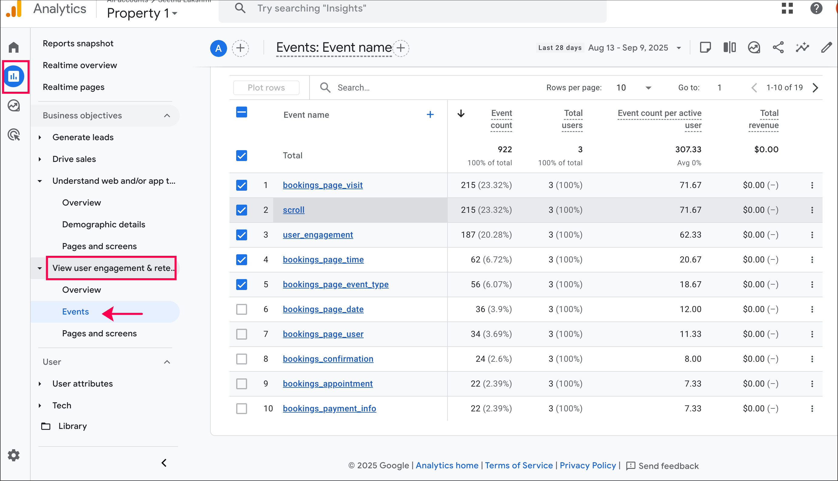 Once connected, Zoho Bookings automatically sends booking events to your Google Analytics 4 (GA4) account. GA4 then tracks user actions on your booking pages, such as visits, views, and completed bookings, helping you analyze engagement and improve conversion rates.