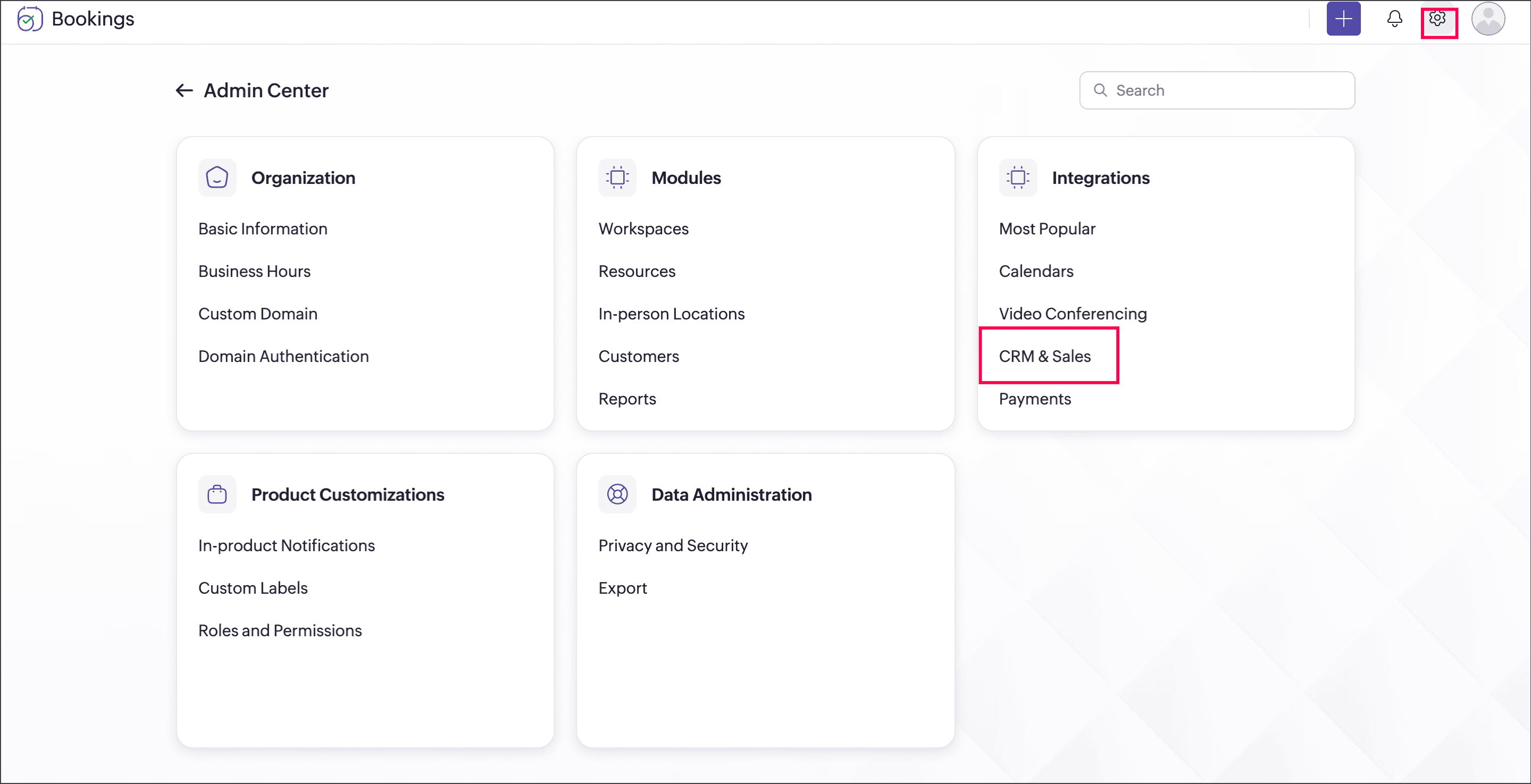 in the top-right side of the Bookings menu bar and select CRM & Sales.