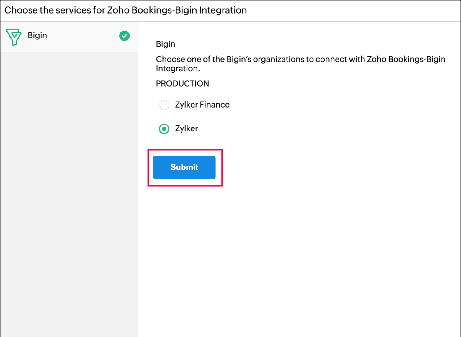 Once an admin sets up the integration, the users can connect their Bigin account to Bookings. To connect, the Bookings users have to be an user in Bigin. Steps: