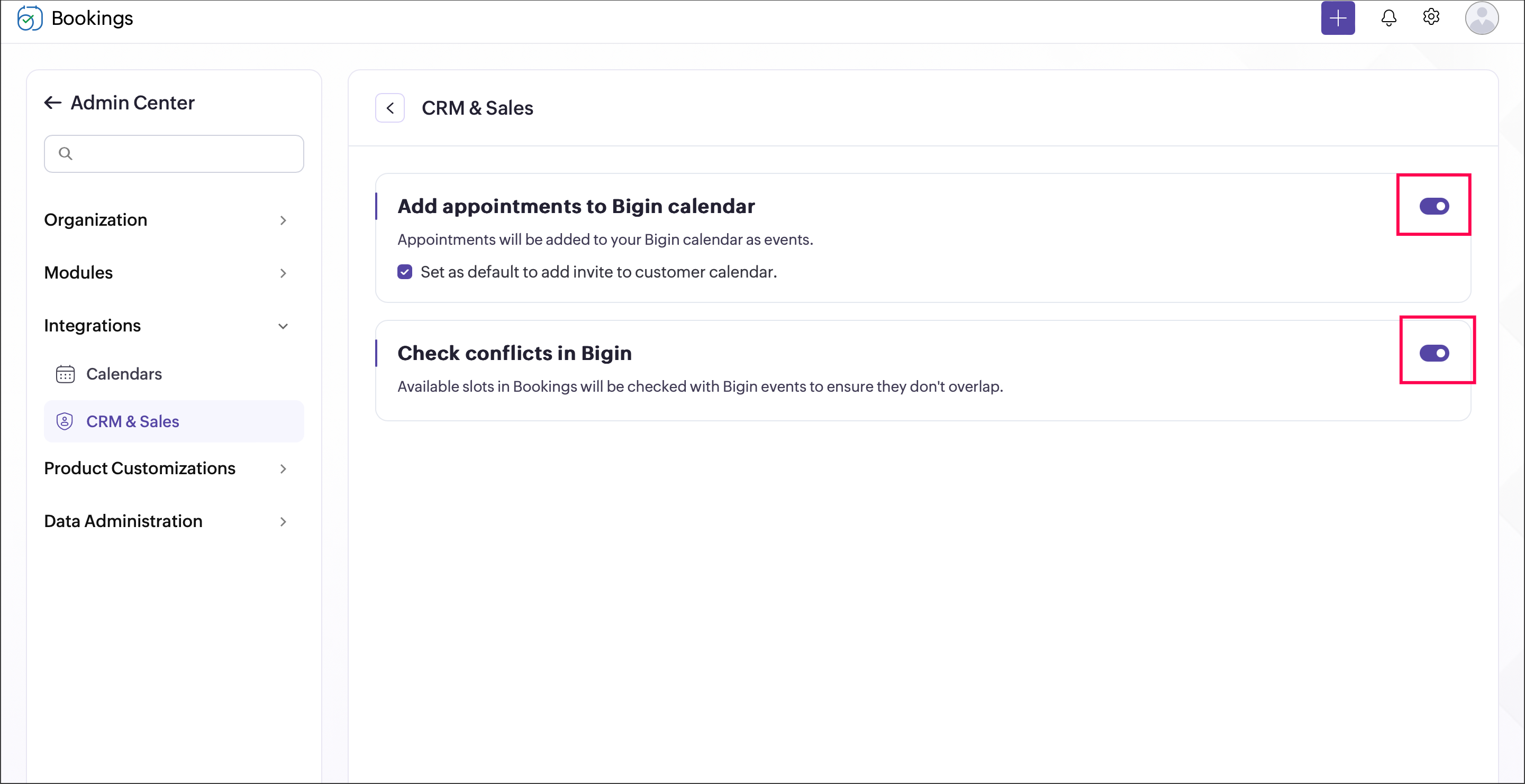 Enable the Add Bookings event to my Bigin calendar toggle to add appointments booked in Bookings as events in Bigin. Disable it not to add events in Bigin.