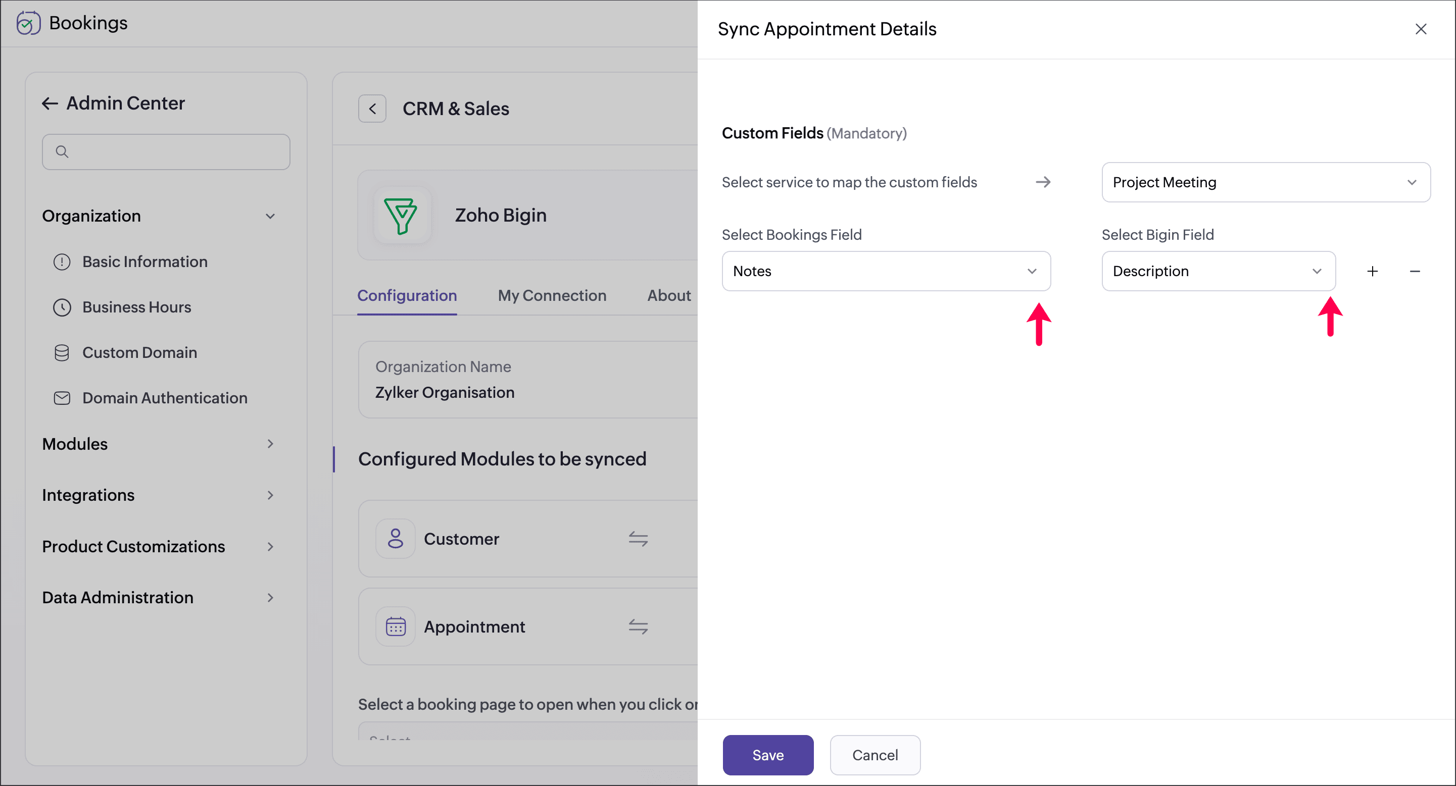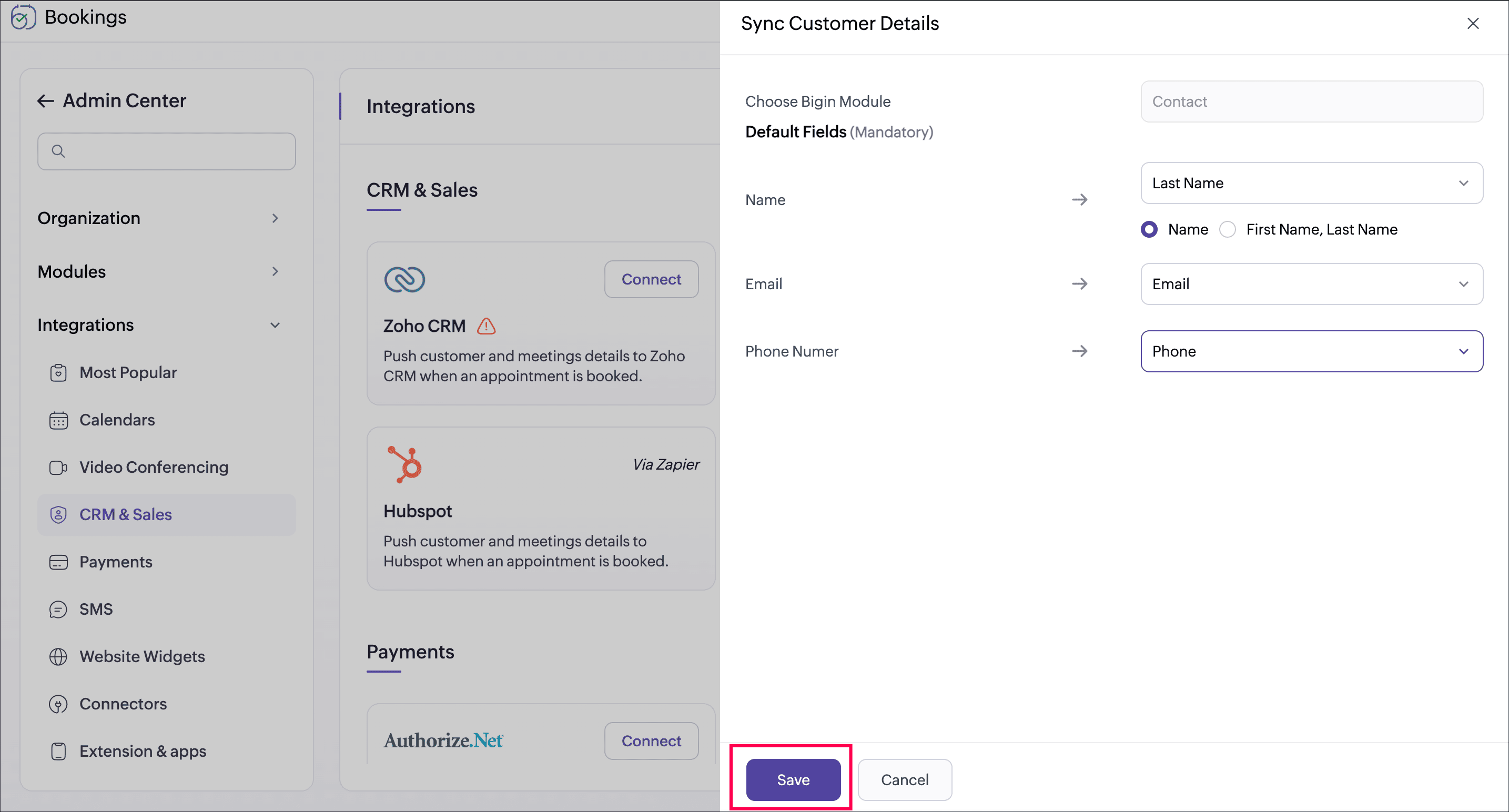 Map Customer details: A slider will be shown where you can map the booking form fields to Bigin fields. The first slider Sync Customer Details lets you map the default Bookings fields like Name, Email, and Contact Number to Bigin's Contacts module fields.