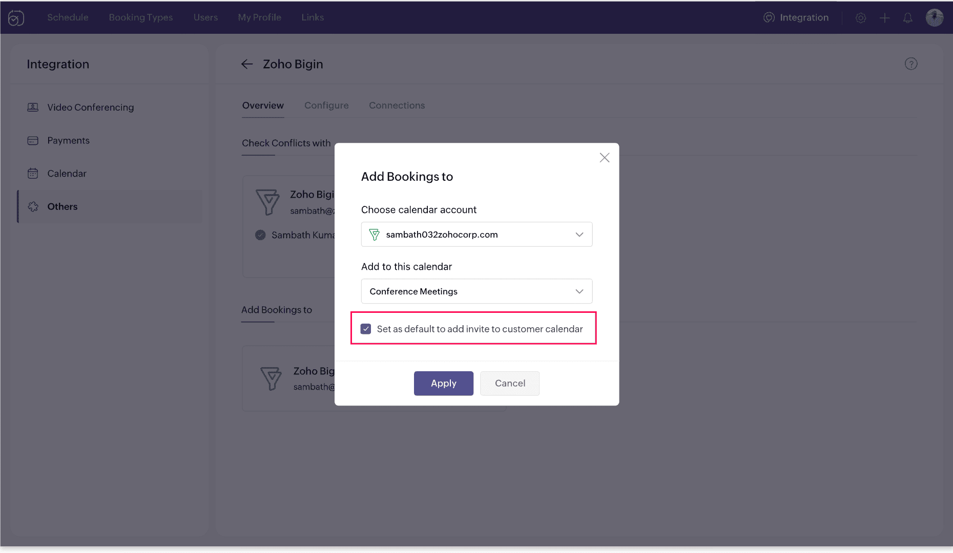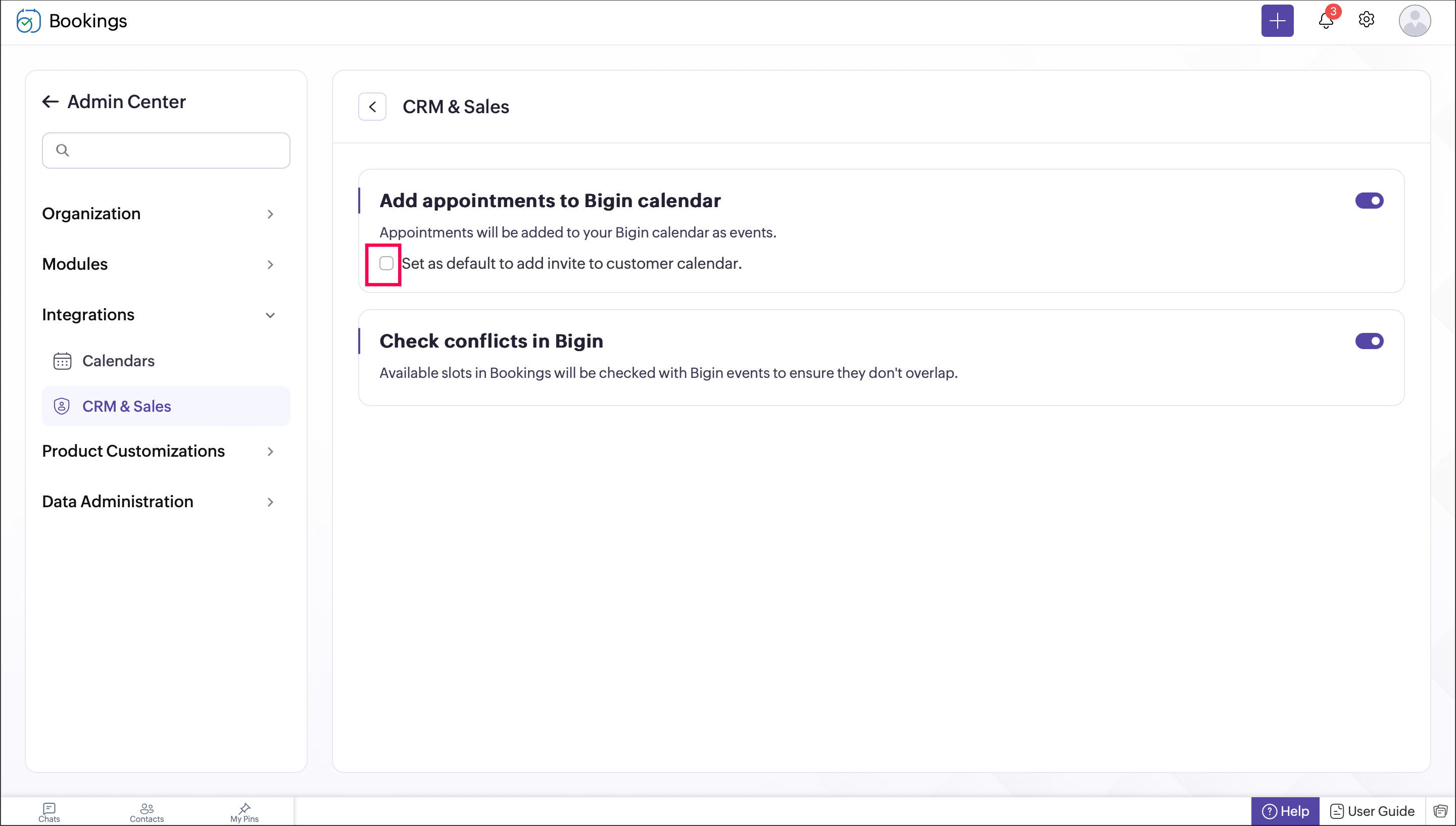Info: Please note that if you have chosen another calendar under Calendar integrations in Integration > Calendar > Add Bookings to, then calendar invite will be sent from both Bigin and the integrated calendar. To avoid duplicate invites, it is advised to only select one of the above options.