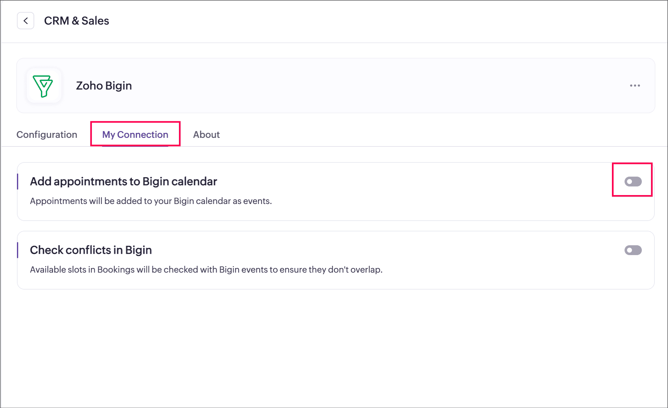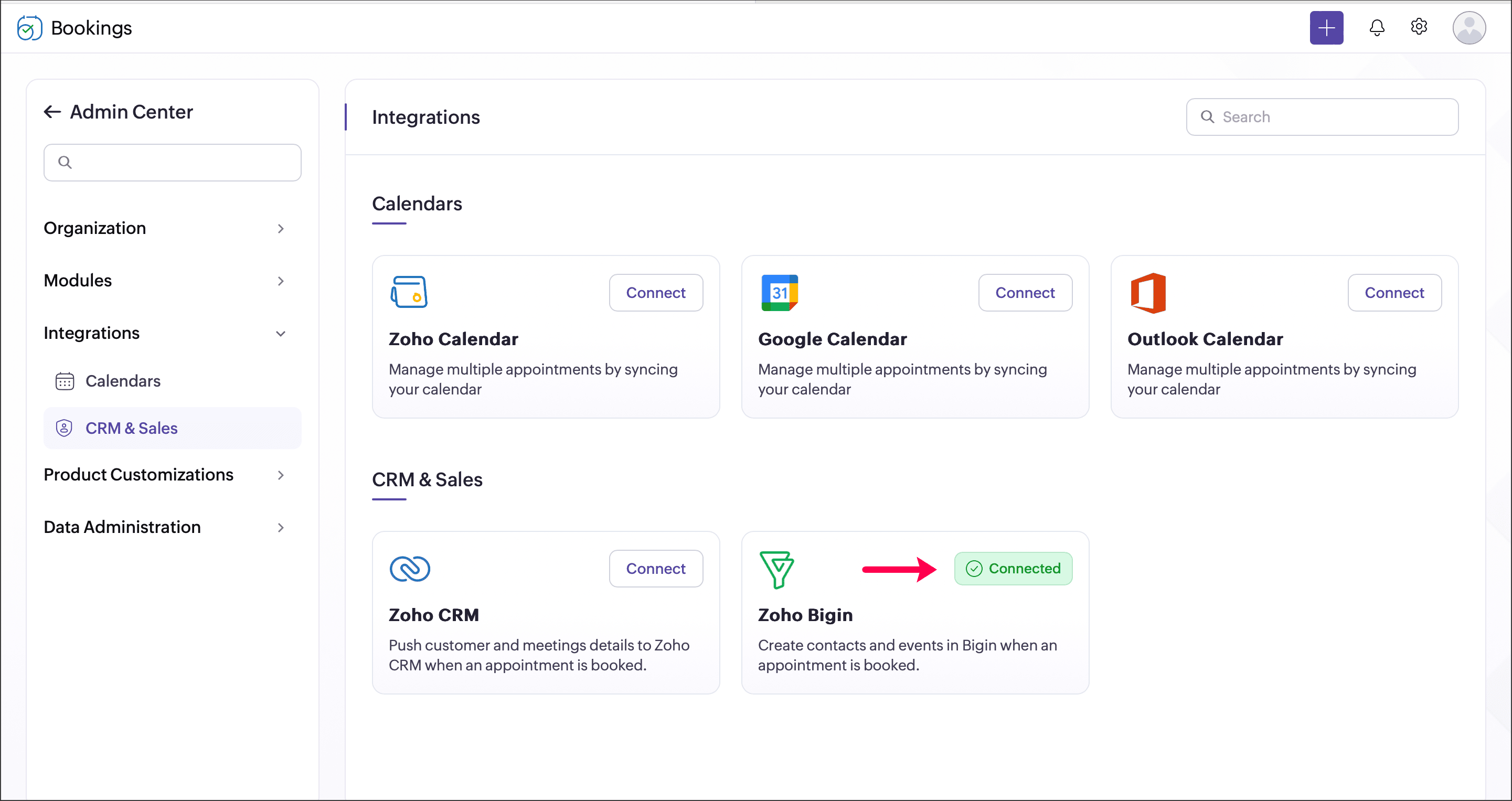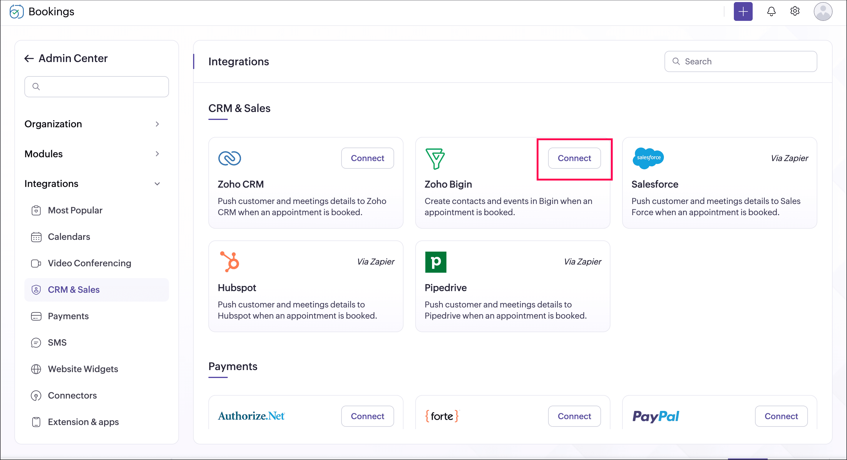- Click Zoho Bigin under CRM & Sales. This connects the user's Bookings account to Bigin.