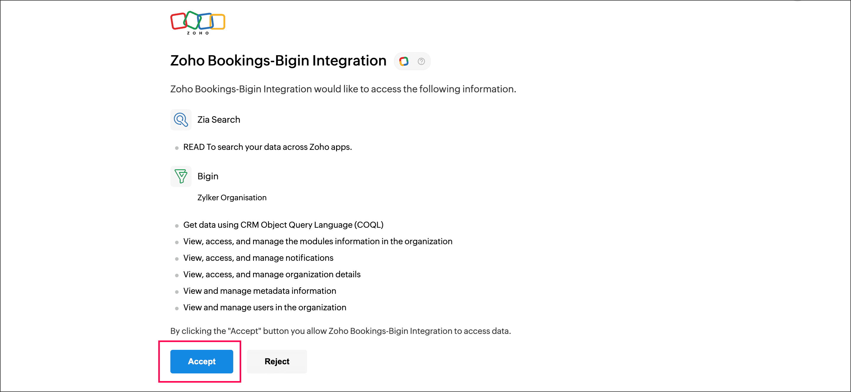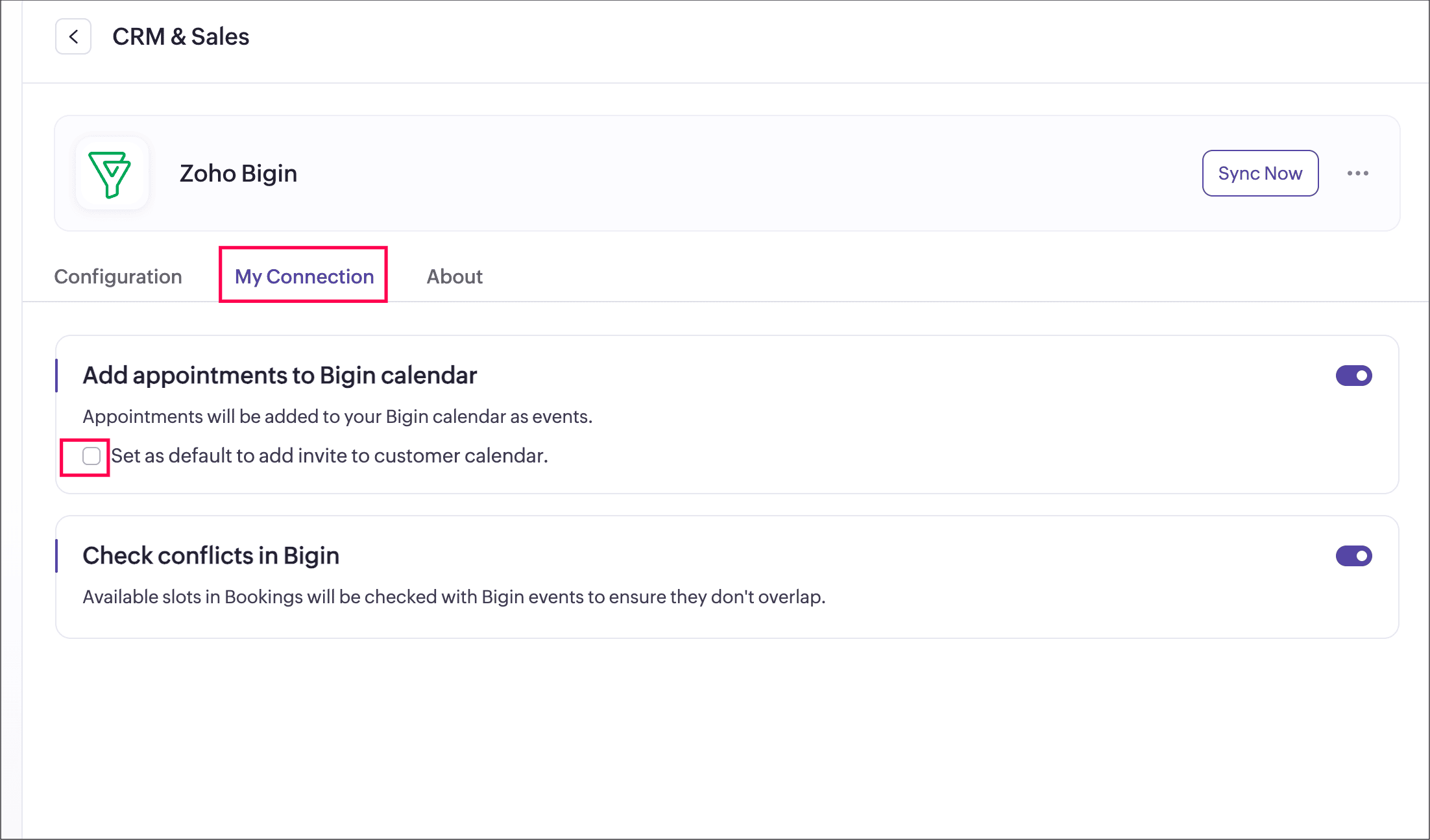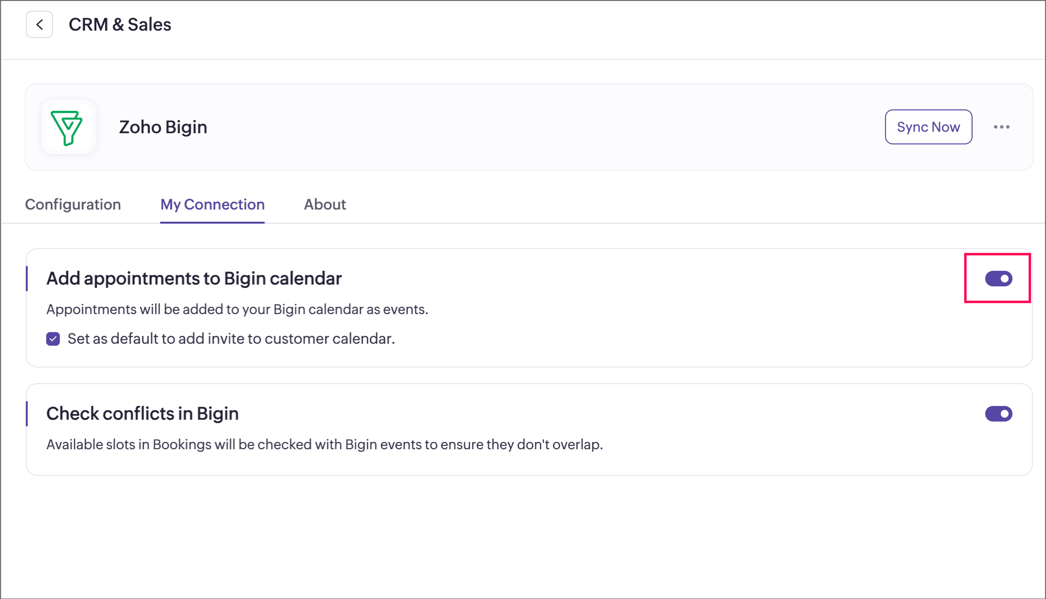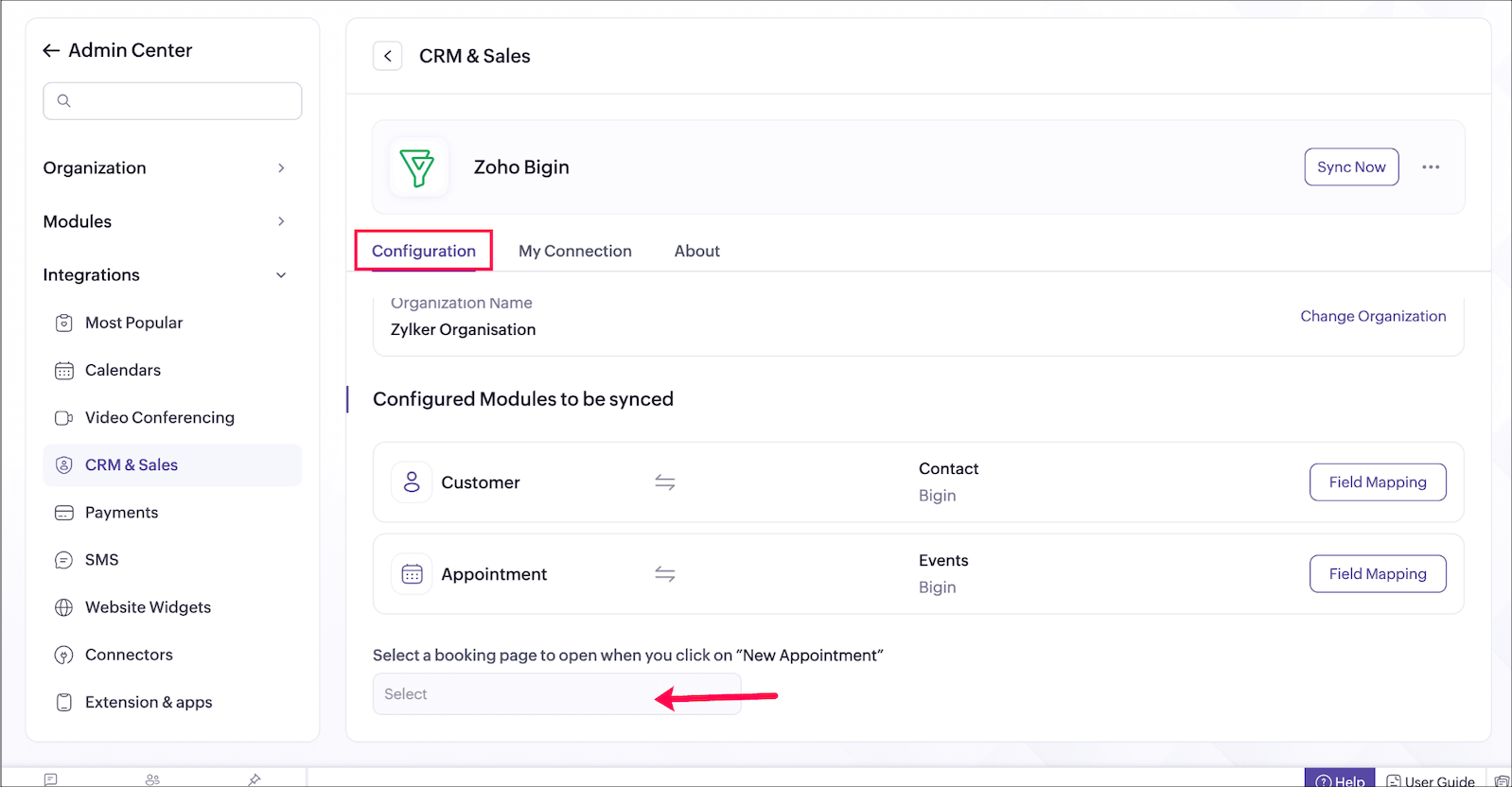 - Click Zoho Bigin under CRM & Sales. This connects the user's Bookings account to Bigin.