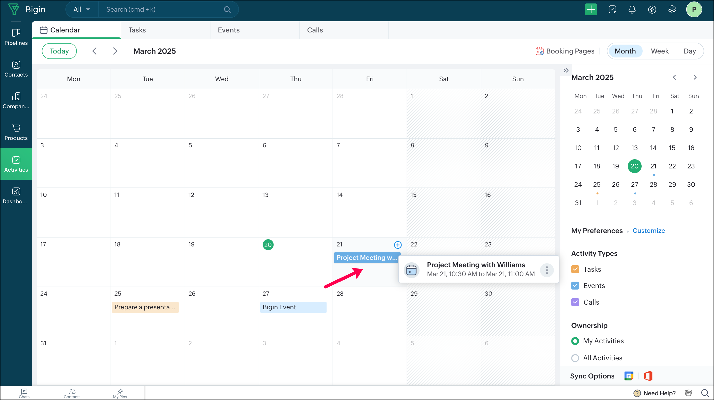 Events in Bigin will sync to Bookings, which blocks the respective time slot. Also, appointments can be added as events in Bigin if required.