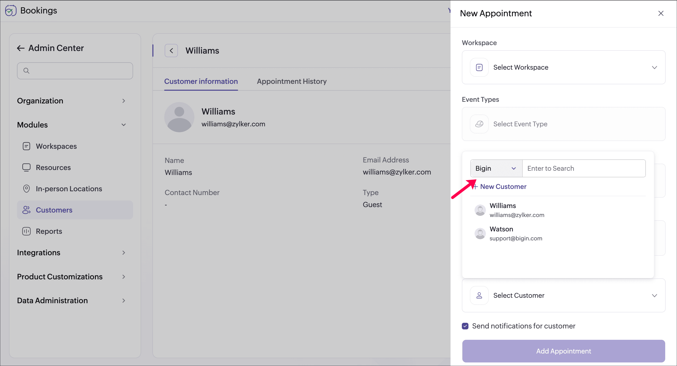 Bigin customers can be accessed in Bookings while adding an appointment.