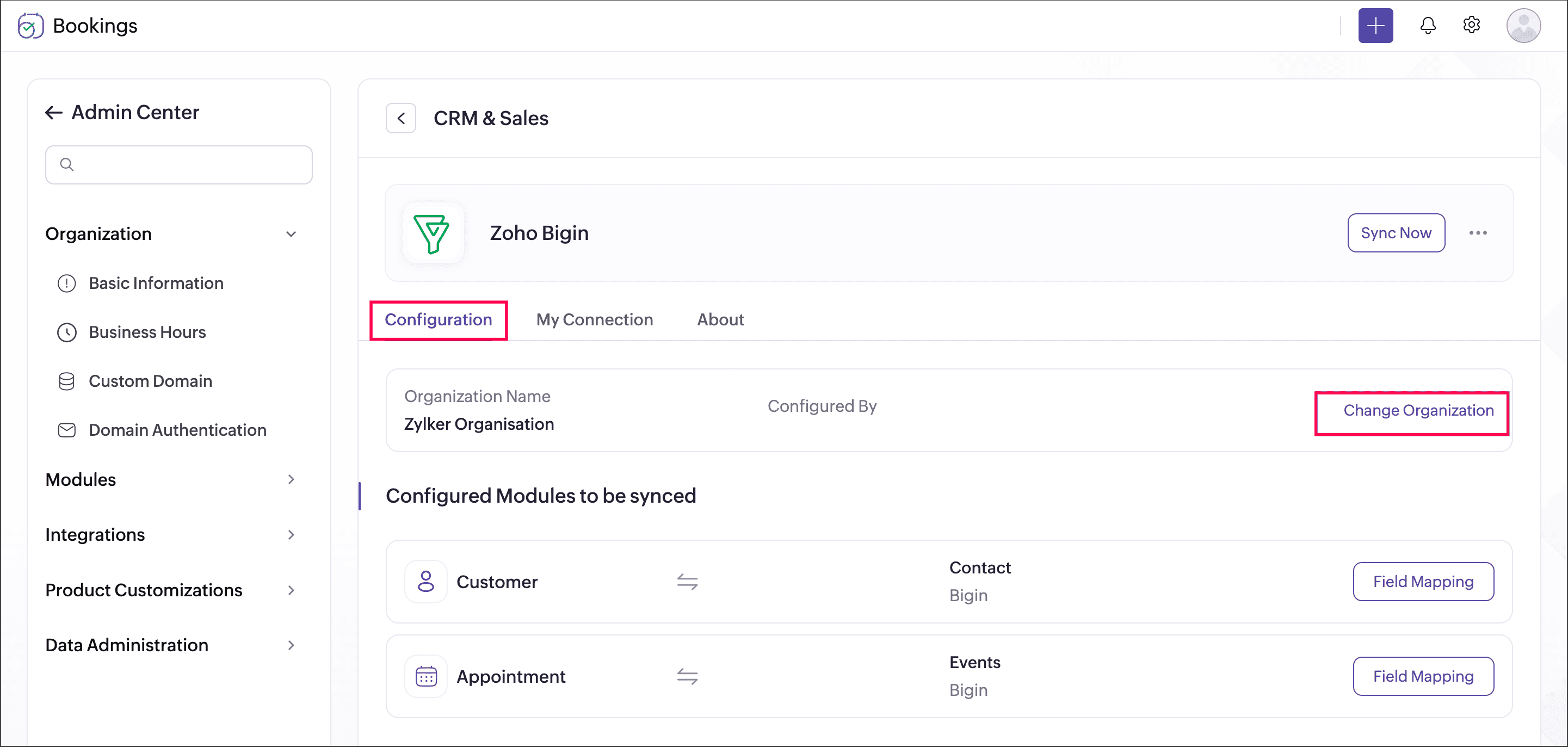 This integration connects Bookings org to any one of the Bigin organizations. You can change the required Bigin organization by clicking the Change Organization option as shown in the below image. Note: This can be performed only by the admin who integrated this connection. Also, please note that if the organization is changed, all the mappings should be configured again.
