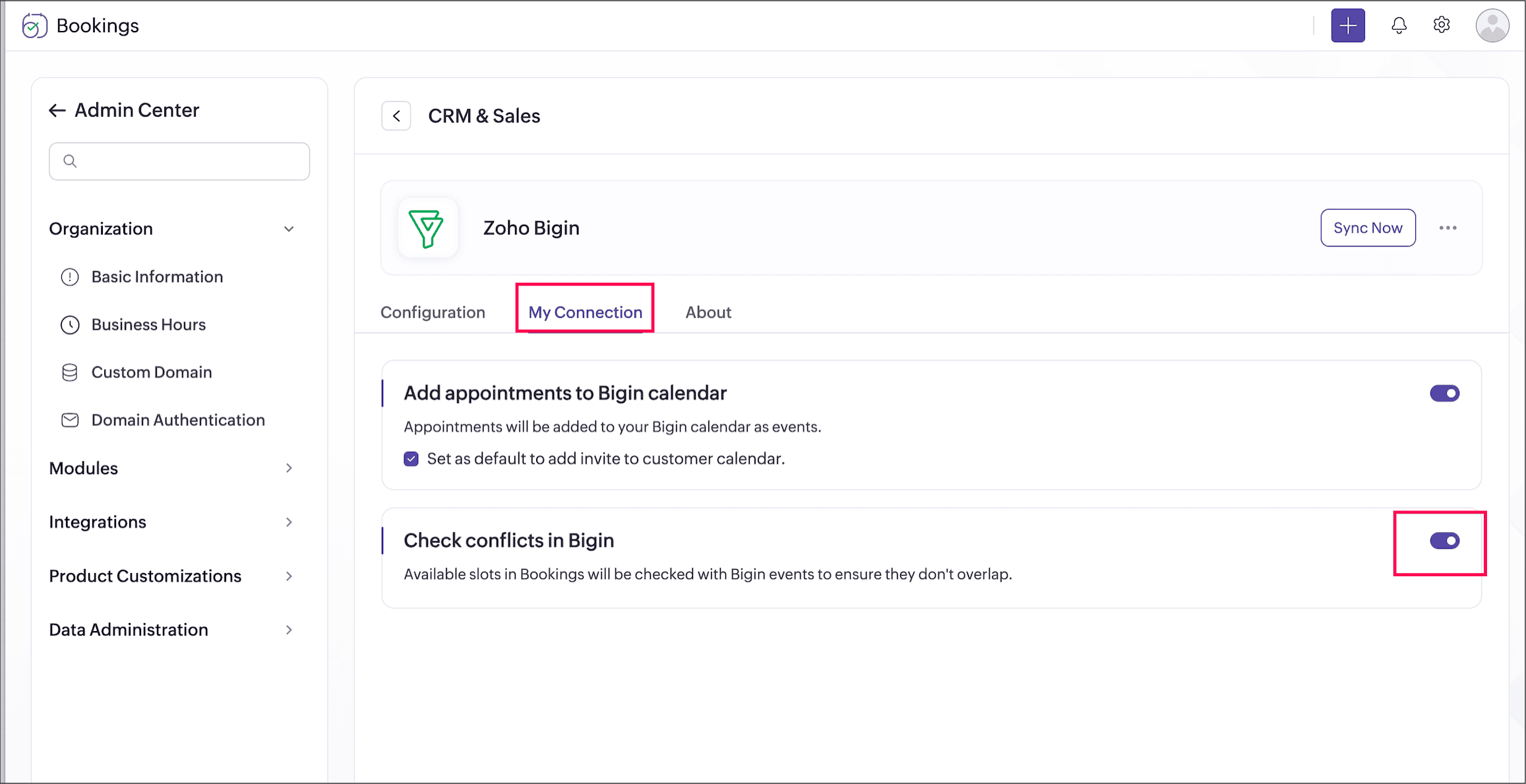 Enable the Check conflicts in Bigin toggle to check if the slots in Bookings are overlapping with events in Bigin and make the slots unavailable. Disable it not to check the conflicts.