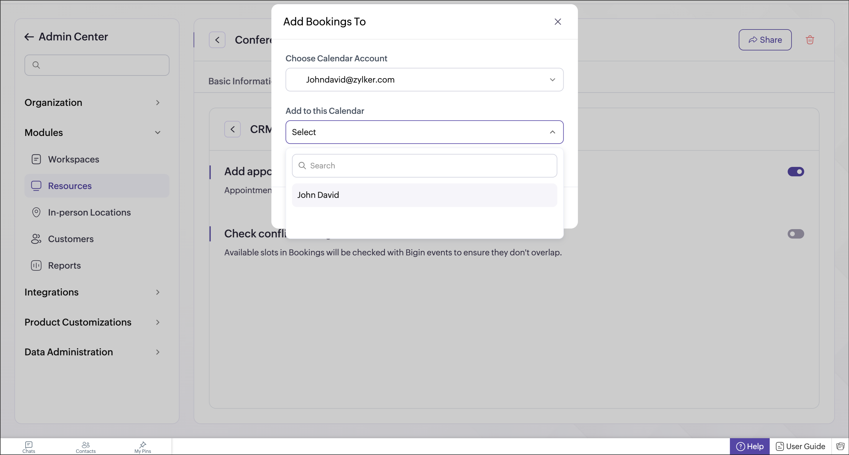 Once connected, select the Bigin calendar for checking conflicts and adding bookings.