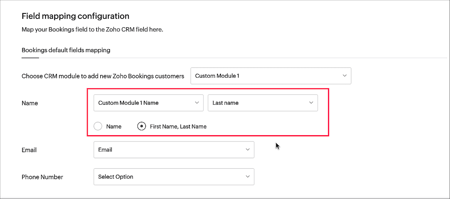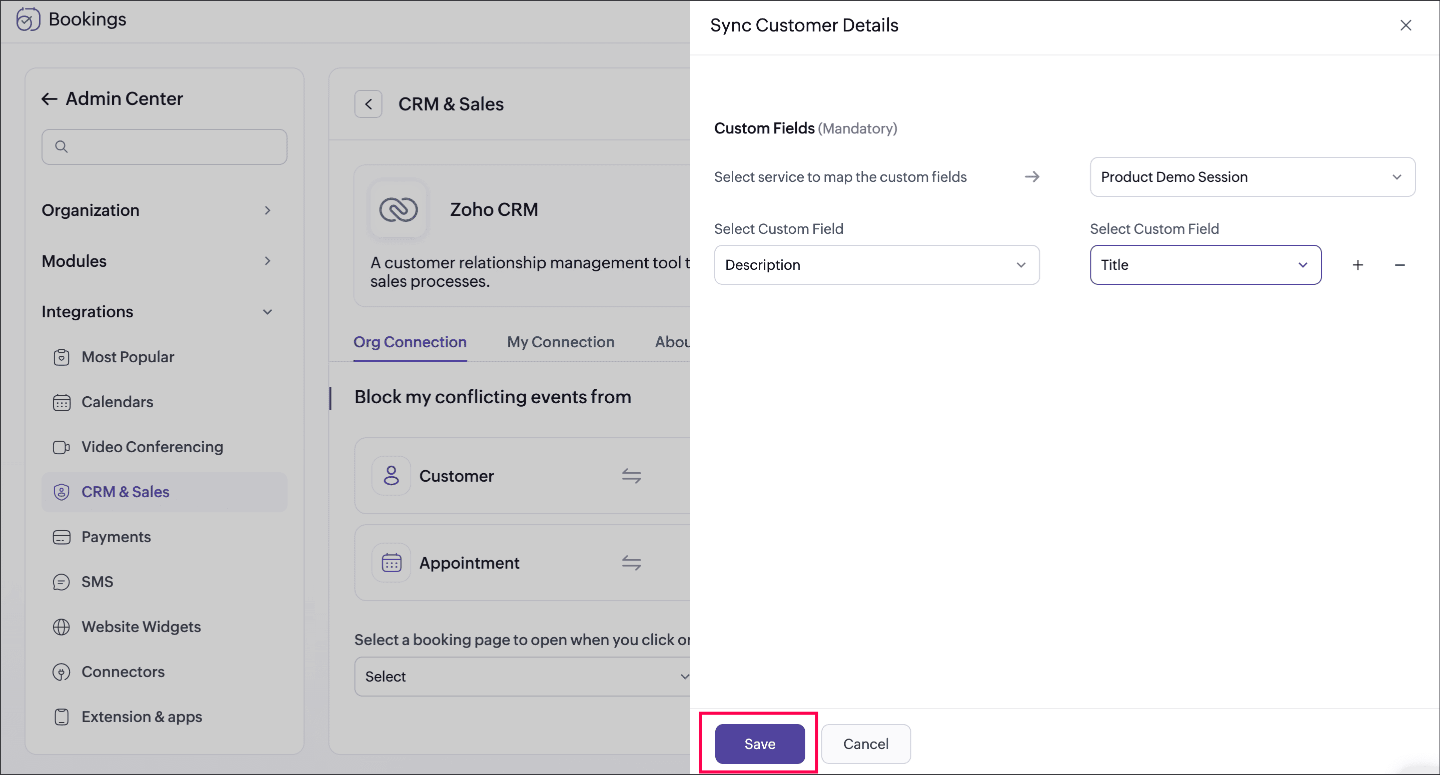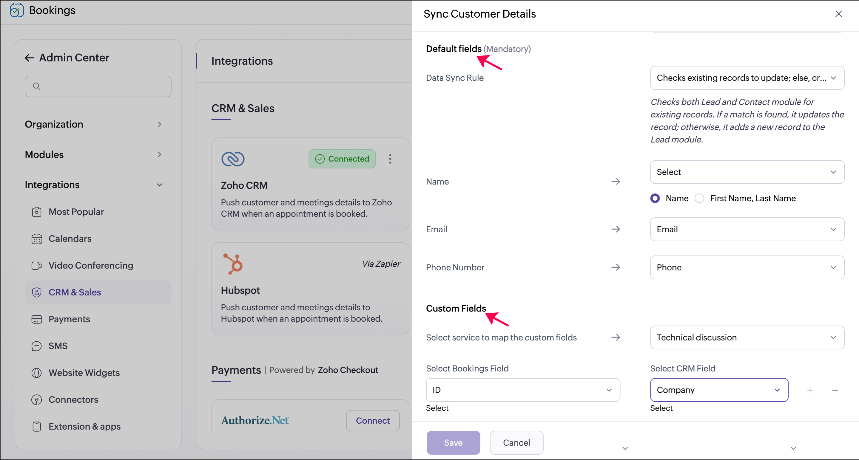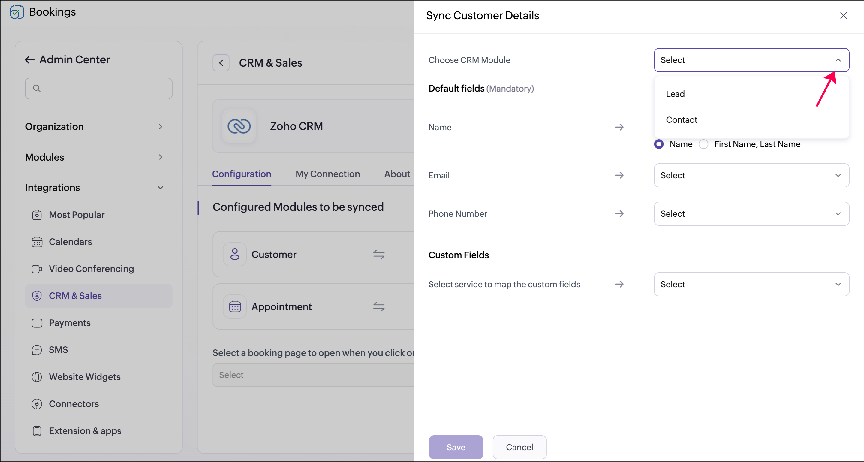 Select the corresponding CRM field from the right dropdown option to push the default and custom field values of the booking form to the selected module in the CRM. Click Save.