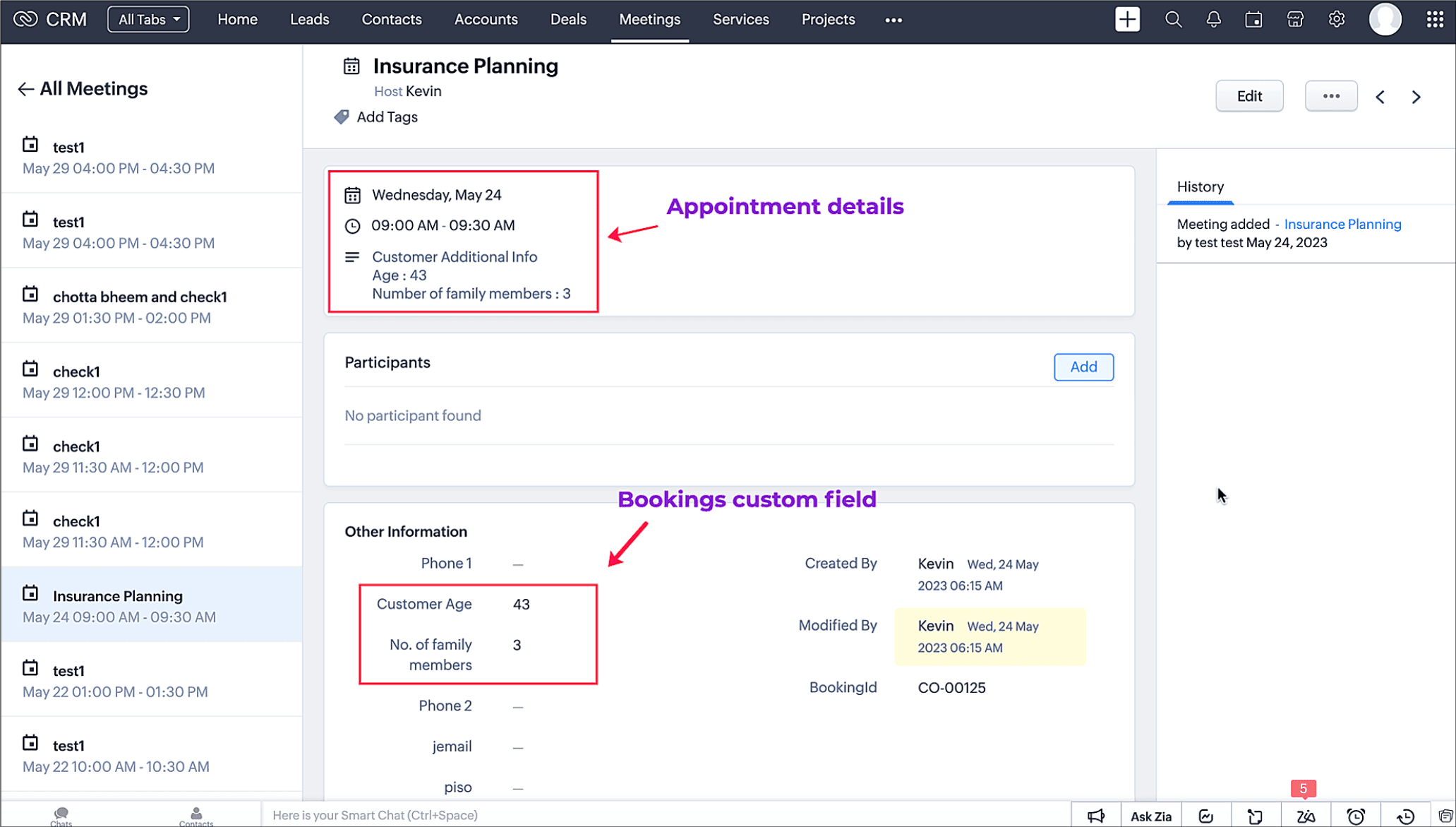 Appointment details are added in the Meetings module. The custom fields (in this example, Age and Number of family members) are also added in the Meetings module.