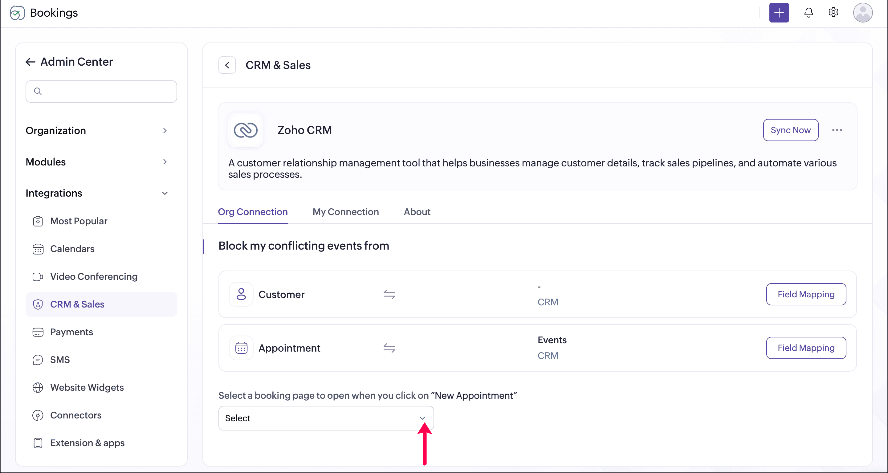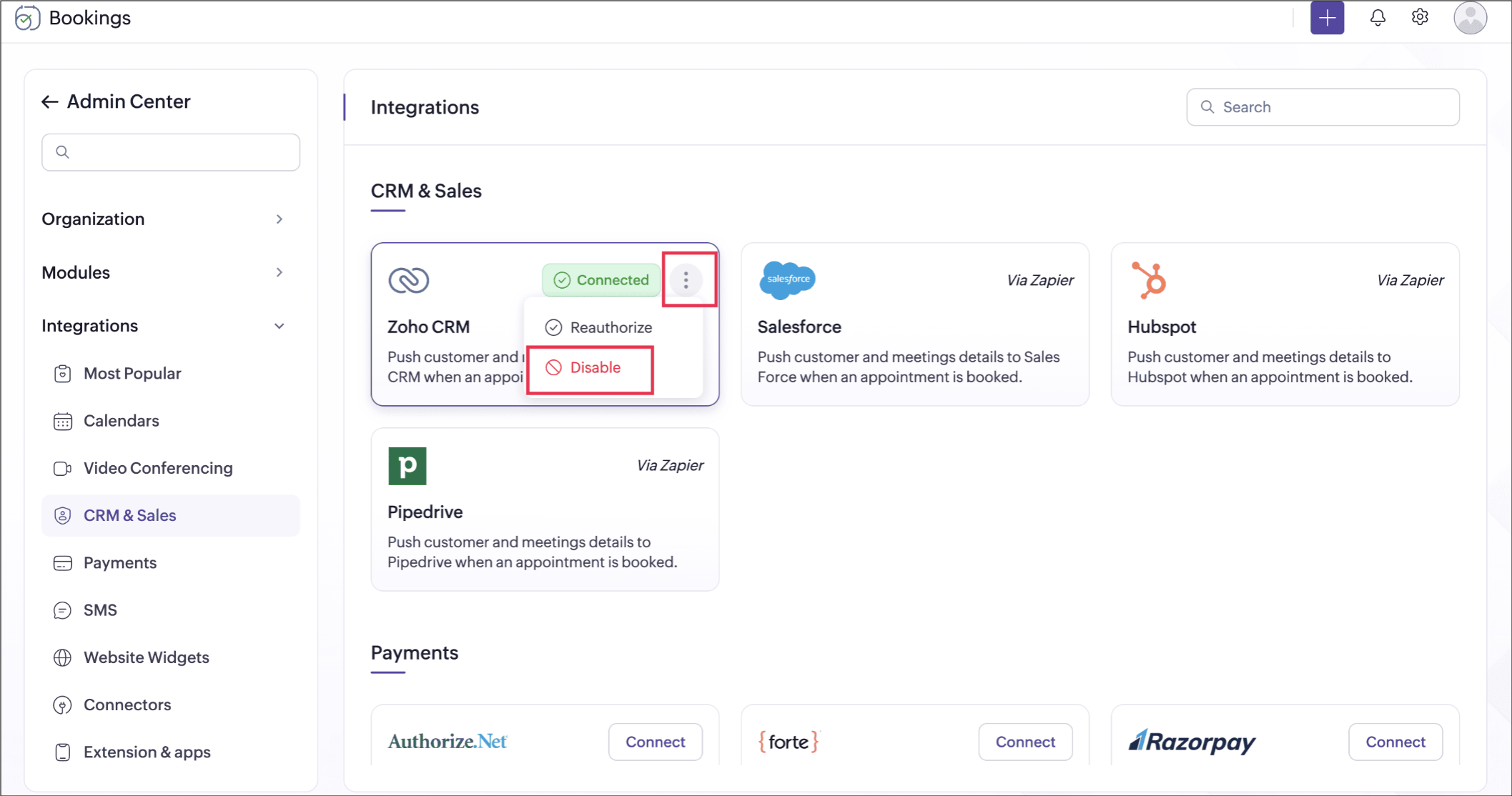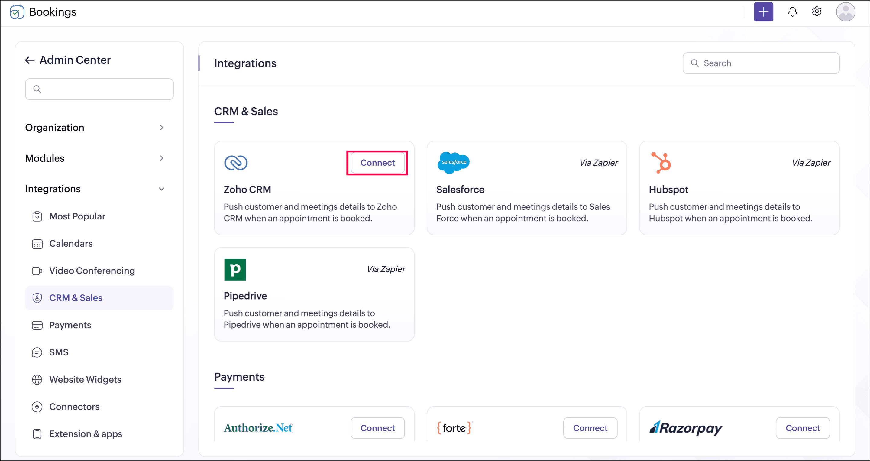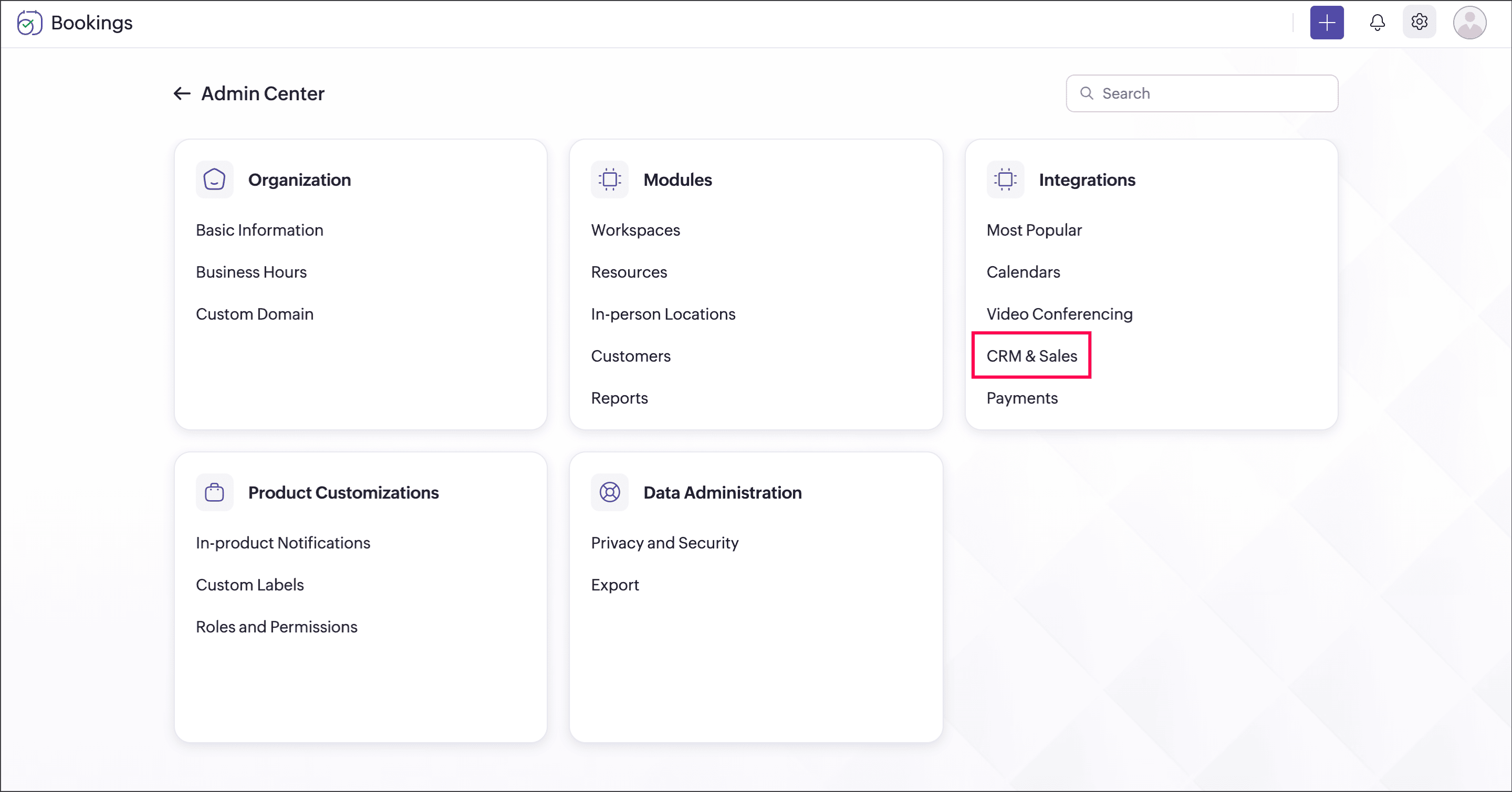 in the top-right corner of the Bookings menu bar. Click Integrations on the left sidebar. - Click Zoho CRM under CRM & Sales.