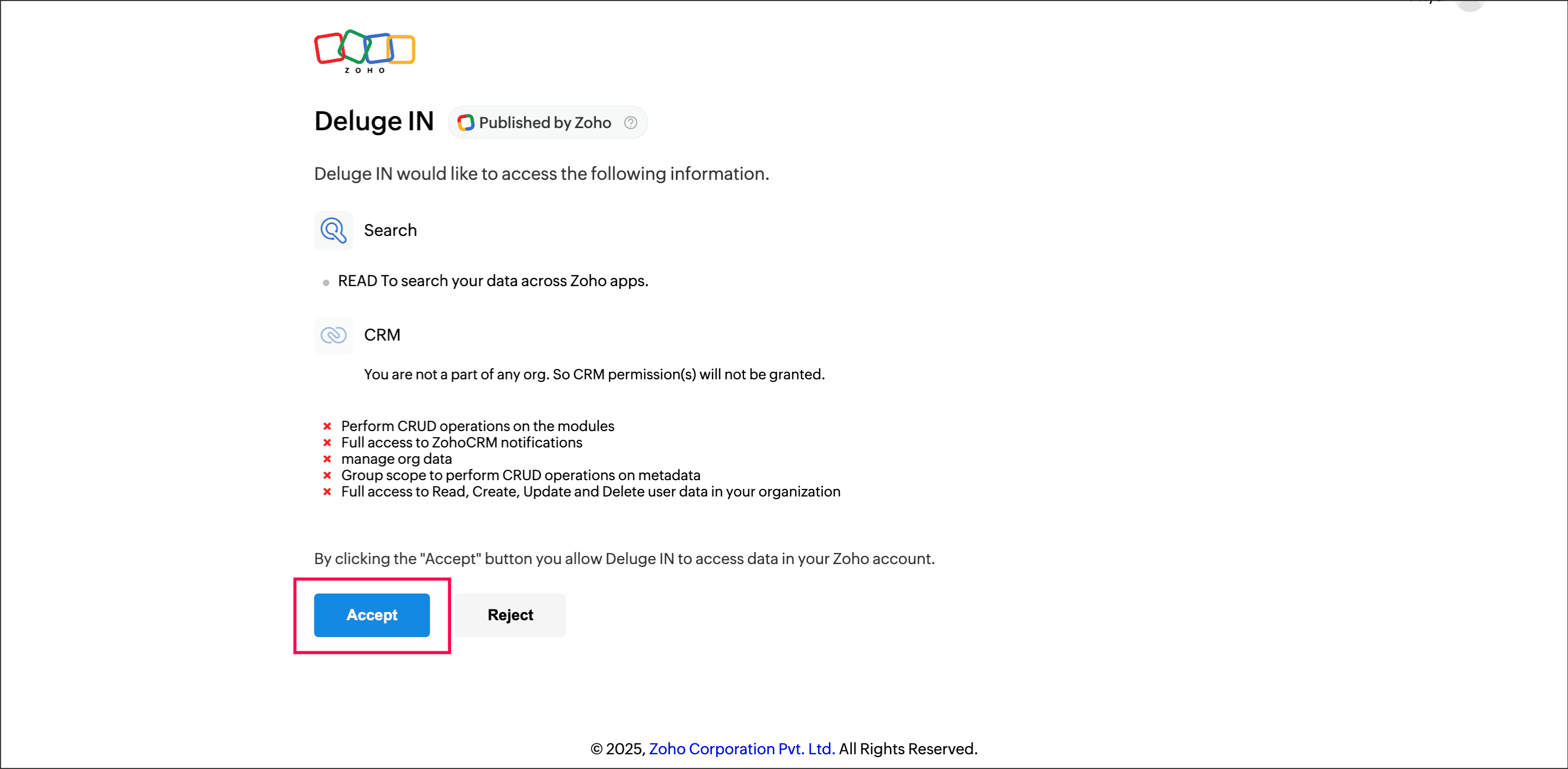 - Click Connect inside the Zoho CRM card. You will be redirected to the page where you can choose the organization and authorize the connection by selecting Accept.