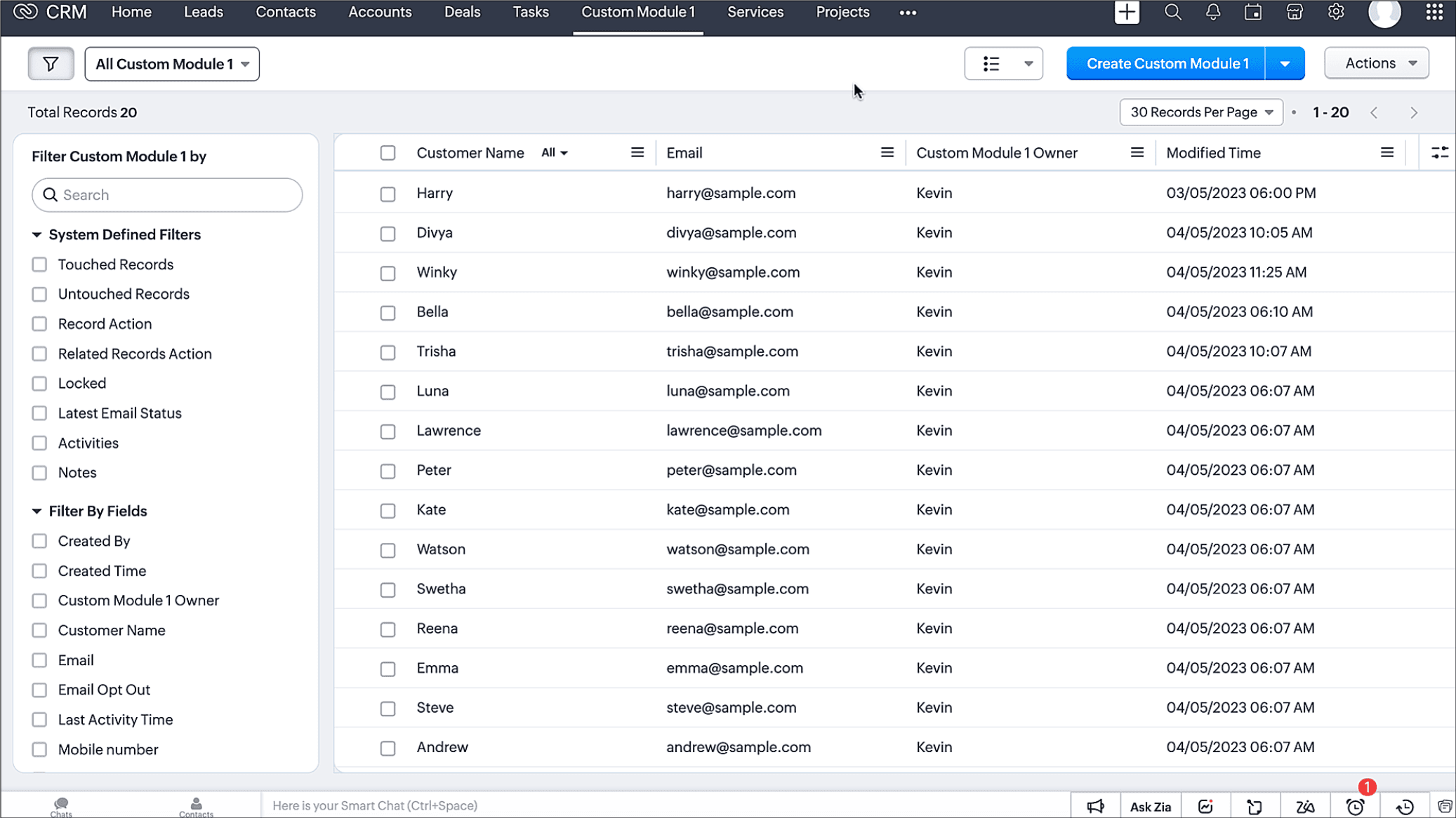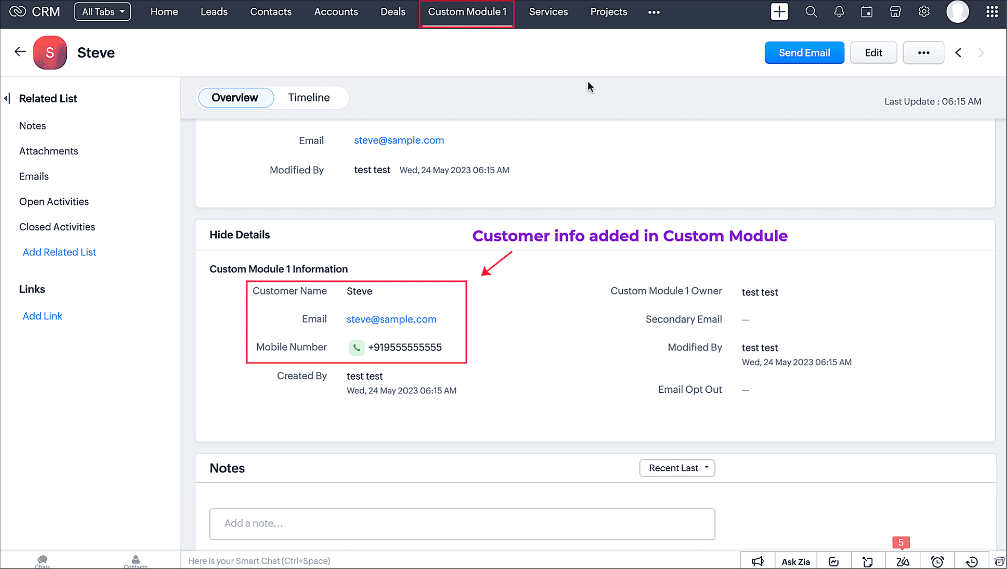 Note: Default fields are mandatory, while custom fields are optional when syncing customer details to the selected CRM module.