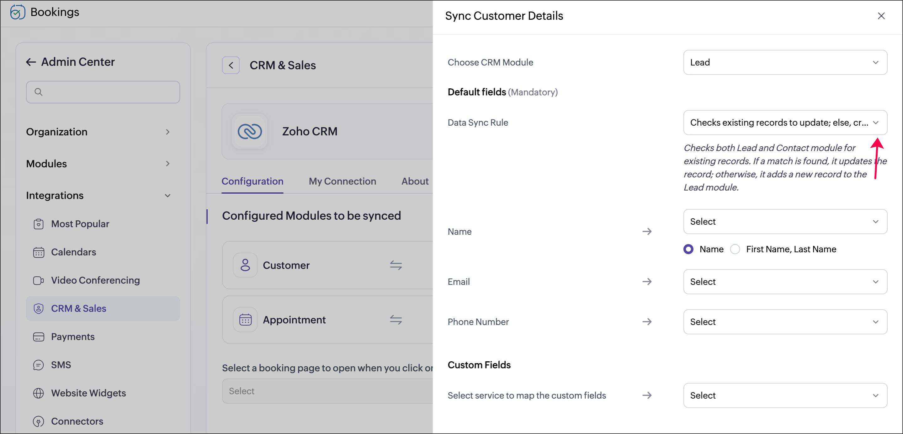Choose the CRM module from the dropdown option to push the Booking field values and add a new Zoho Bookings customer in the CRM.