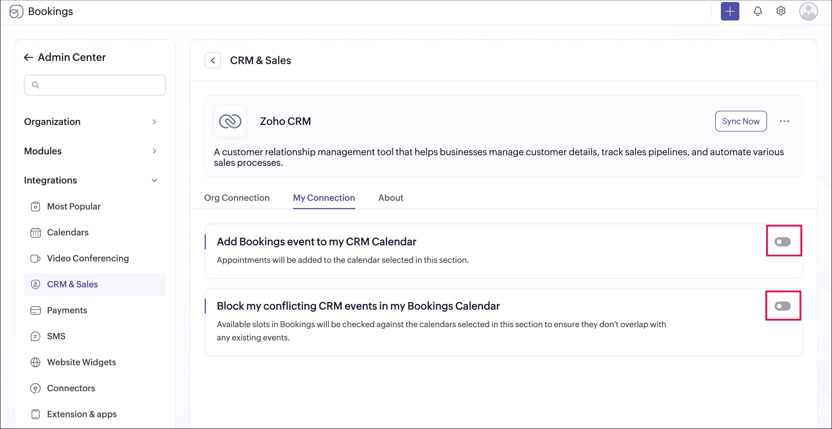 By default, when CRM integration is enabled, CRM events will be blocked in the Zoho Bookings calendar to prevent conflicts with existing bookings.