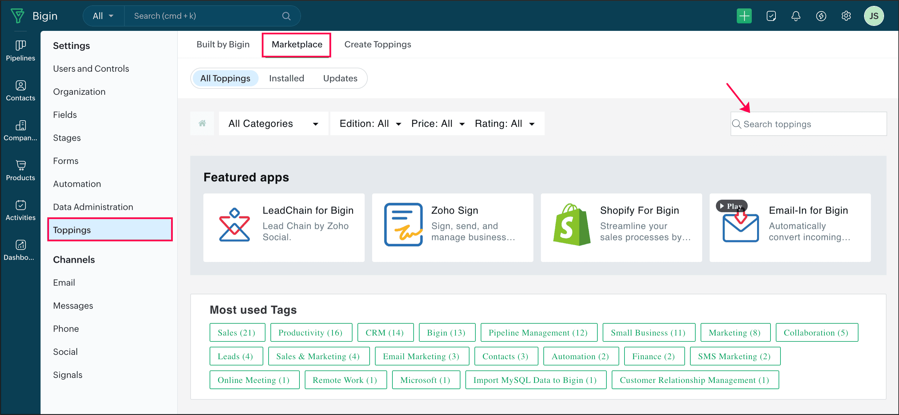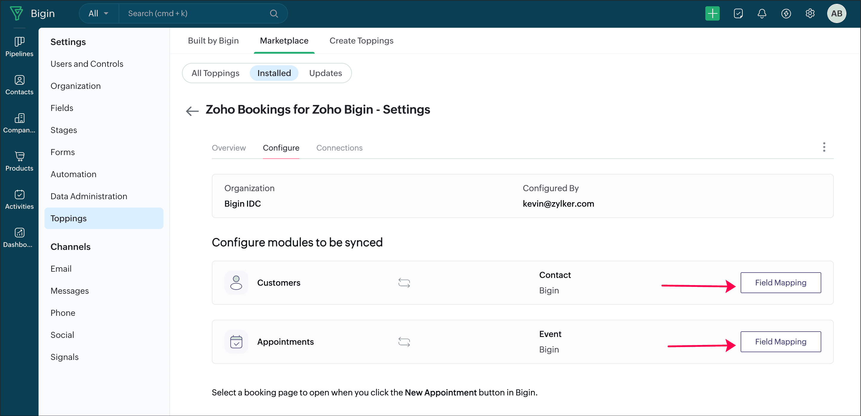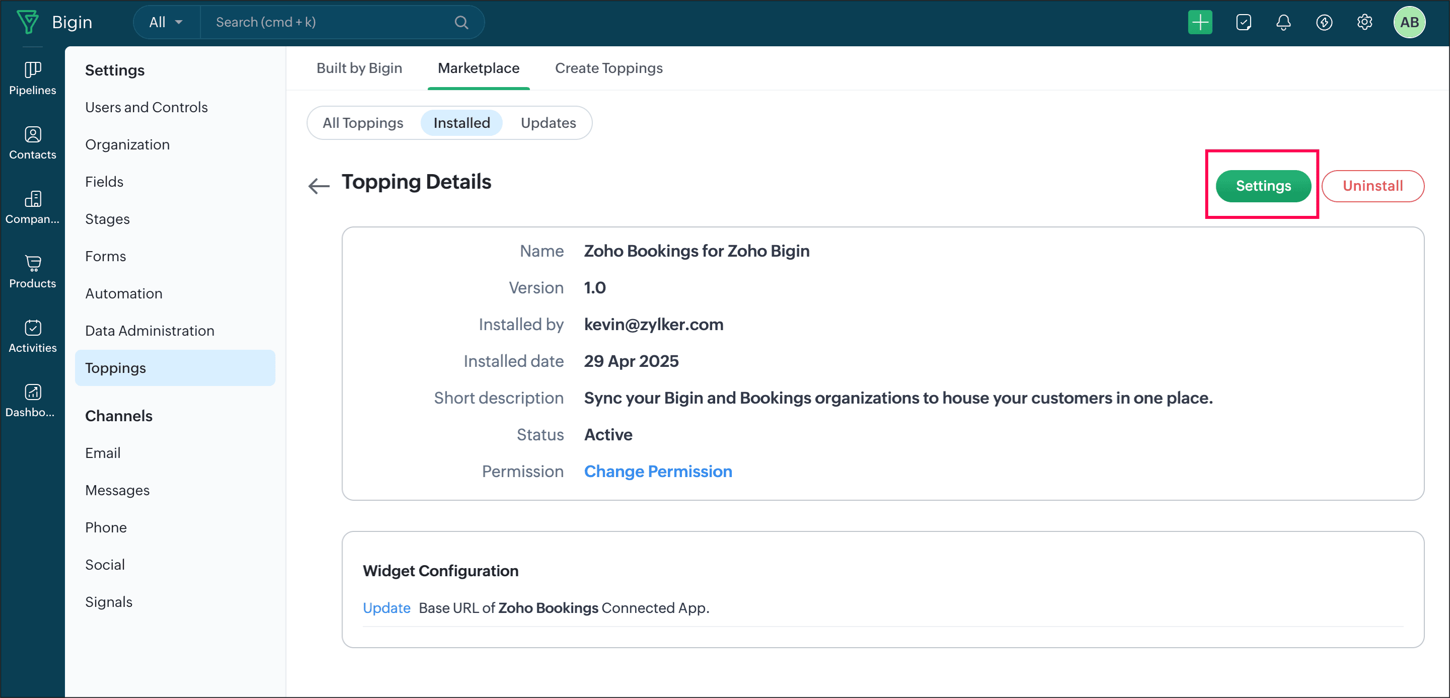 > Toppings > Installed. Click the installed Zoho Bookings for Bigin topping.
