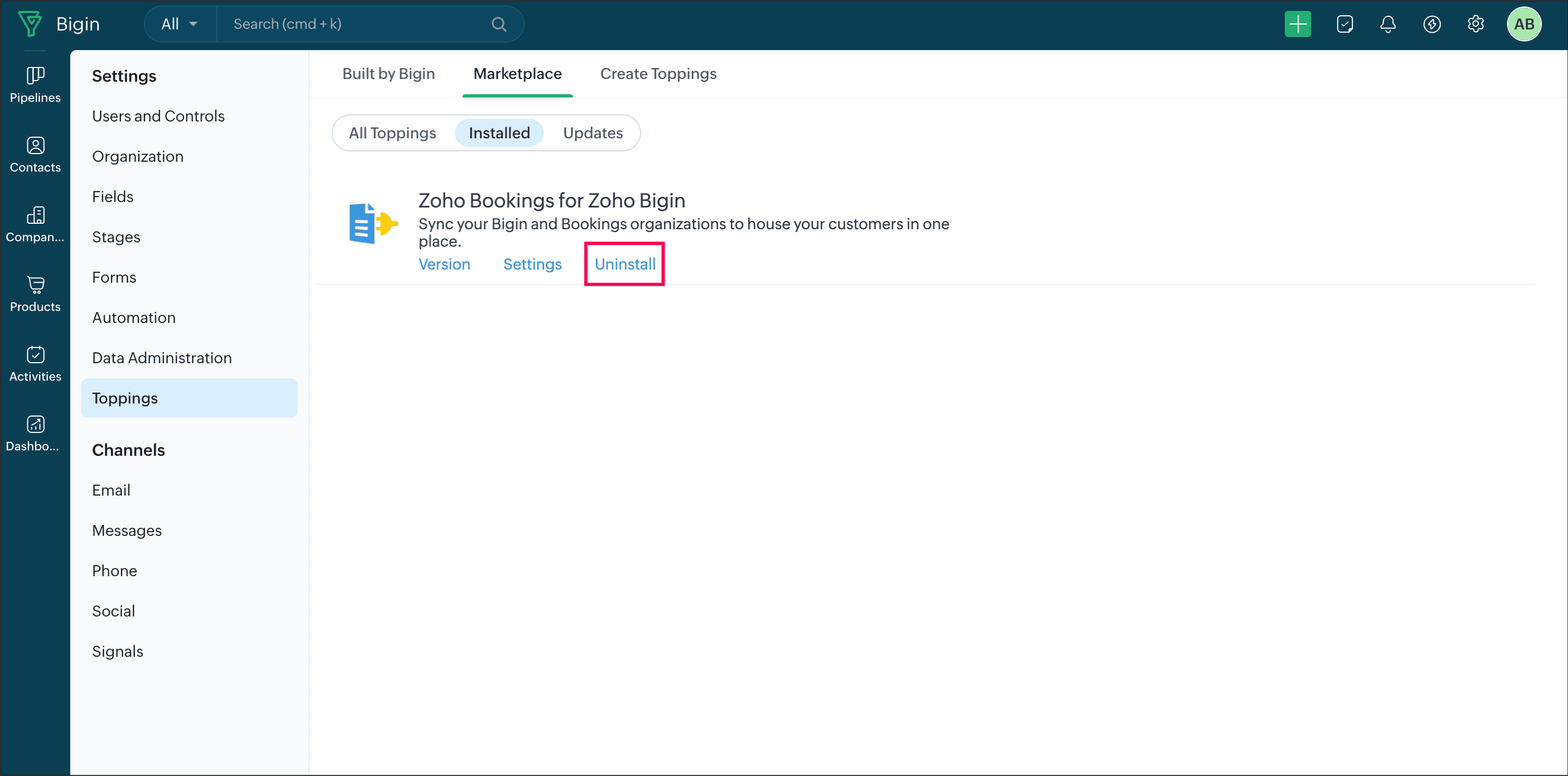 Under the Installed section, click Uninstall in the Zoho Bookings for Bigin topping. Click Ok in the pop-up to confirm.