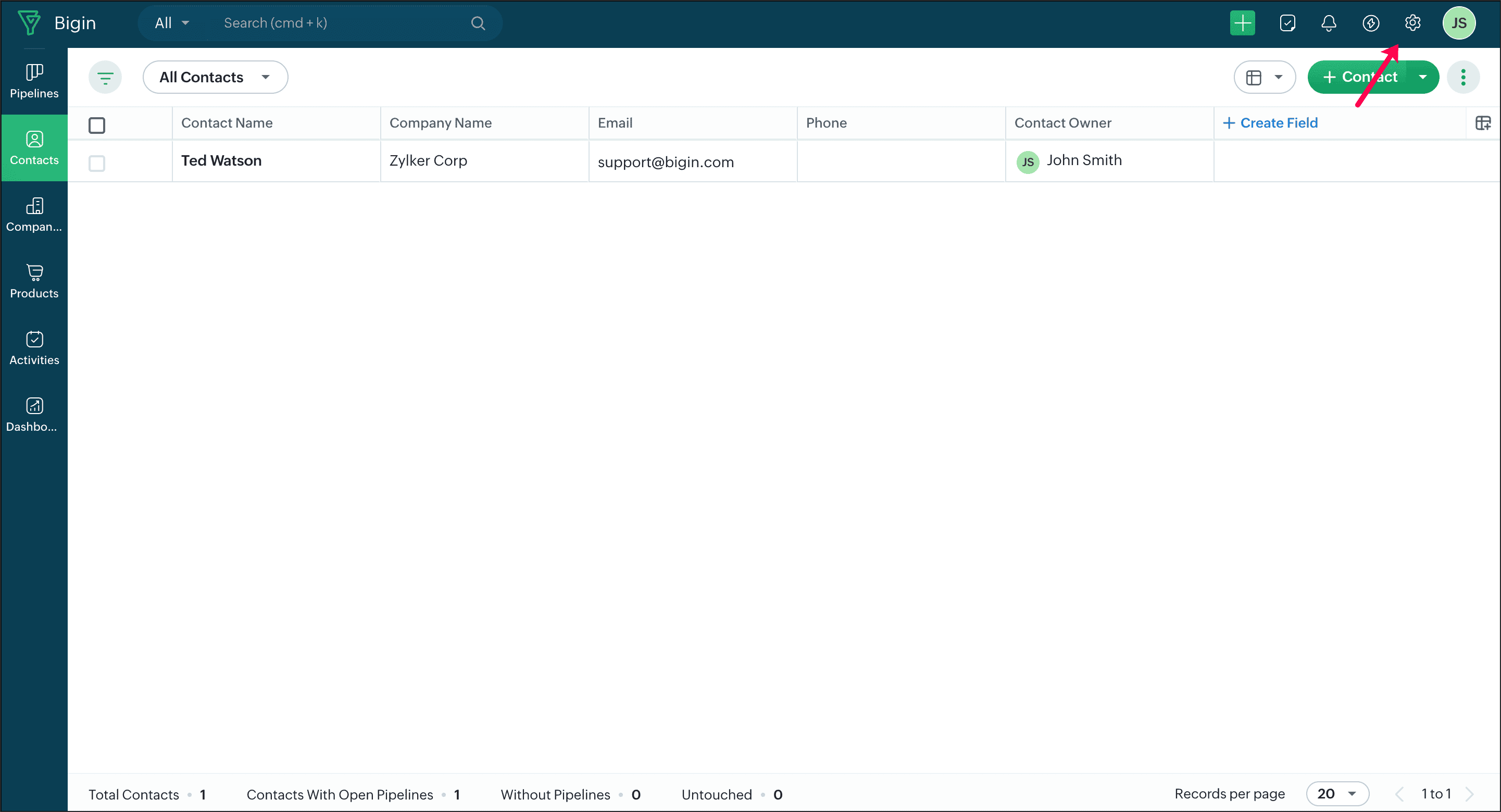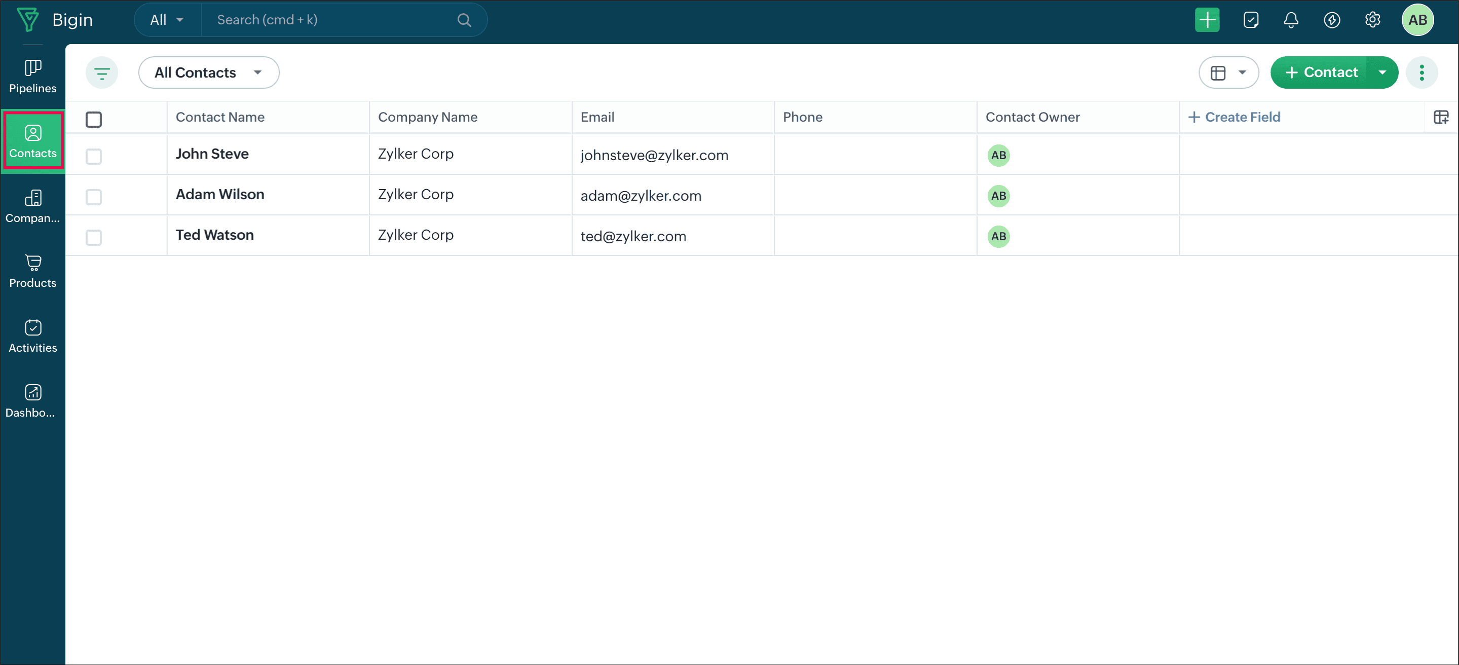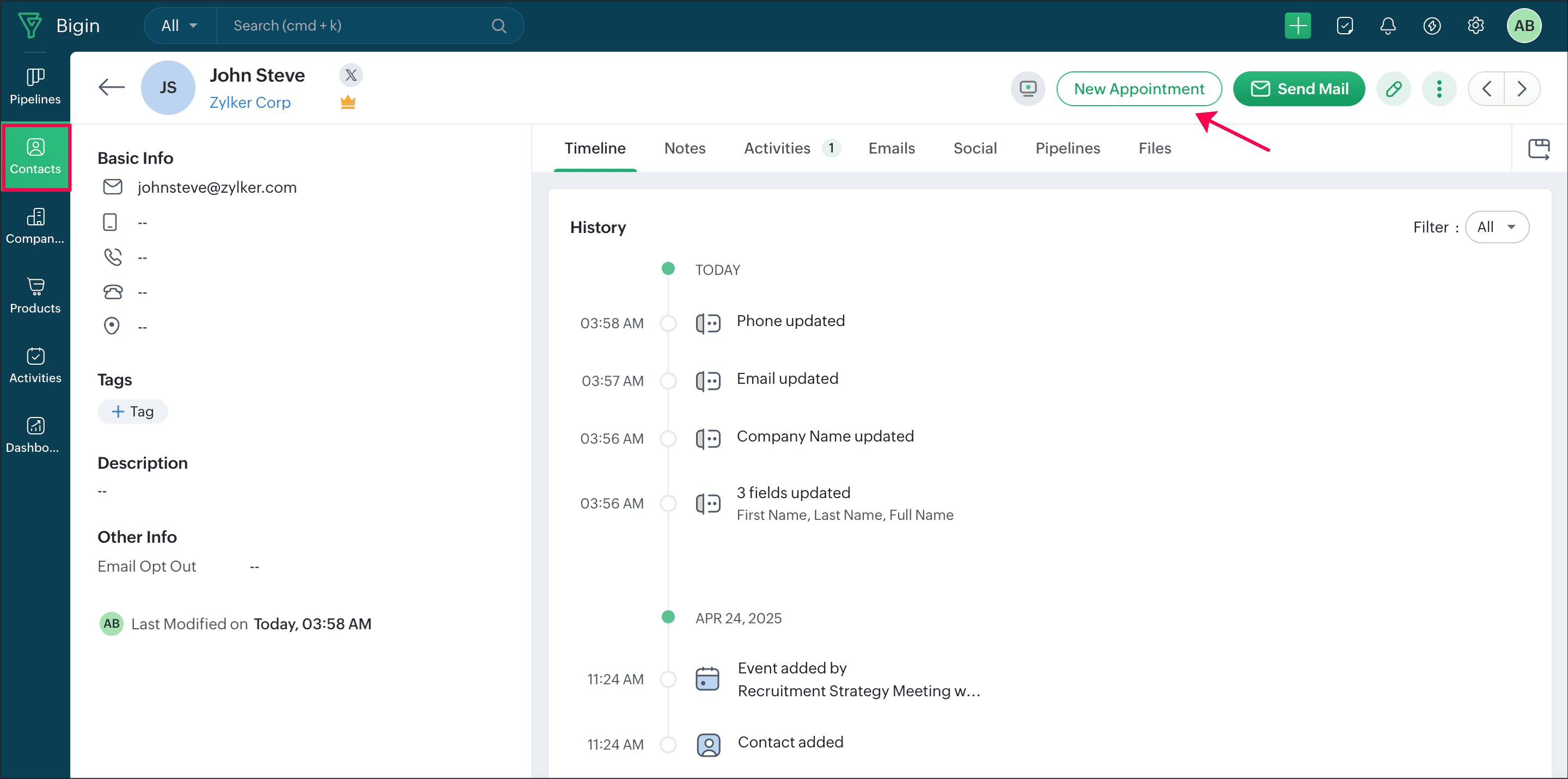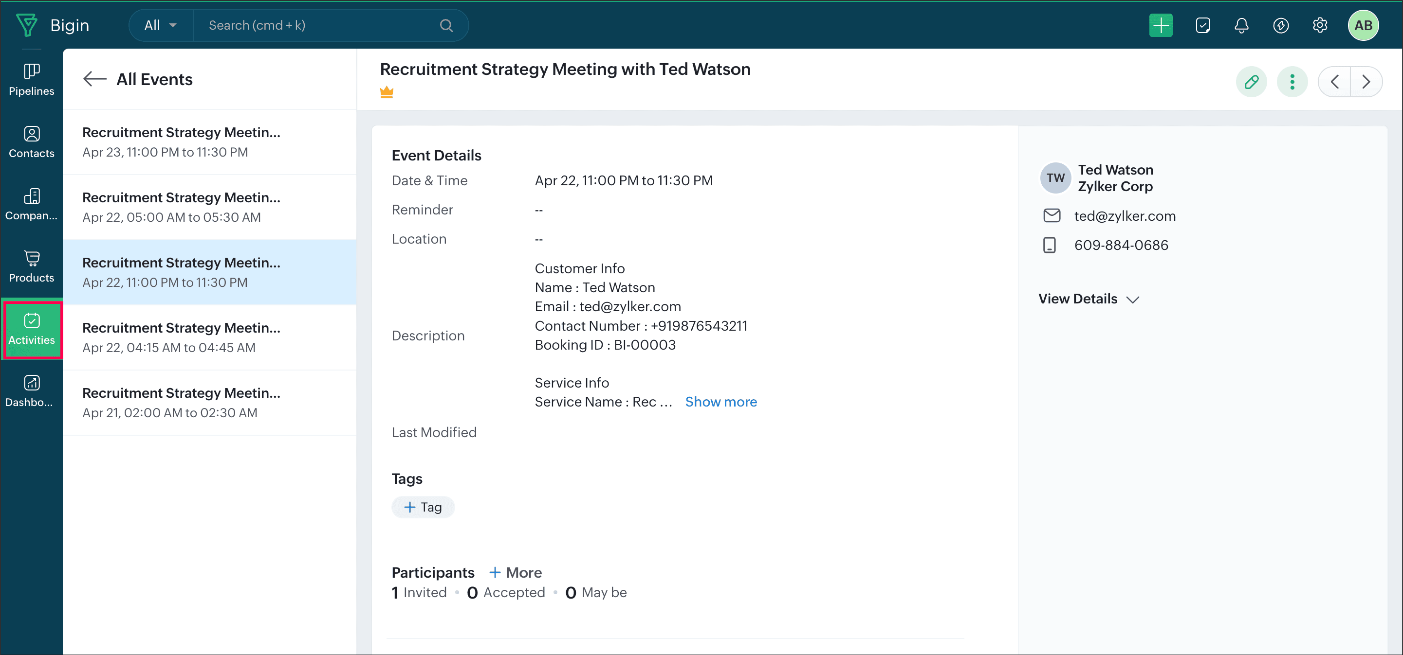 Once the topping is configured, you can view the contacts being added from Bookings in Bigin. Whenever an appointment is booked, the customer details will be added in the Contacts module. If an existing contact books an appointment, then their details will be updated in the Contacts.
