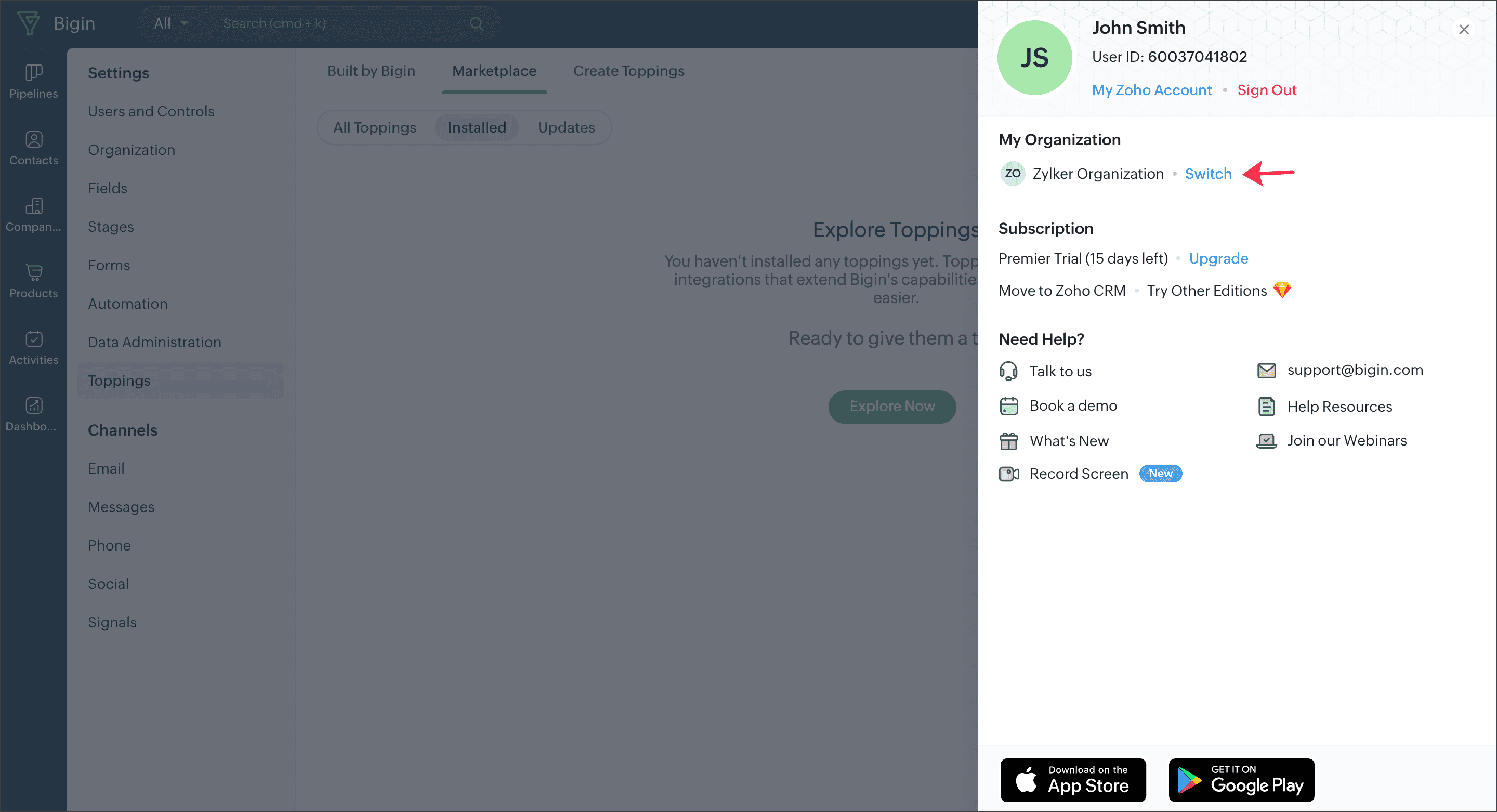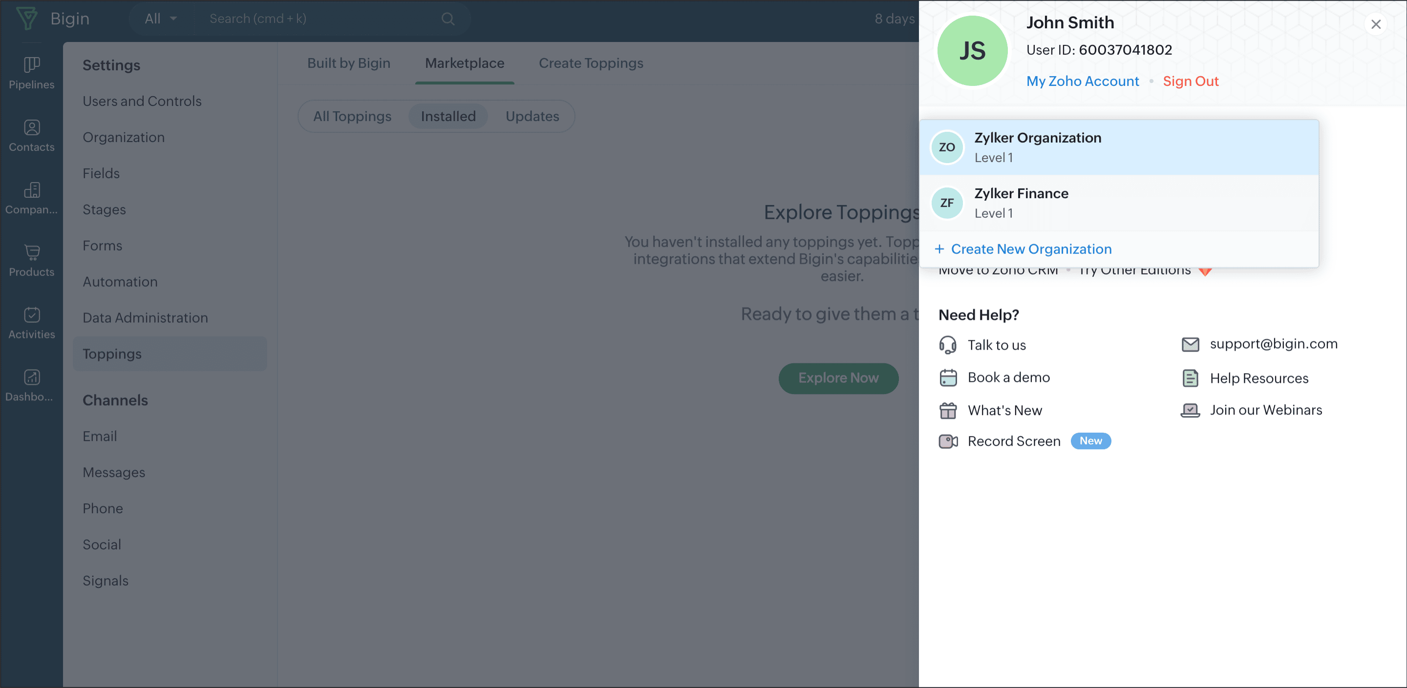 This topping can be installed and used in only one Bigin organization. To change the current organization and use Bigin topping in a different org, you need to disable the integration in the current organization first, and then switch to the required org. You can then install the topping in that organization.