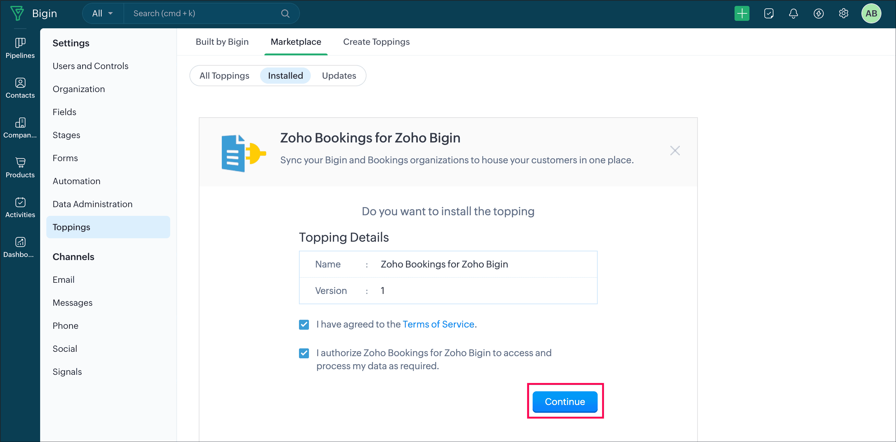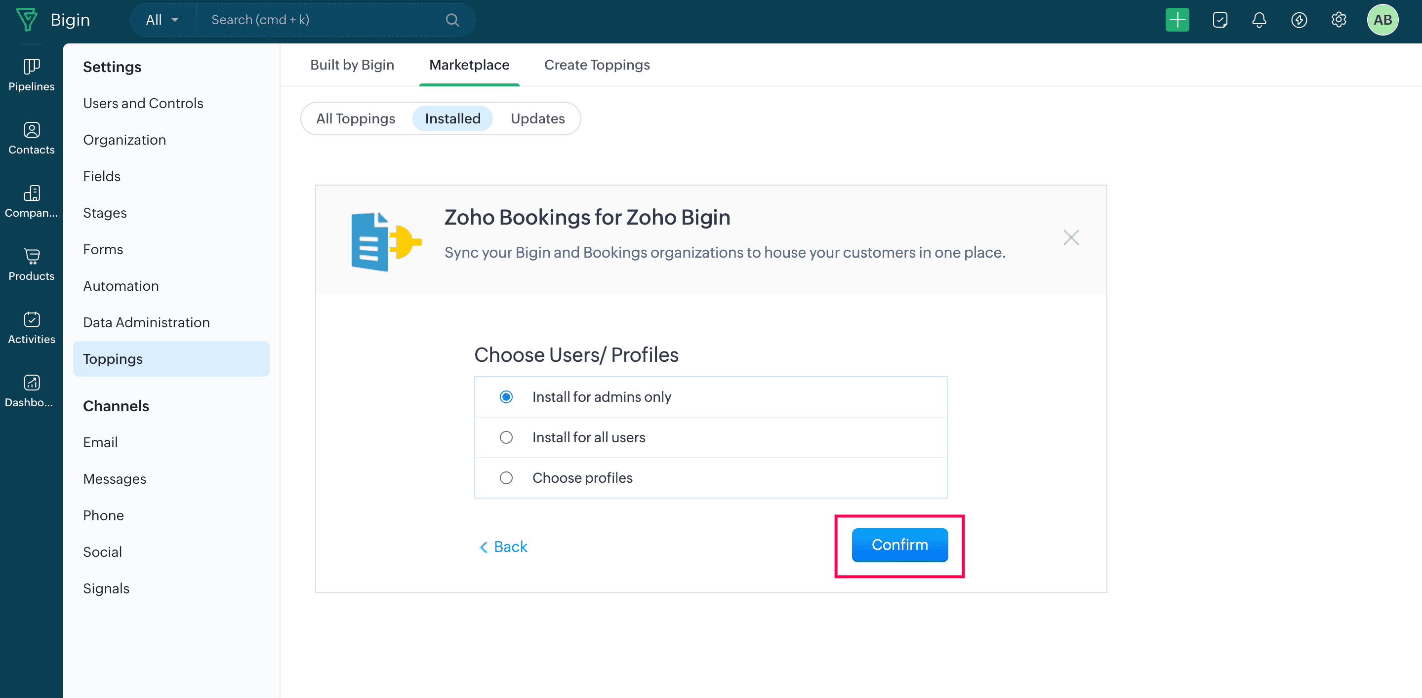 - Install for admins only - This installs the topping only for admin users in your Bigin organization.