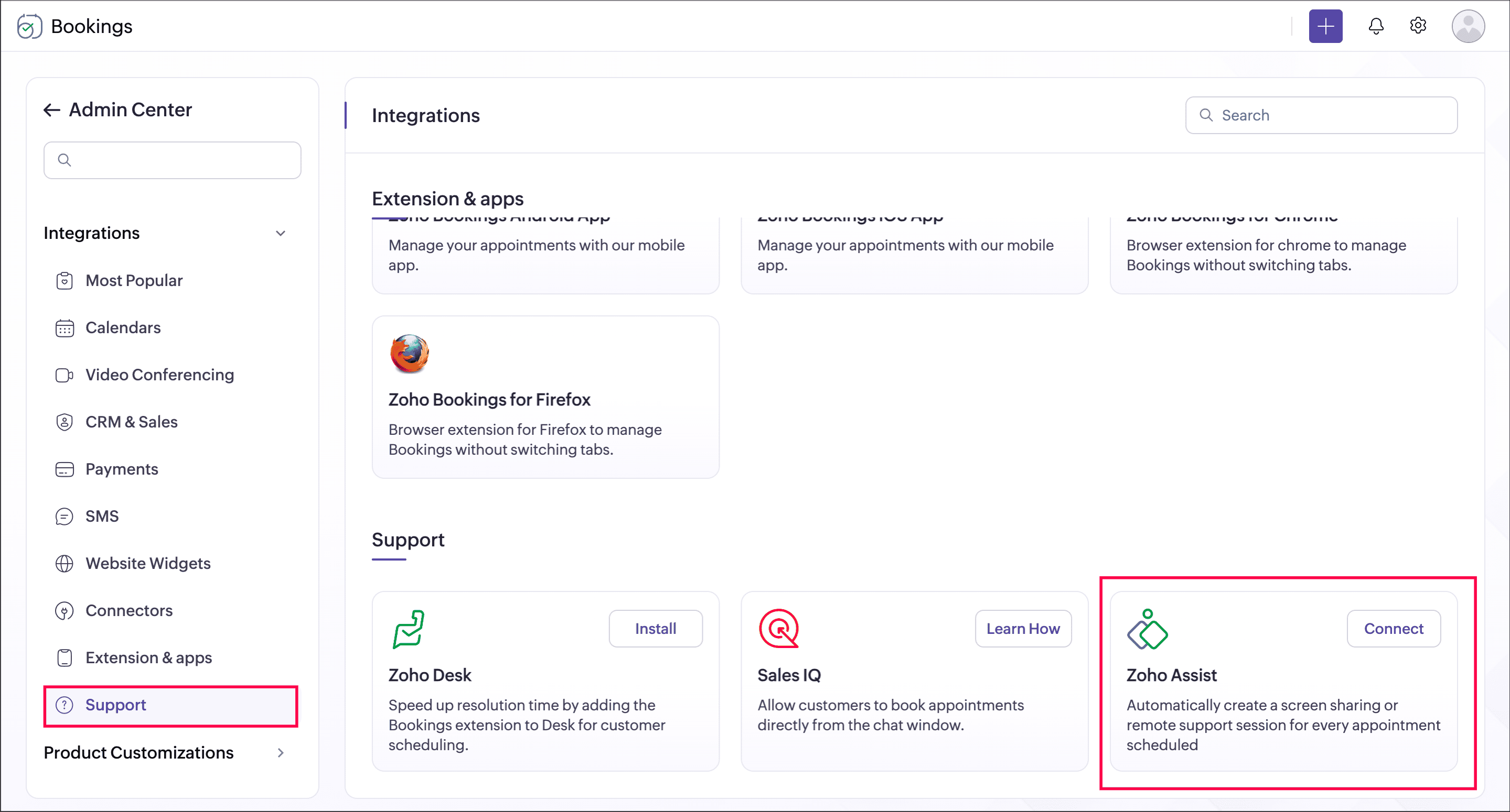 Zoho Bookings allows support, sales, and other customer-facing teams to offer remote consultations through appointments by integrating with Zoho Assist. Zoho Assist is our in-house cloud-based remote assistance software that allows IT professionals to provide technical support and manage devices remotely.