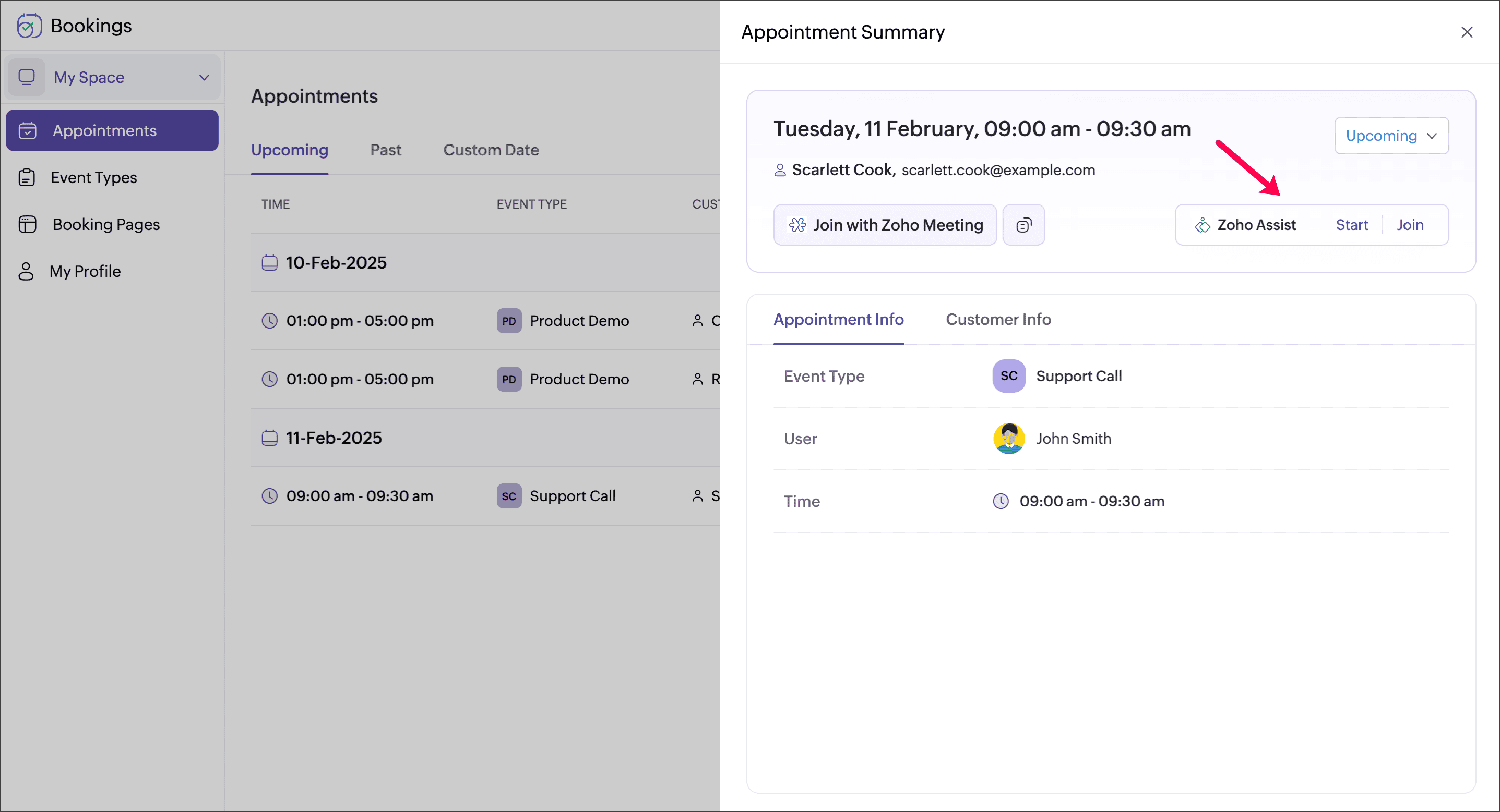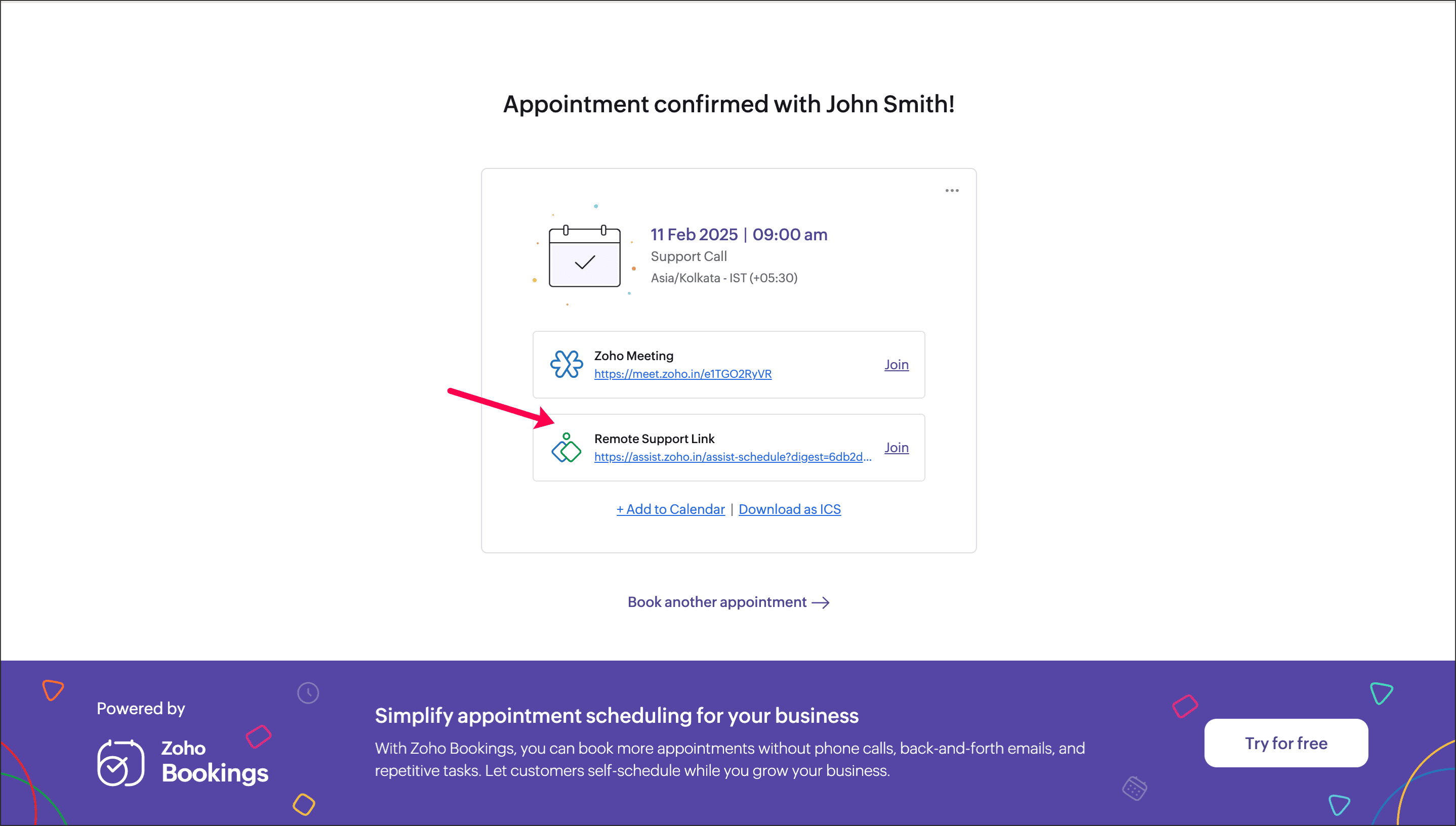After the integration, each time an appointment is booked for the selected event types, a Zoho Assist session link will be automatically generated. Bookings users can access this in the Appointment Summary and also in the email notification(if configured).