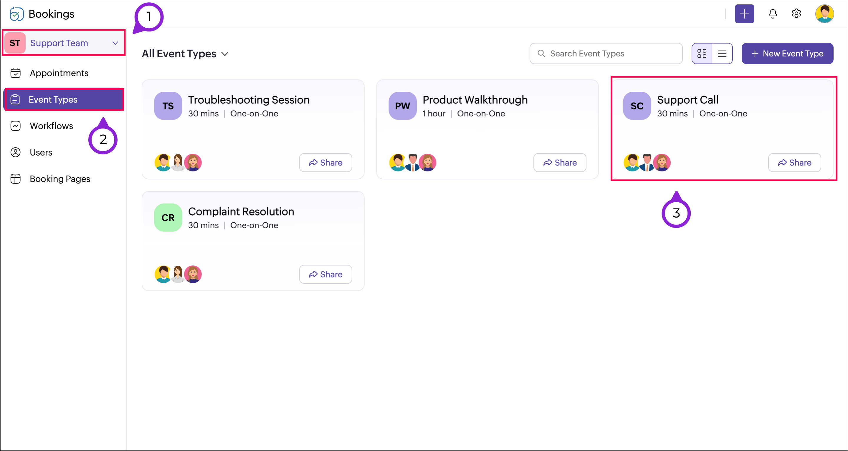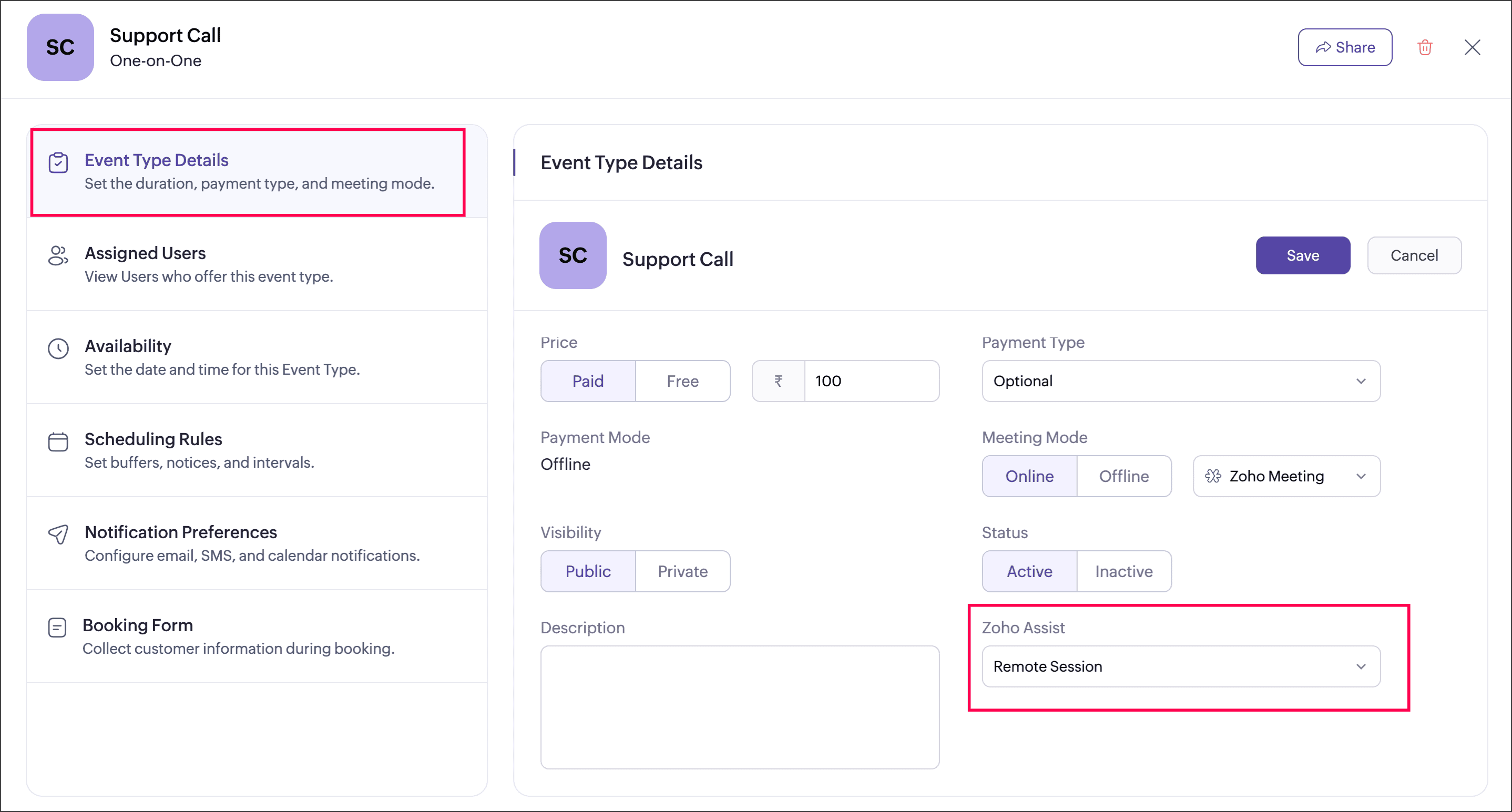 For event types that require Zoho Assist, you need to select the Zoho Assist session type.