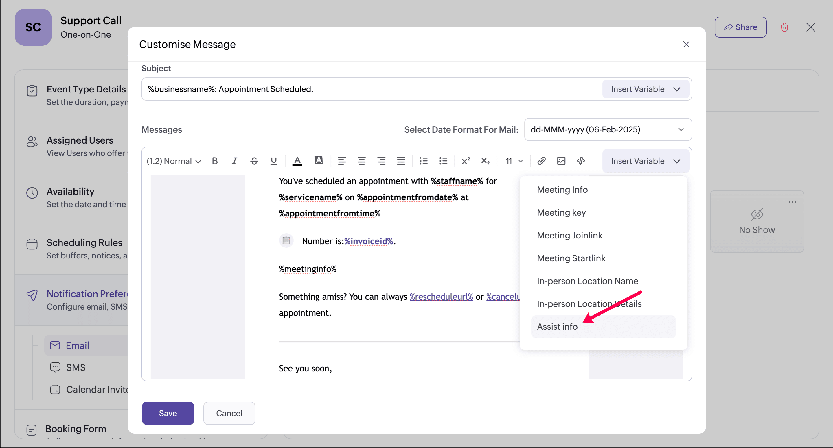 Session link can also be added to the email or sms notifications that are sent to users and customers. You can add the session link by clicking the Insert Variables > Assist Info in the message editor.