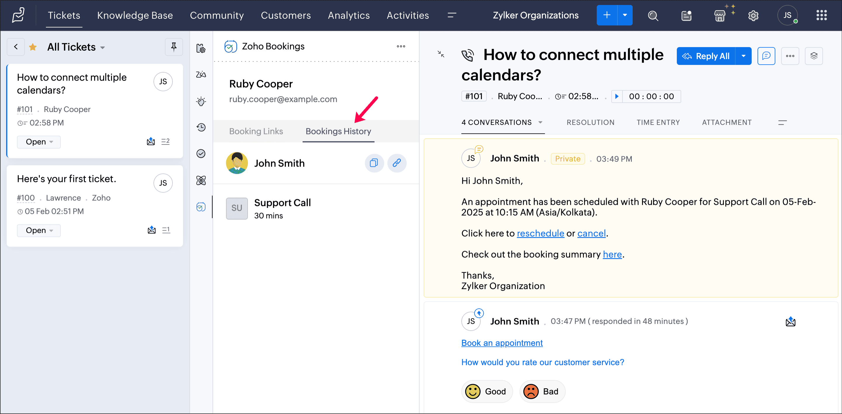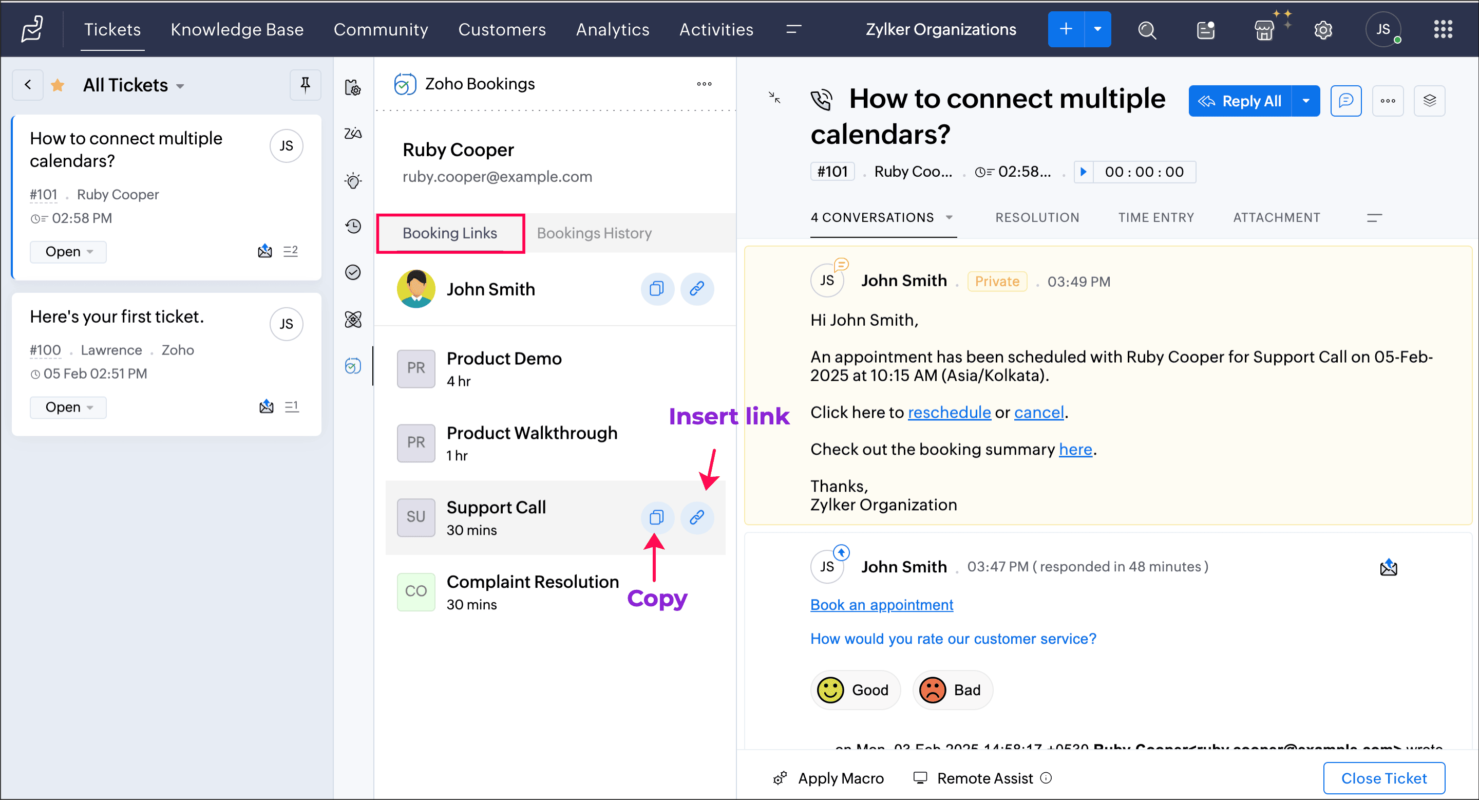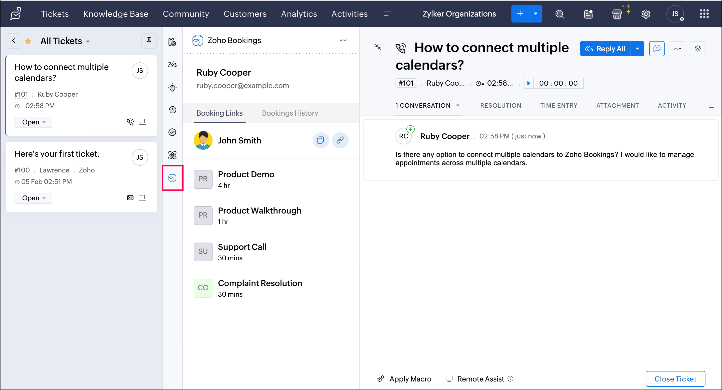 By using the Zoho Bookings extension, a support agent can share their booking links, view and schedule appointments right from Zoho Desk.
