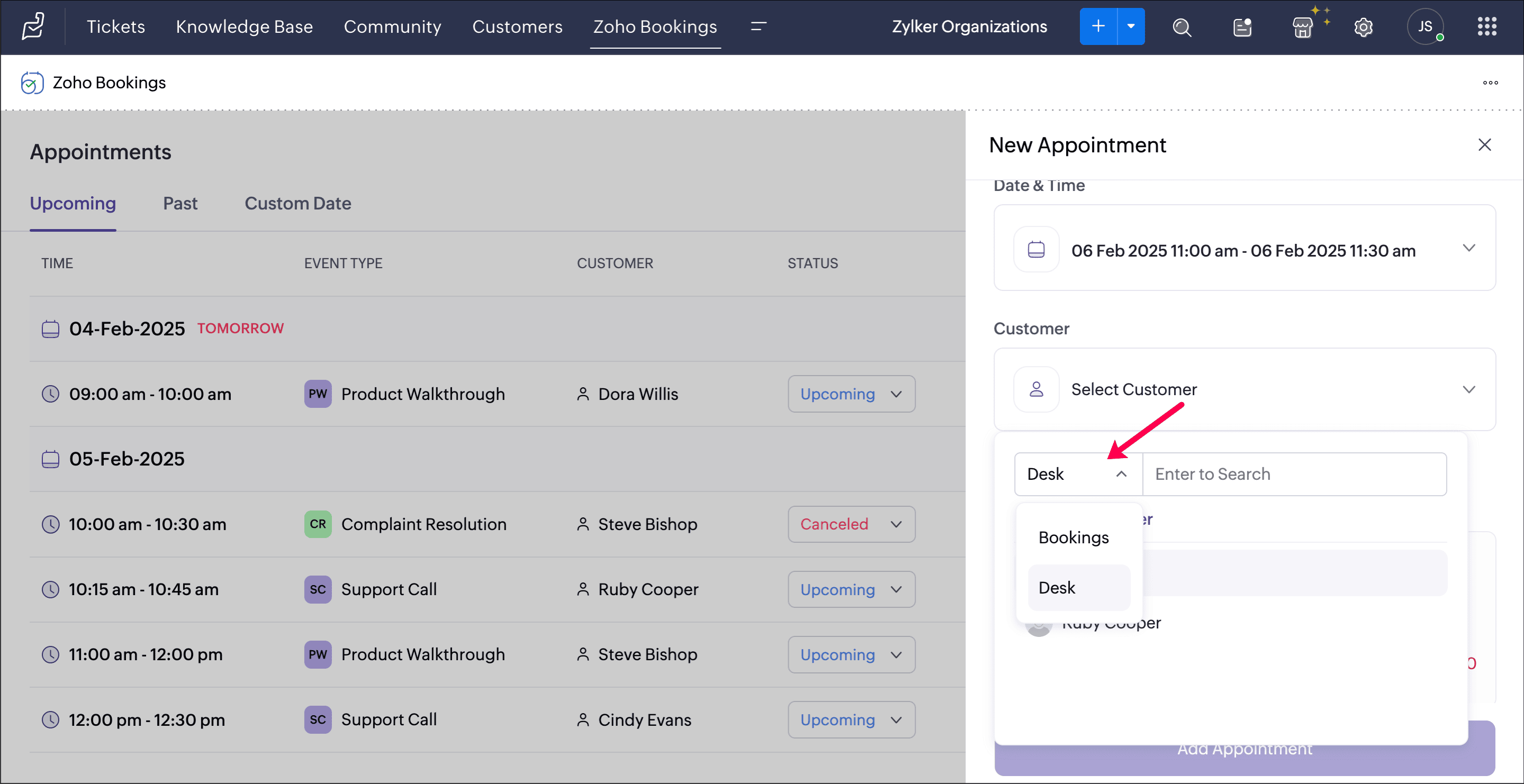 While adding appointments, you can choose Desk/Bookings customer and add accordingly.