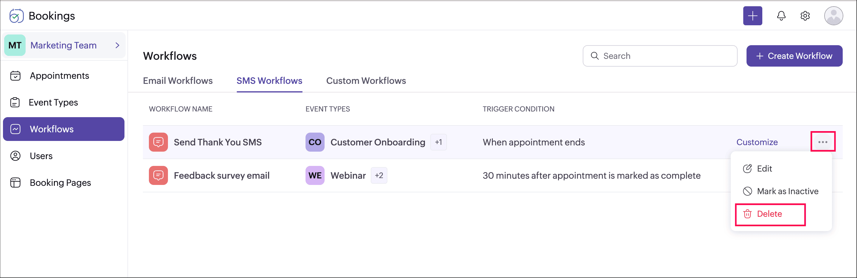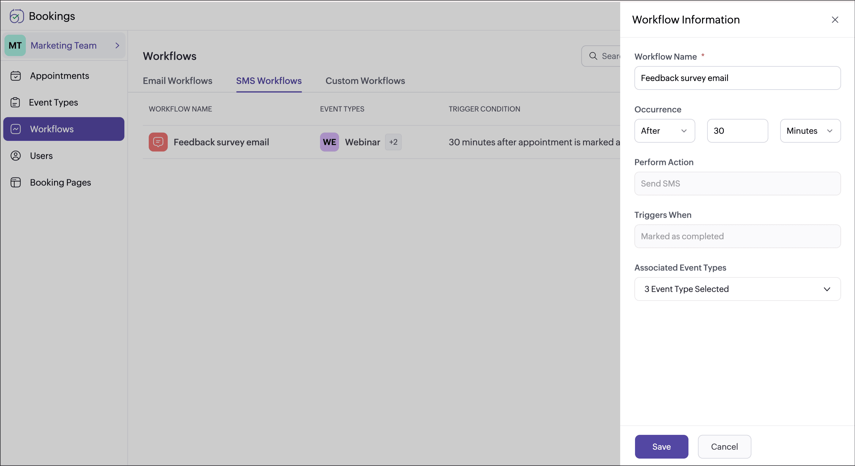 Workflows help to automate tasks such as sending notifications (email and SMS) and executing custom functions for various instances of an appointment. These workflows can also be triggered immediately, before, and after a specific duration of those events.