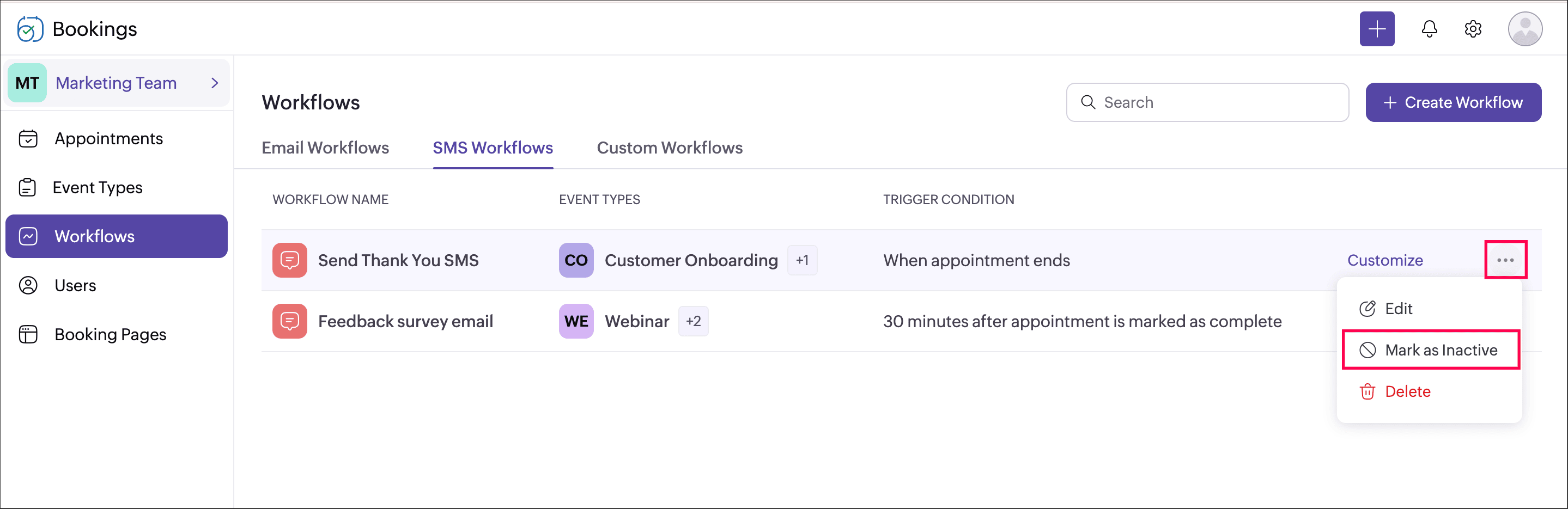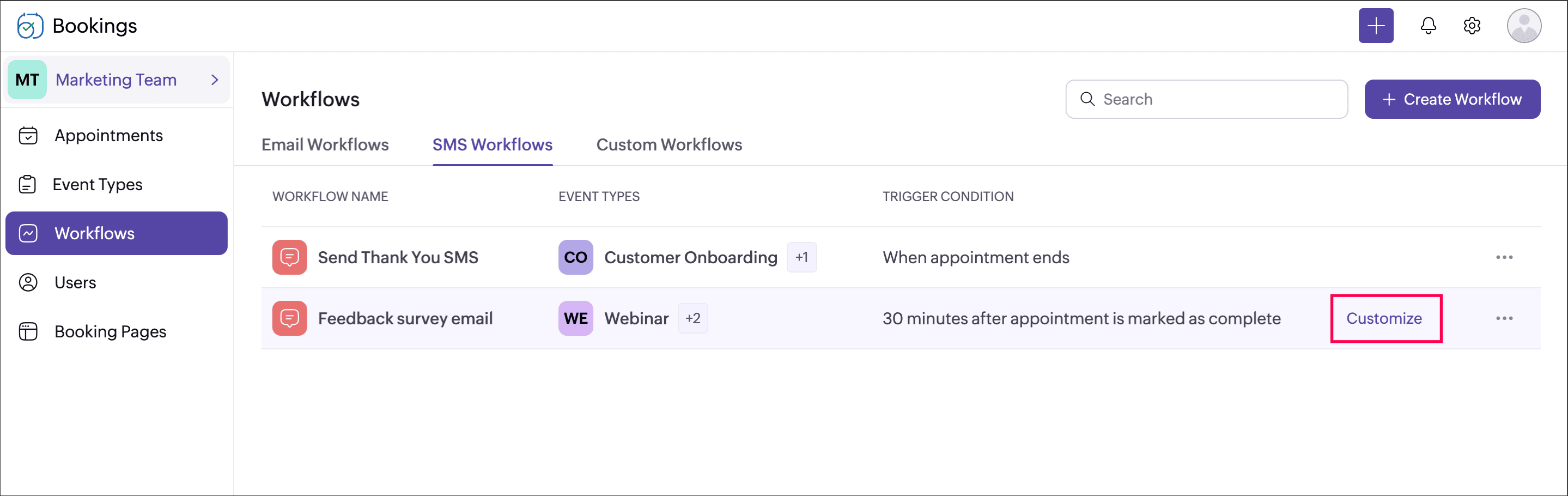 - Navigate to Workflows on the left sidebar, hover over the required workflow, and then click the Customize option.