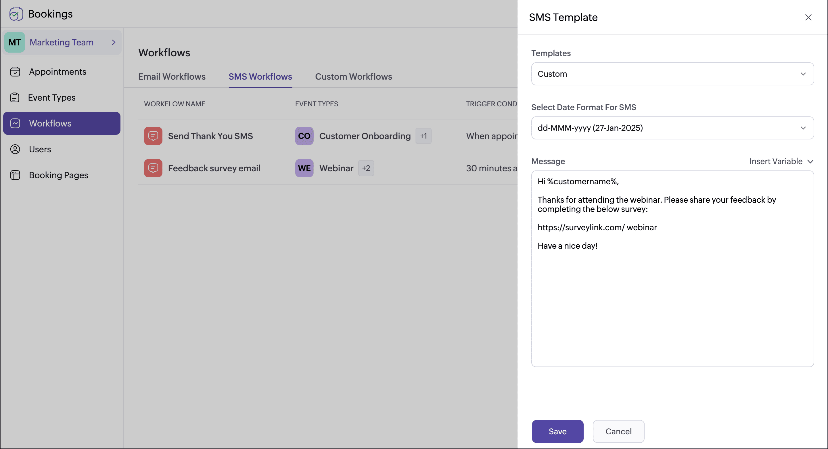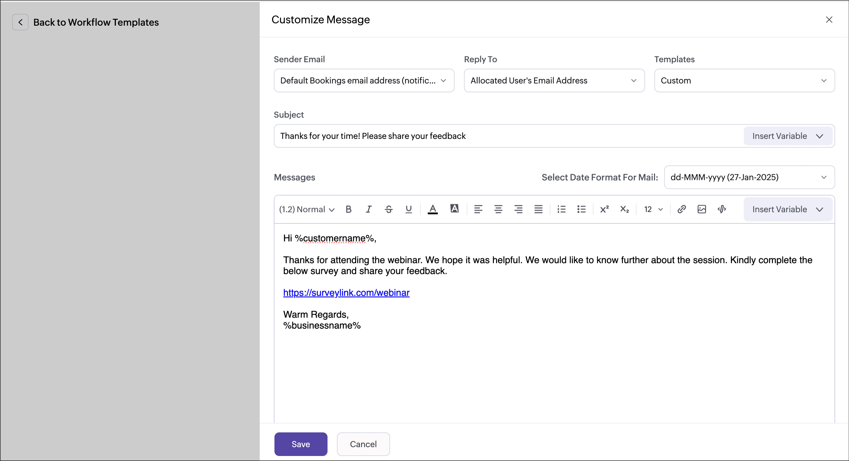 Info: You can add variables to your message content for email and sms by using the Insert Variable option to make it dynamic.6. Manage workflow